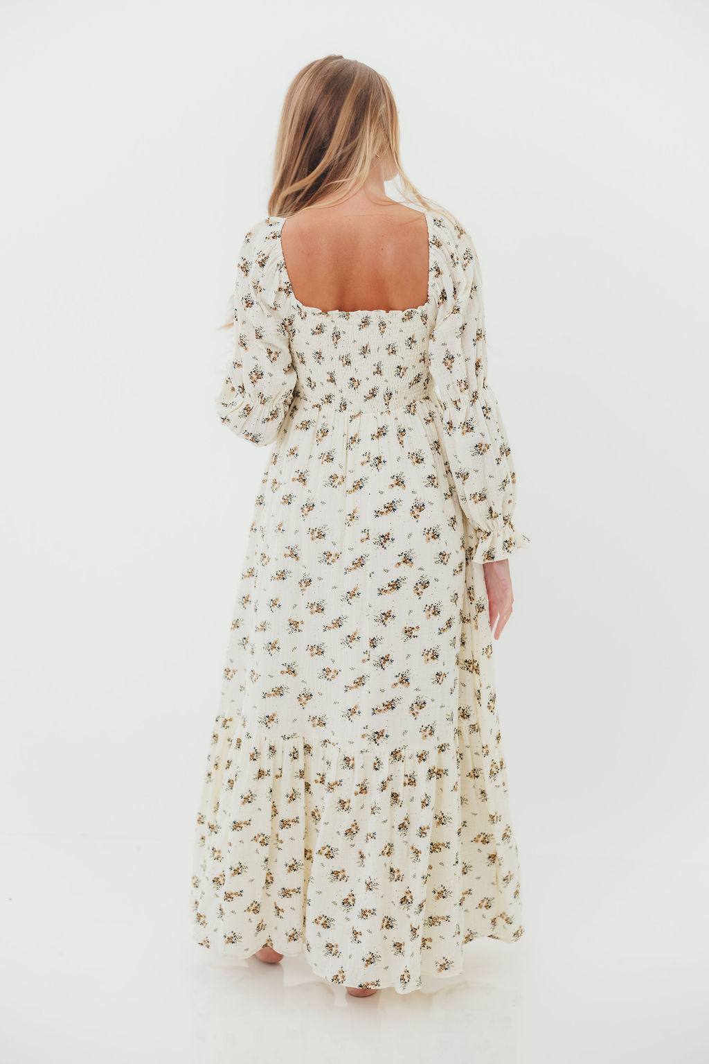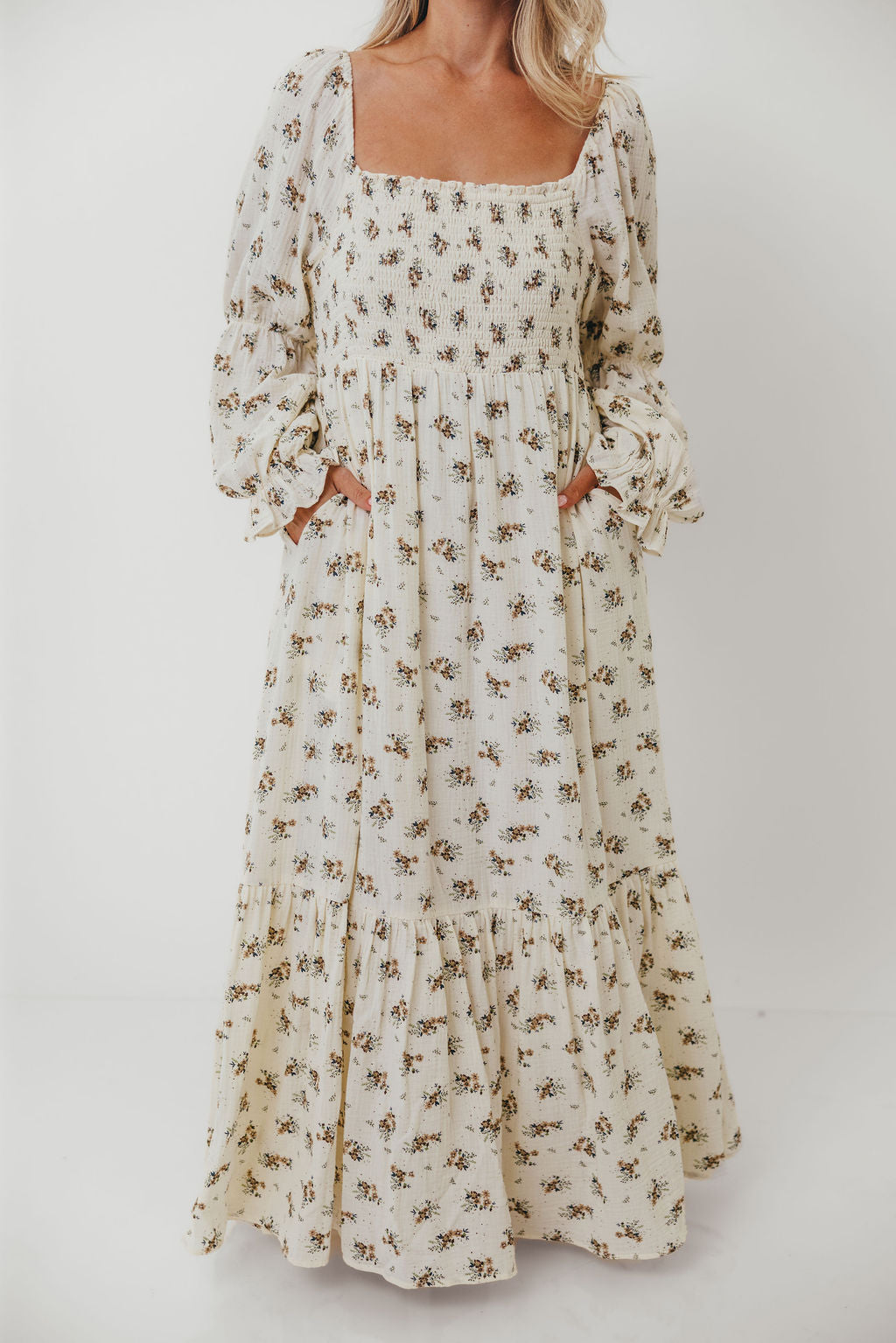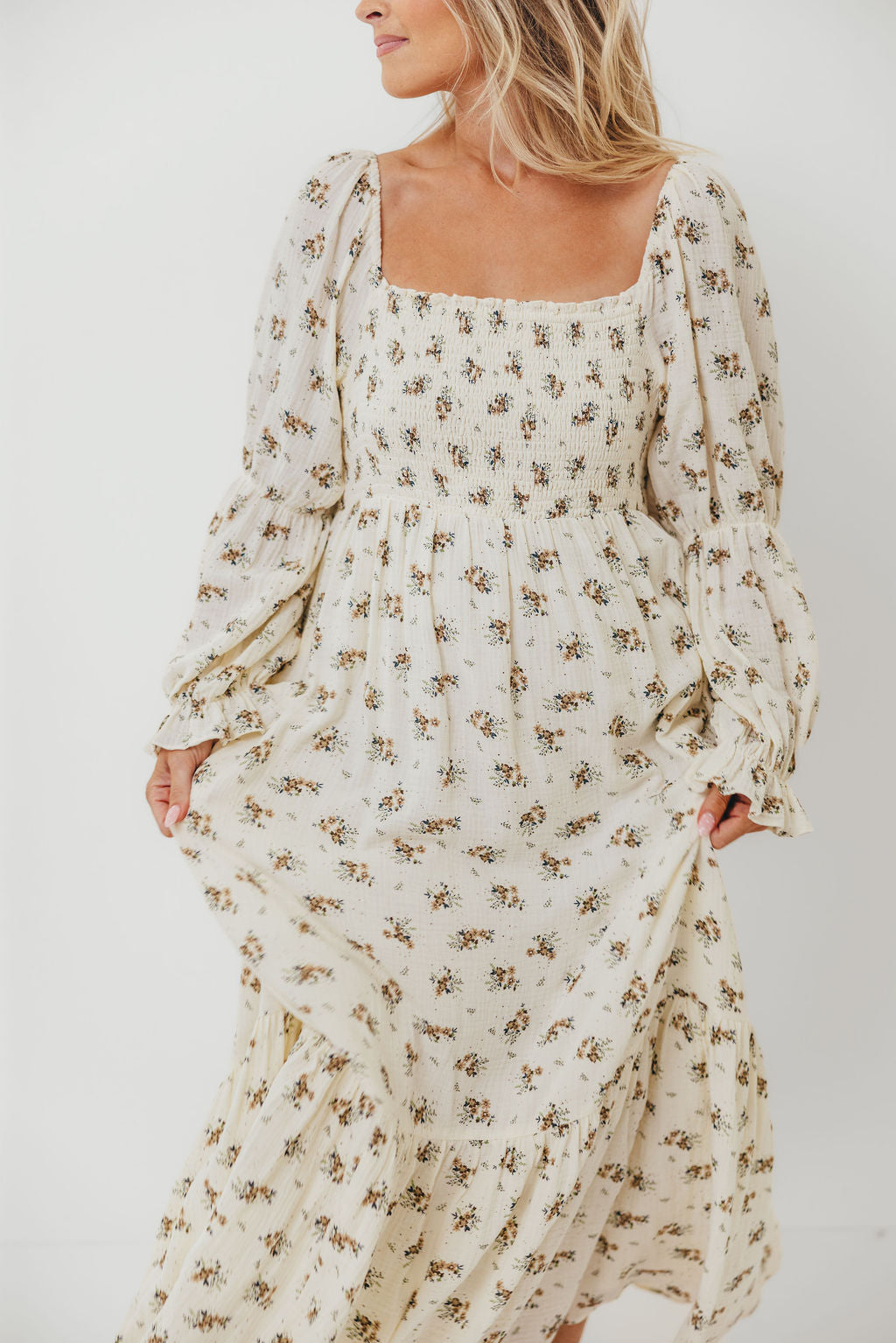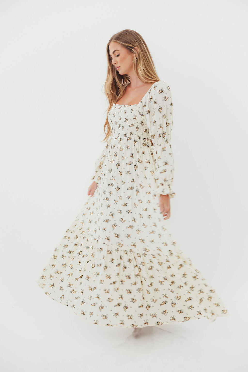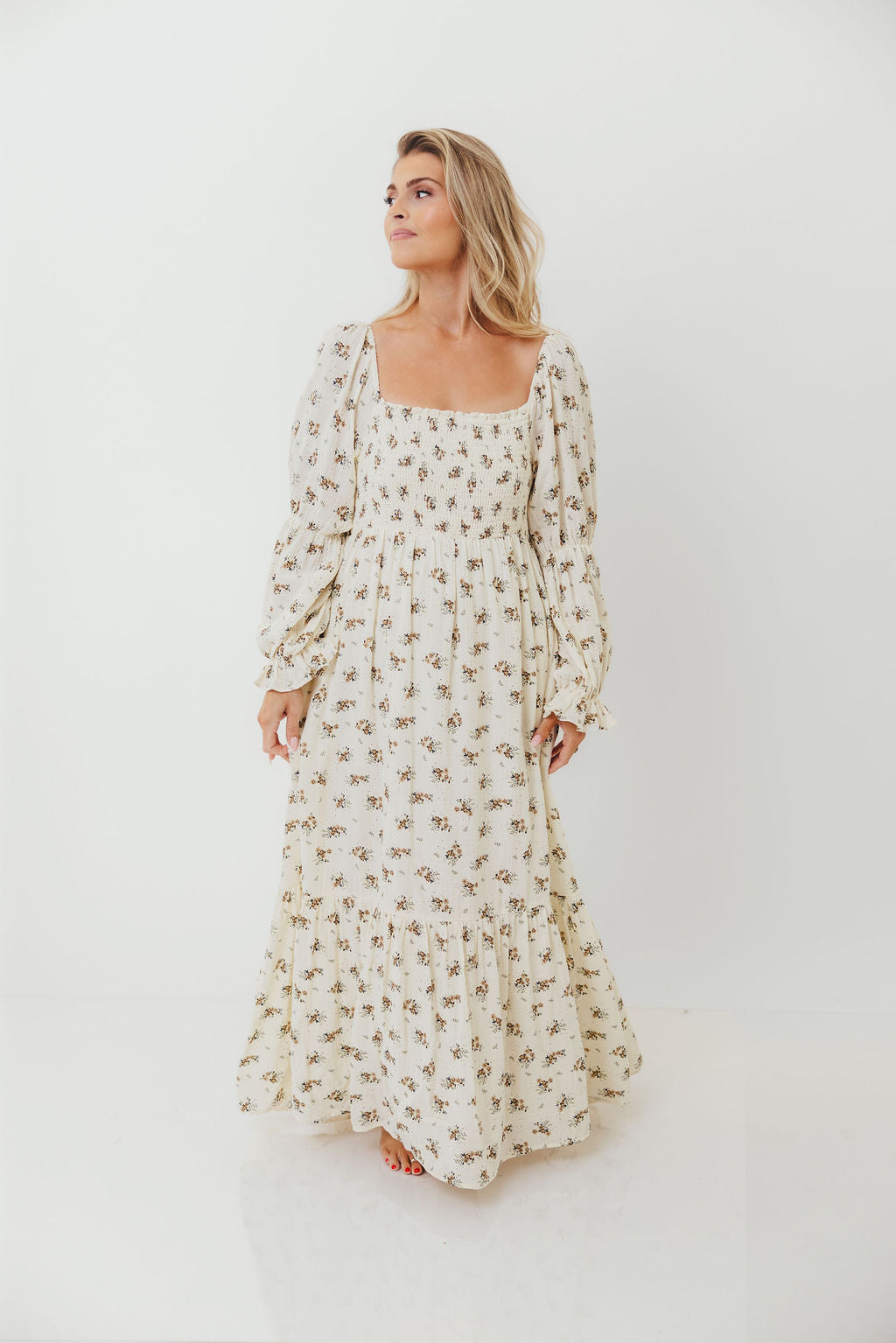 GARMENT DETAILS: Full-skirted maxi dress in delicate floral print with square neckline, long tiered sleeves, and a stretchy, smocked bodice. Finished with ruffle accents. Skirt is lined.
