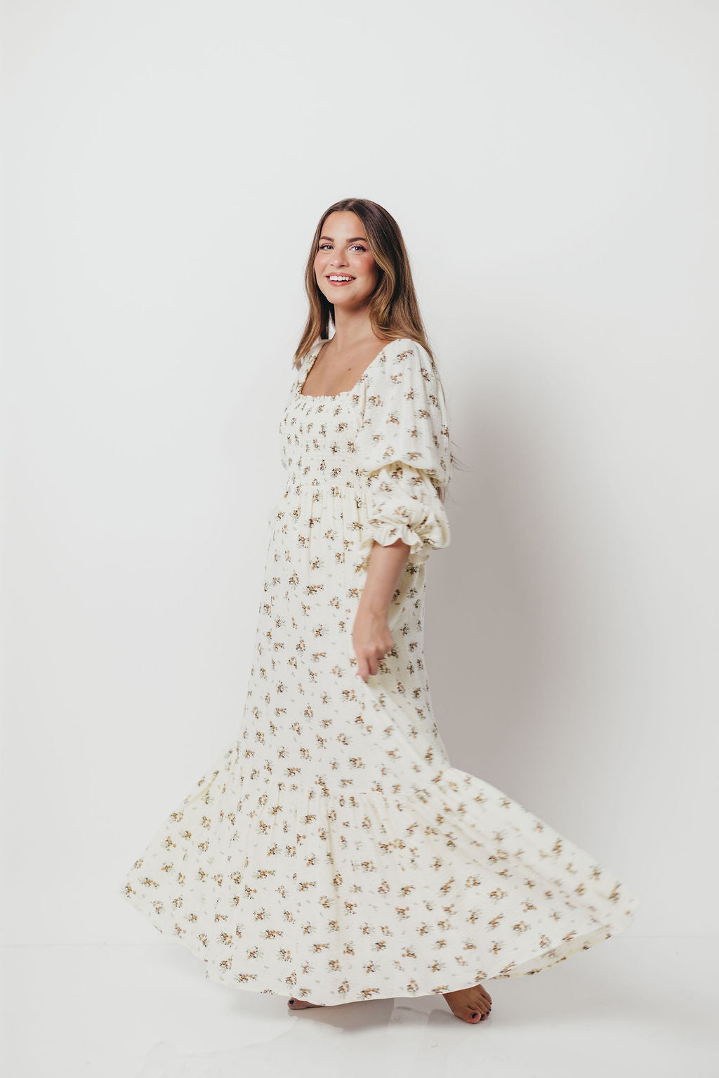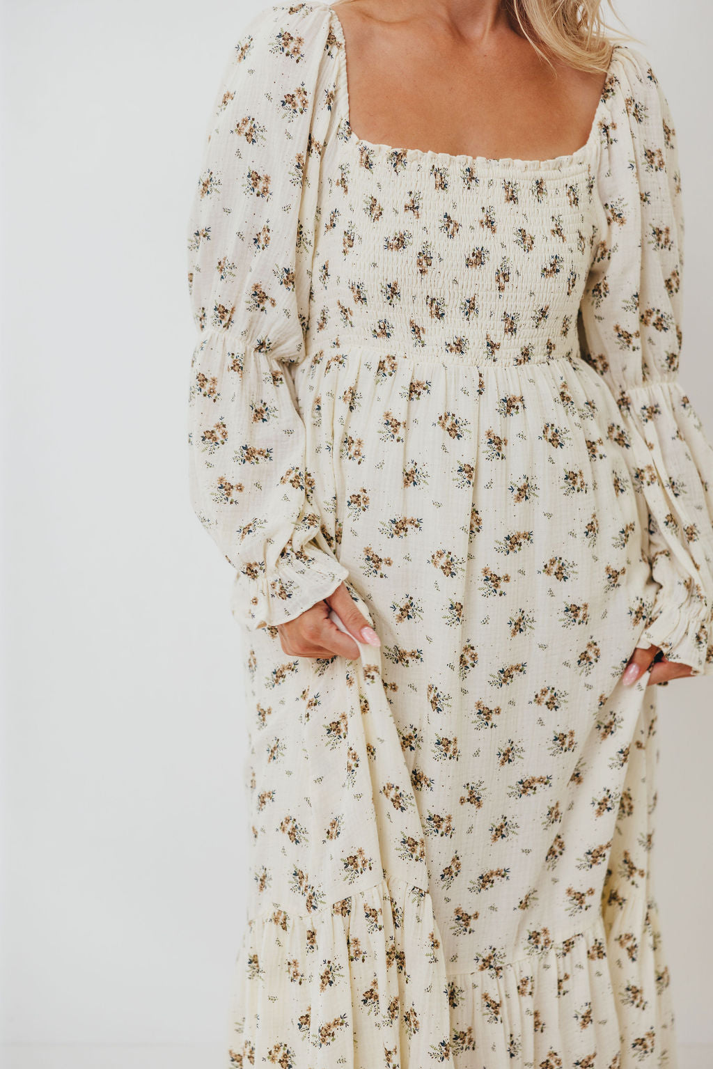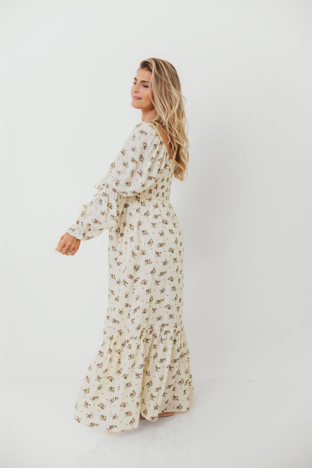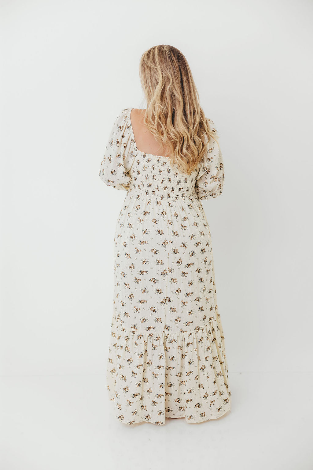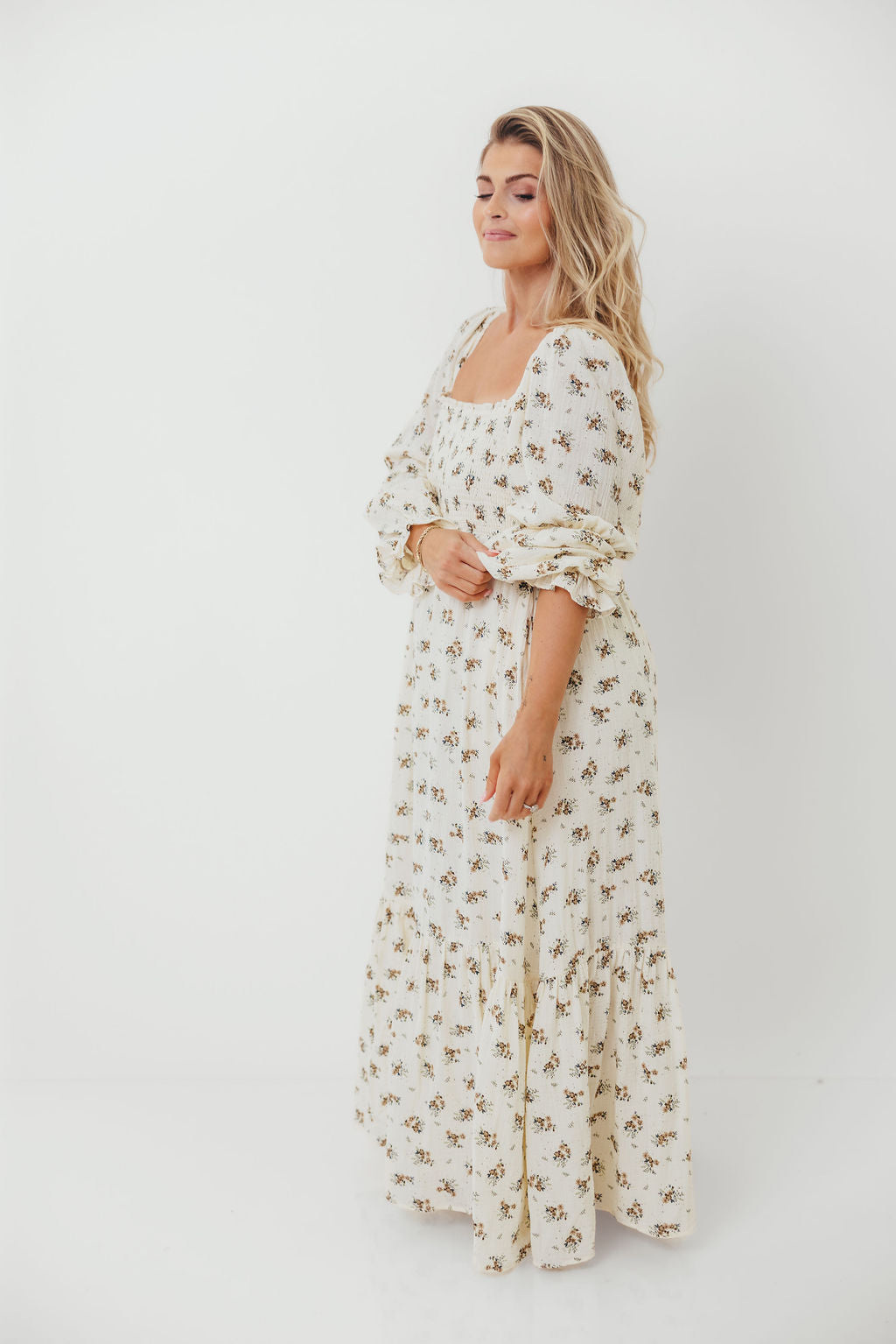 GARMENT DETAILS: Full-skirted maxi dress in delicate floral print with square neckline, long tiered sleeves, and a stretchy, smocked bodice. Finished with ruffle accents. Skirt is lined.
