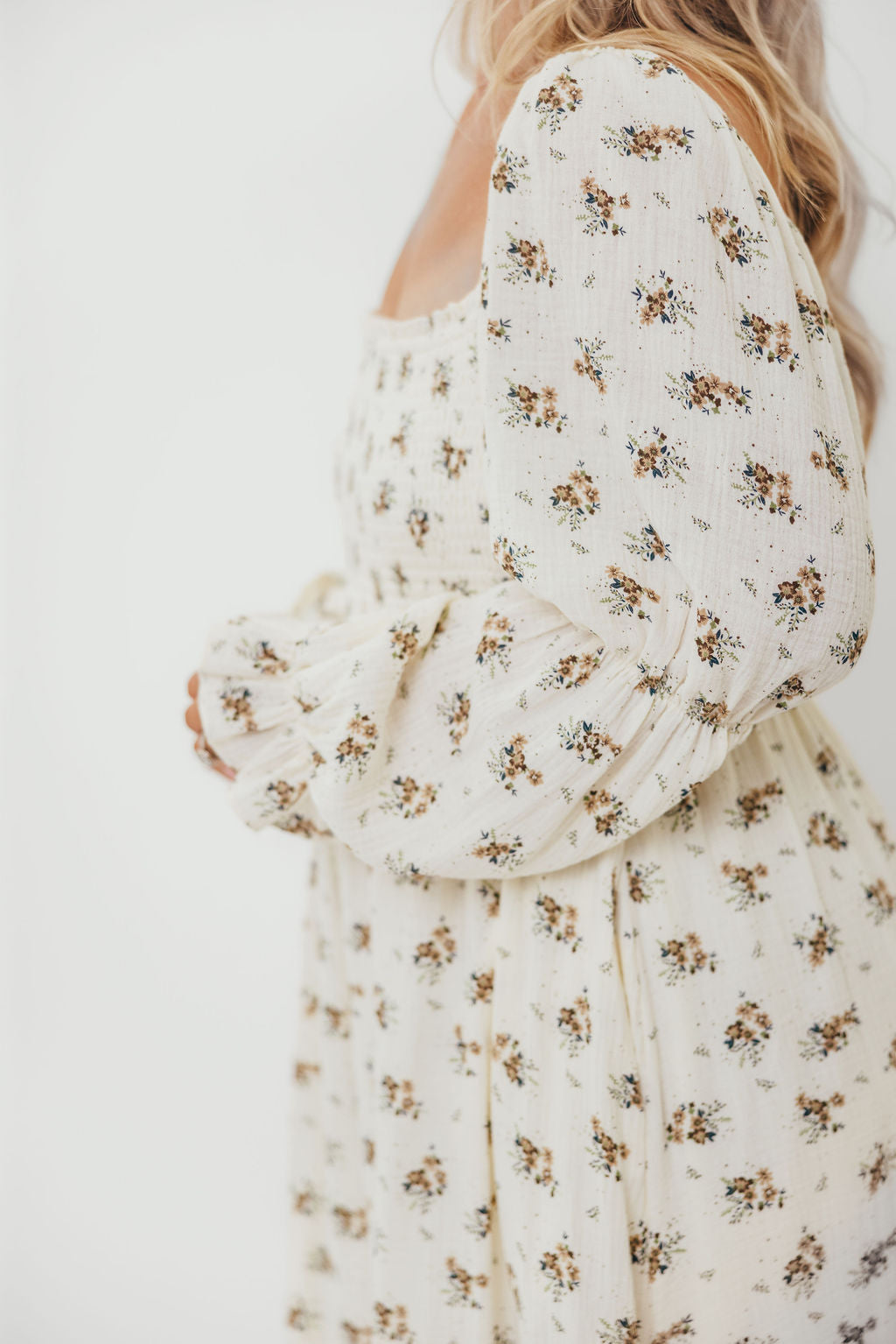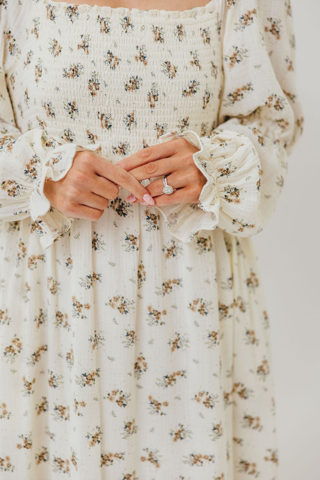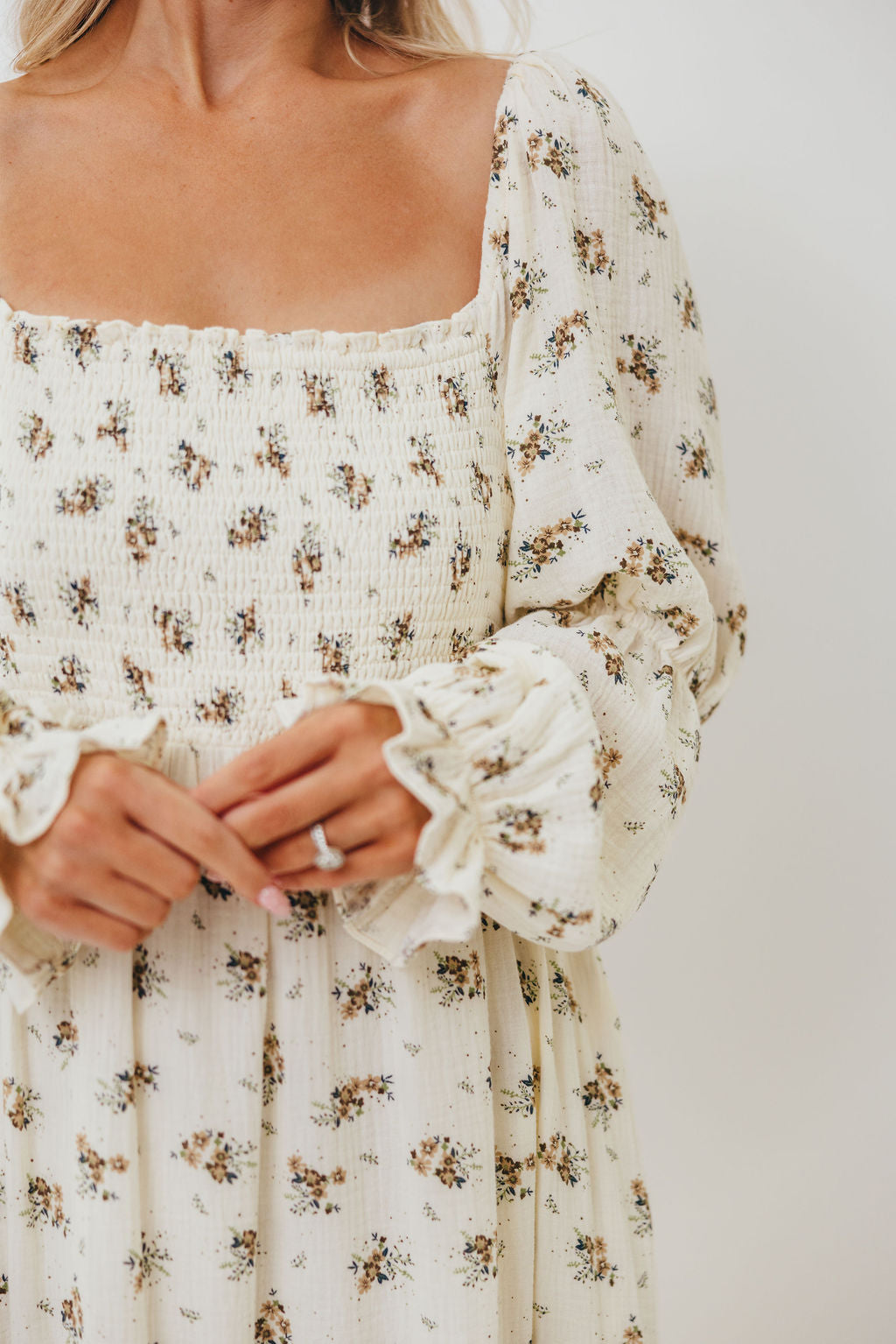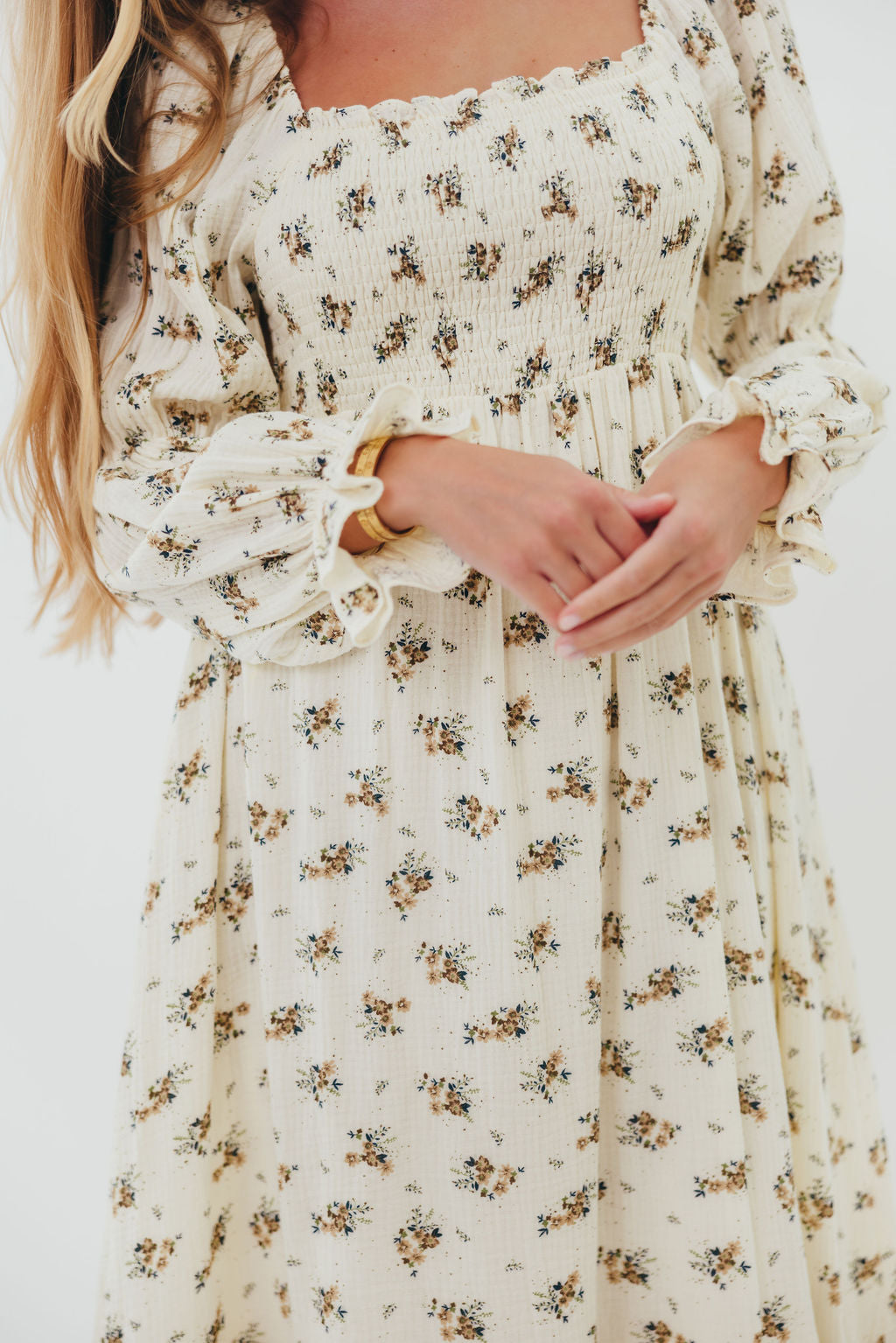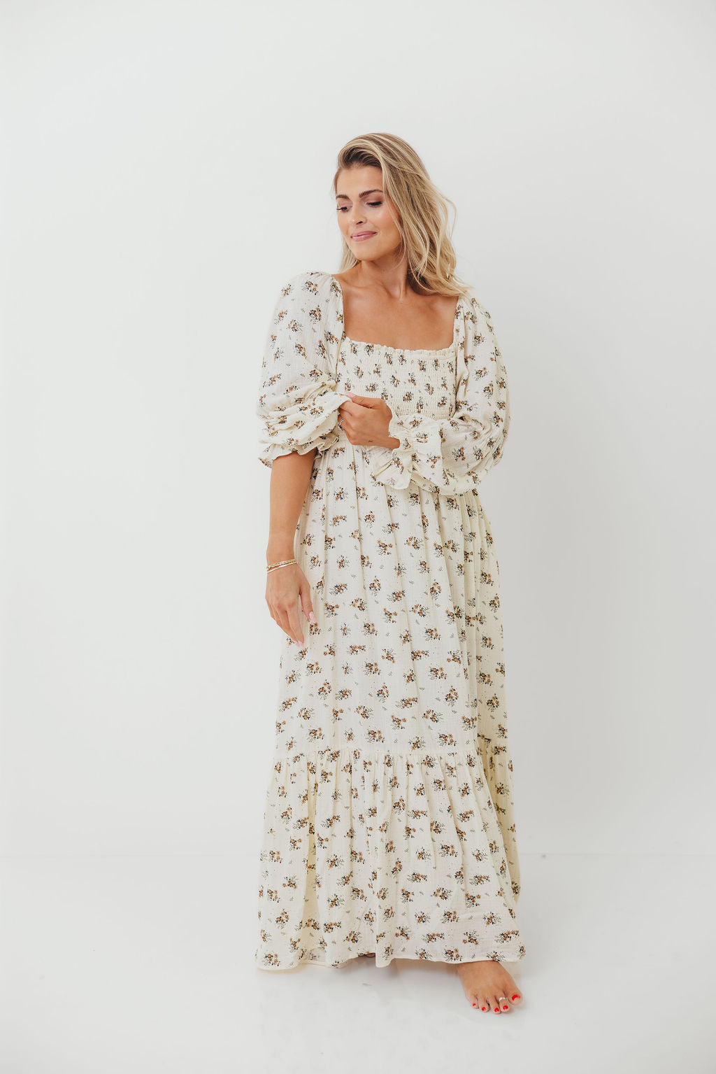 GARMENT DETAILS: Full-skirted maxi dress in delicate floral print with square neckline, long tiered sleeves, and a stretchy, smocked bodice. Finished with ruffle accents. Skirt is lined.