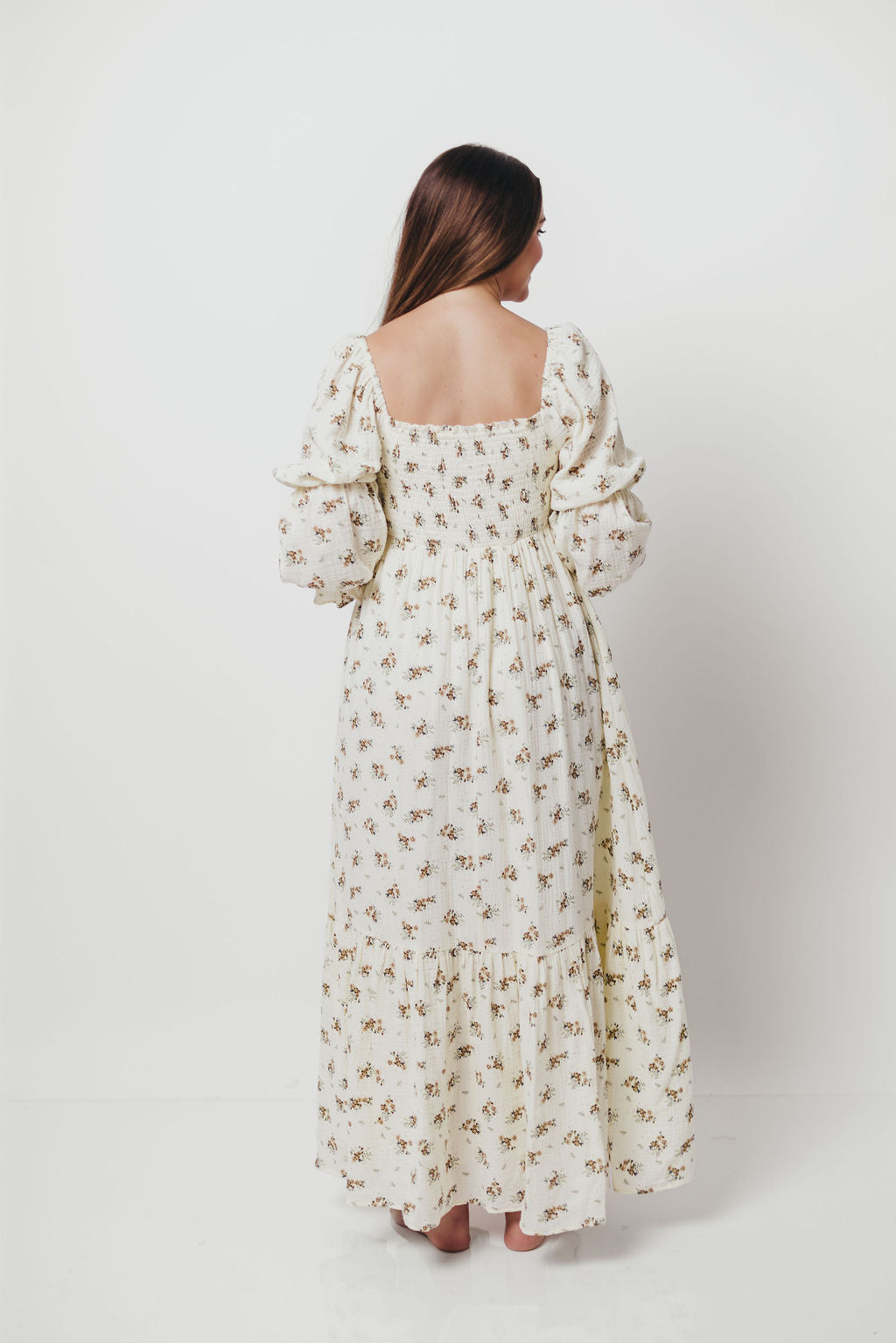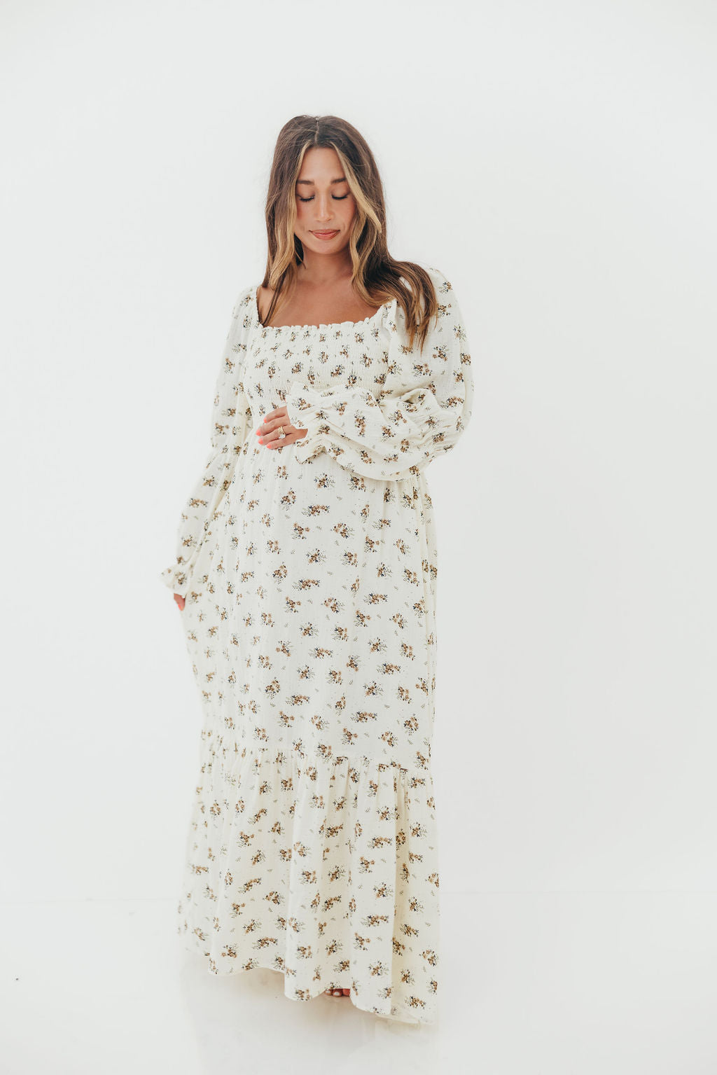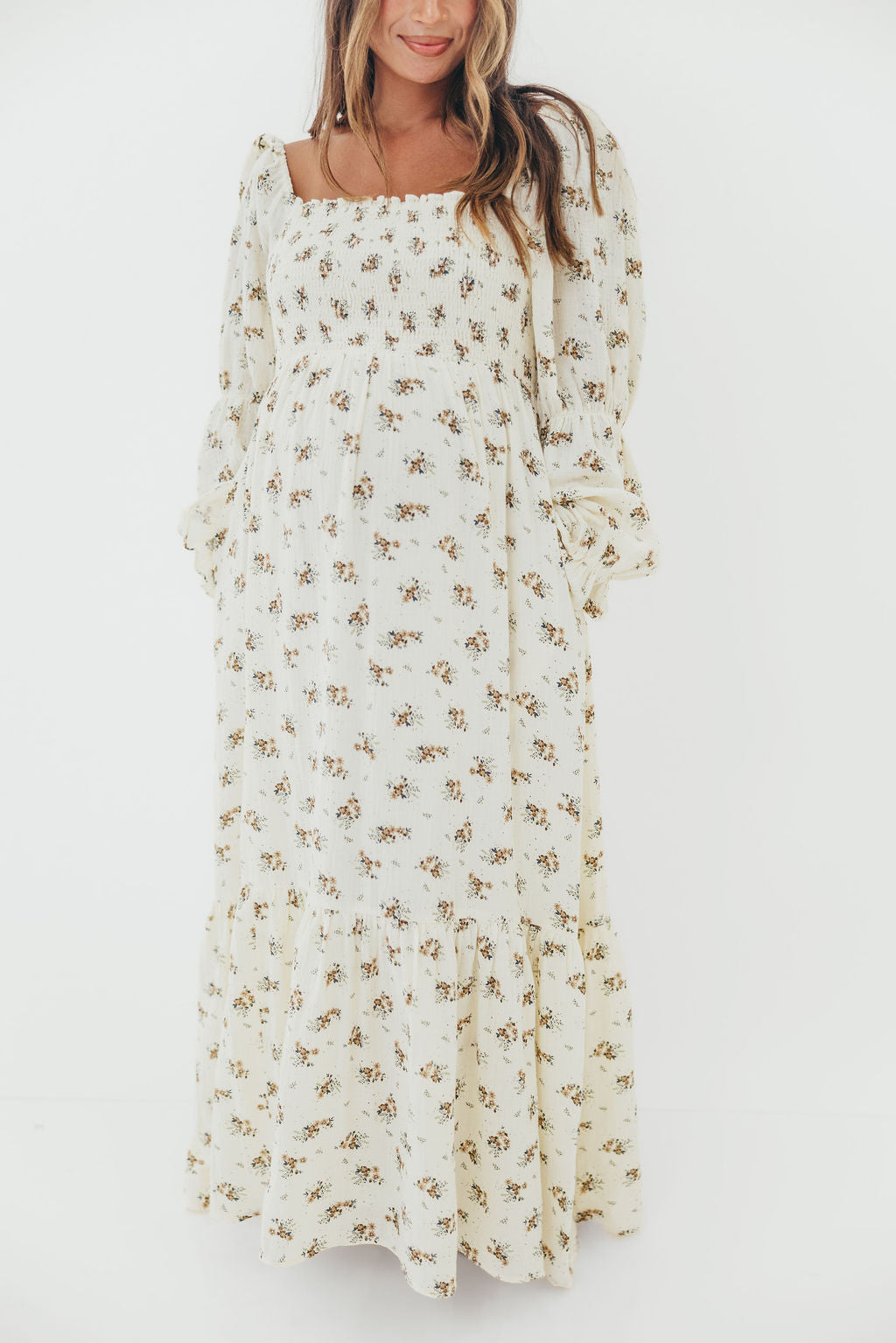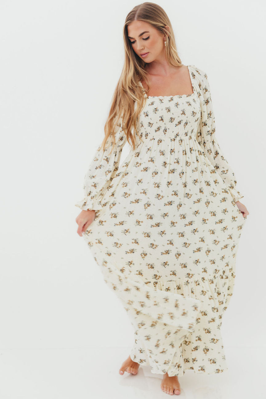 Emerson 100% Cotton Smocked Maxi Dress with Long Sleeves in Off White - Bump Friendly