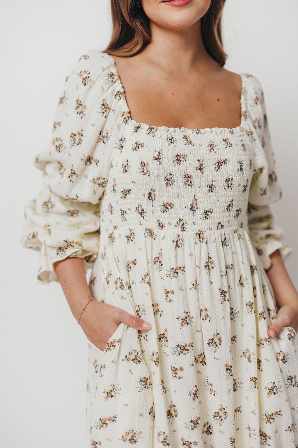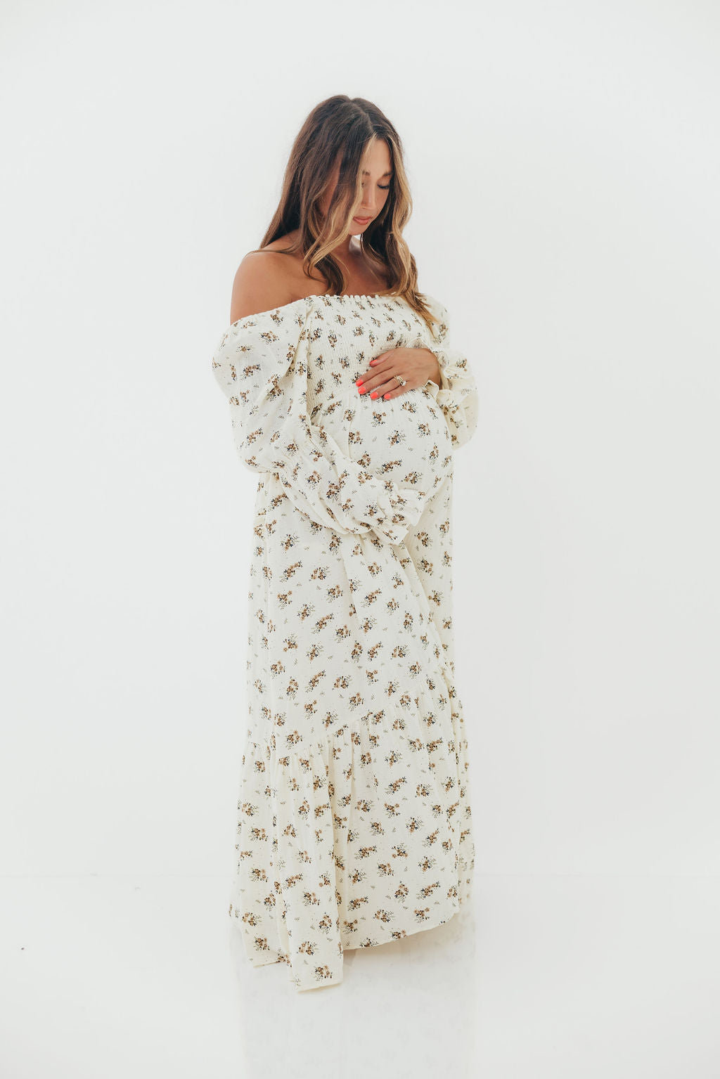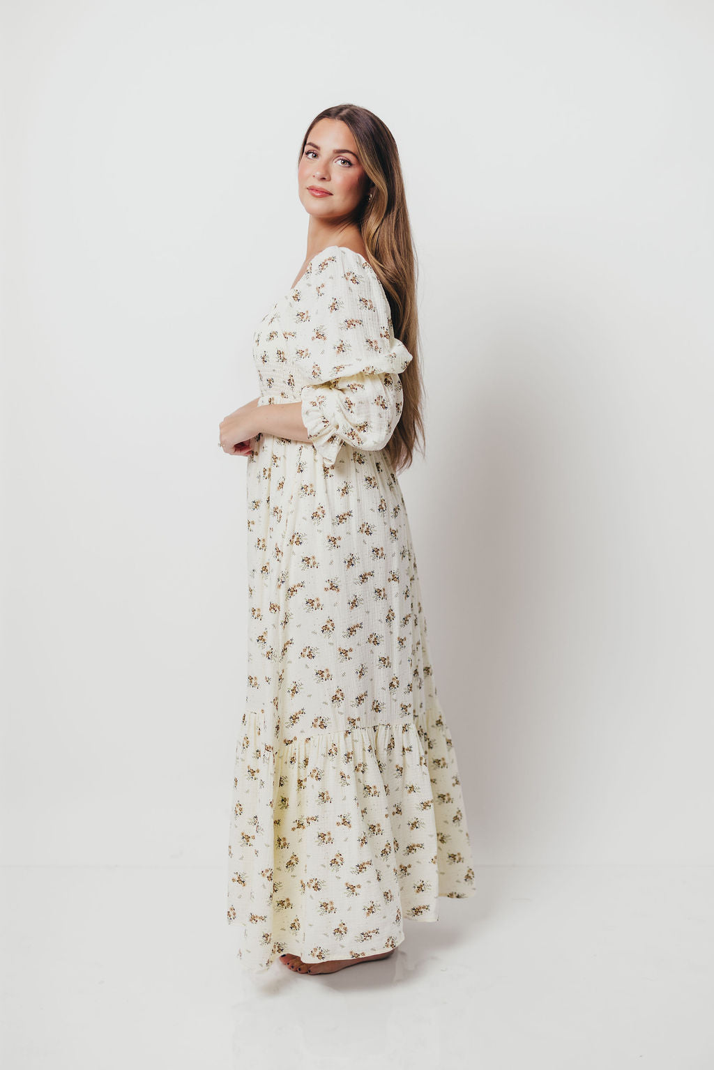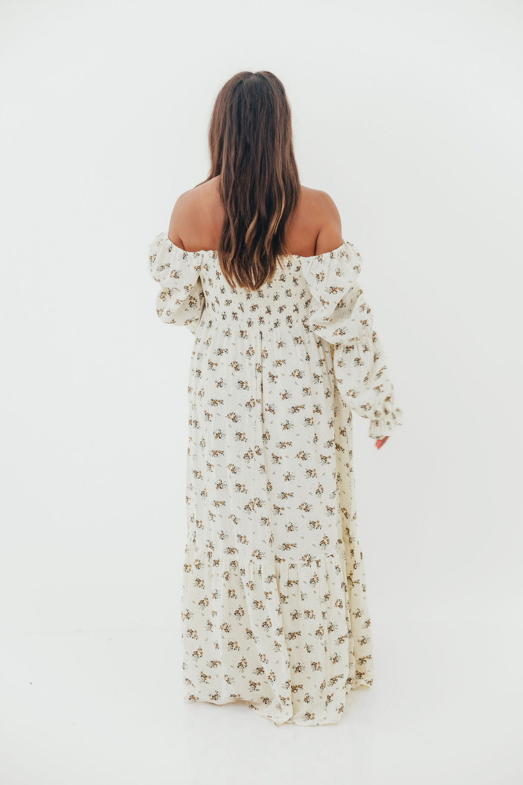 Emerson 100% Cotton Smocked Maxi Dress with Long Sleeves in Off White - Bump Friendly