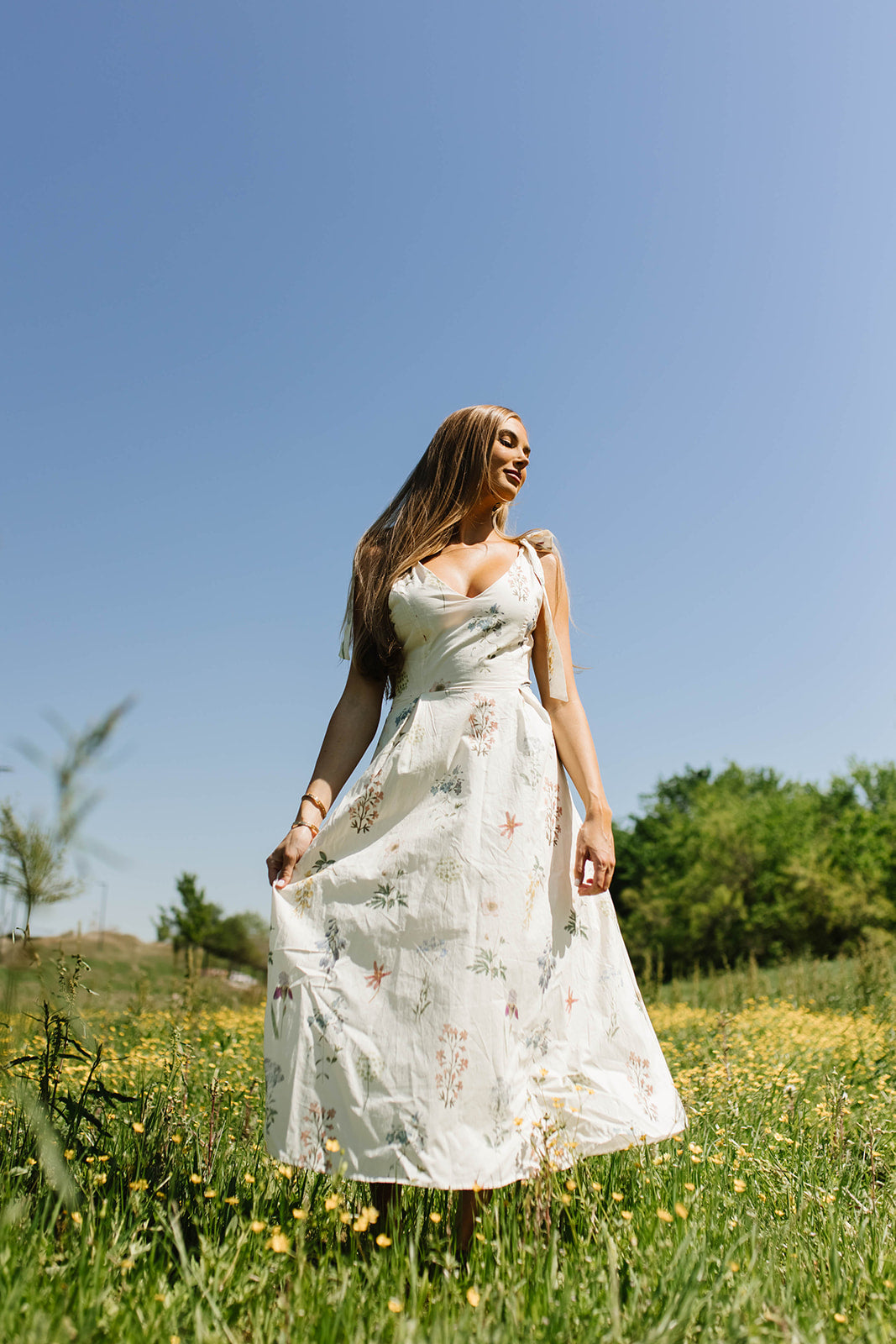 GARMENT DETAILS: Elegant floral-print midi dress with plunging V-neckline, shoulder bow tie straps, and flowy skirt. Fully lined.