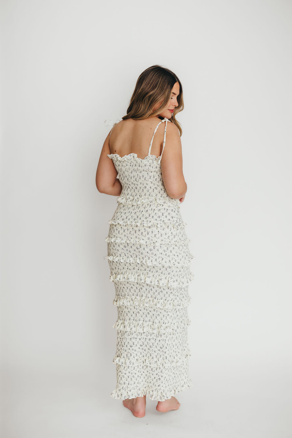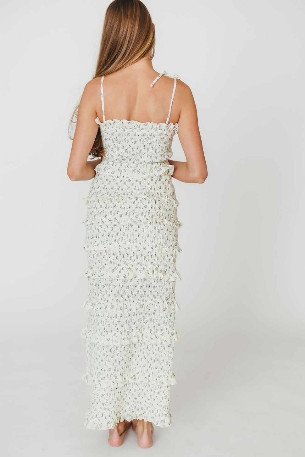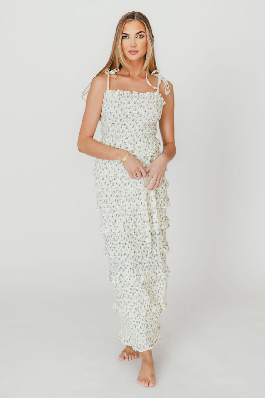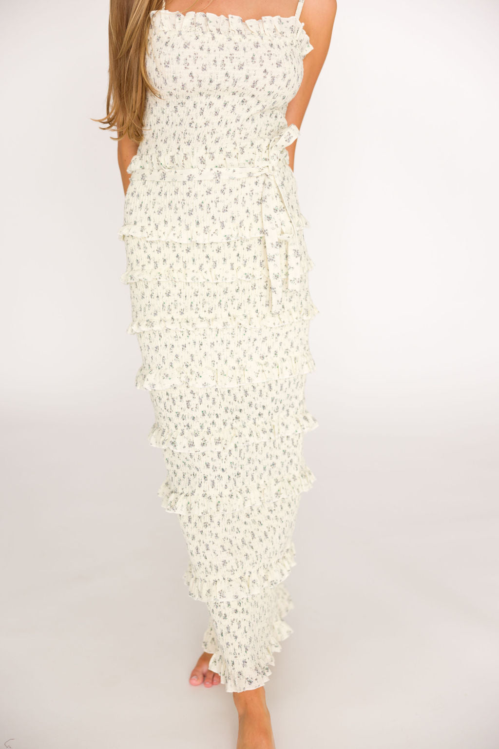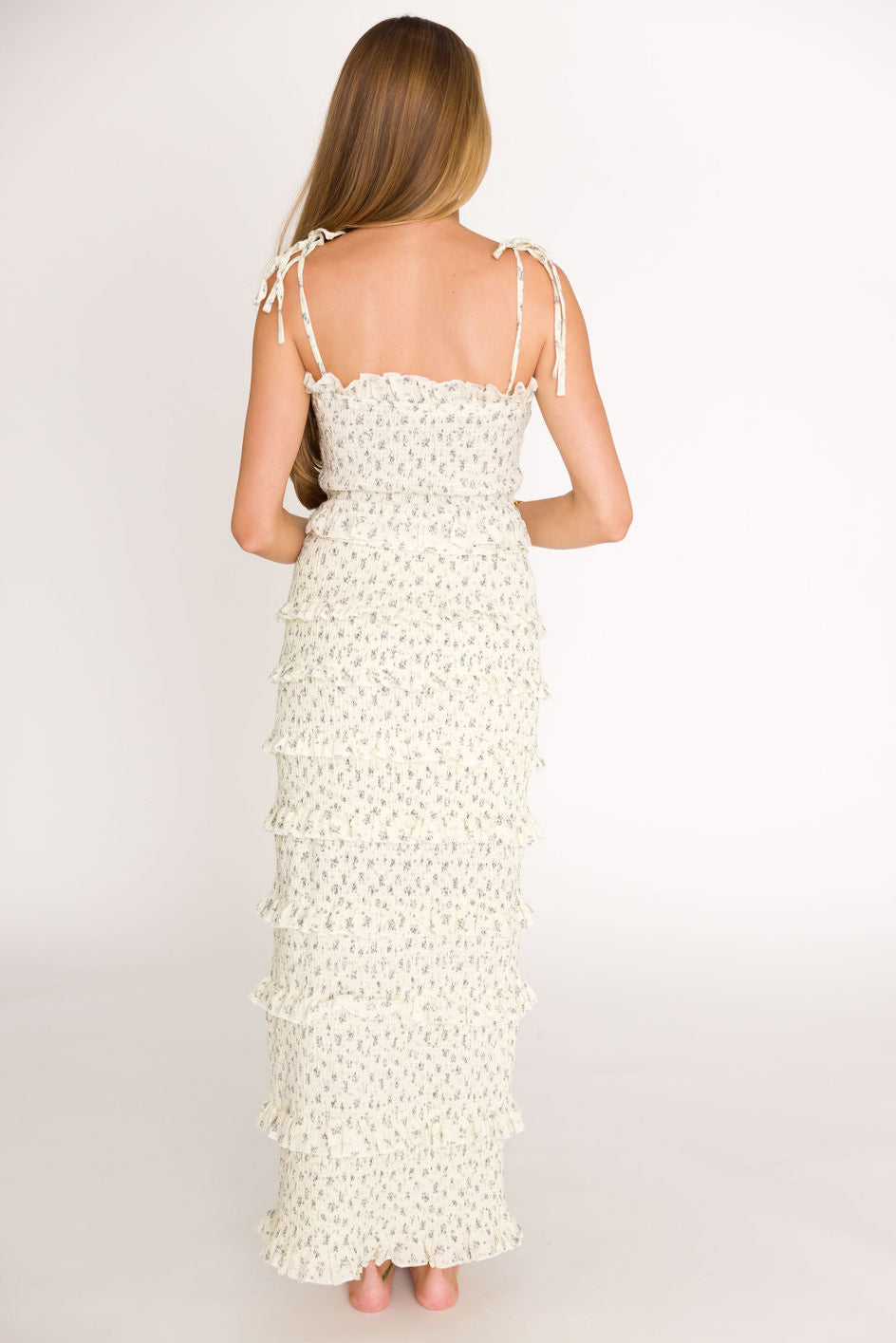 GARMENT DETAILS: Smocked 100% cotton maxi dress with square neckline, adjustable tie shoulder straps, and a fitted, sheath-style silhouette. Features a multi-tiered skirt with ruffle accents and a front tie detail. Lined.