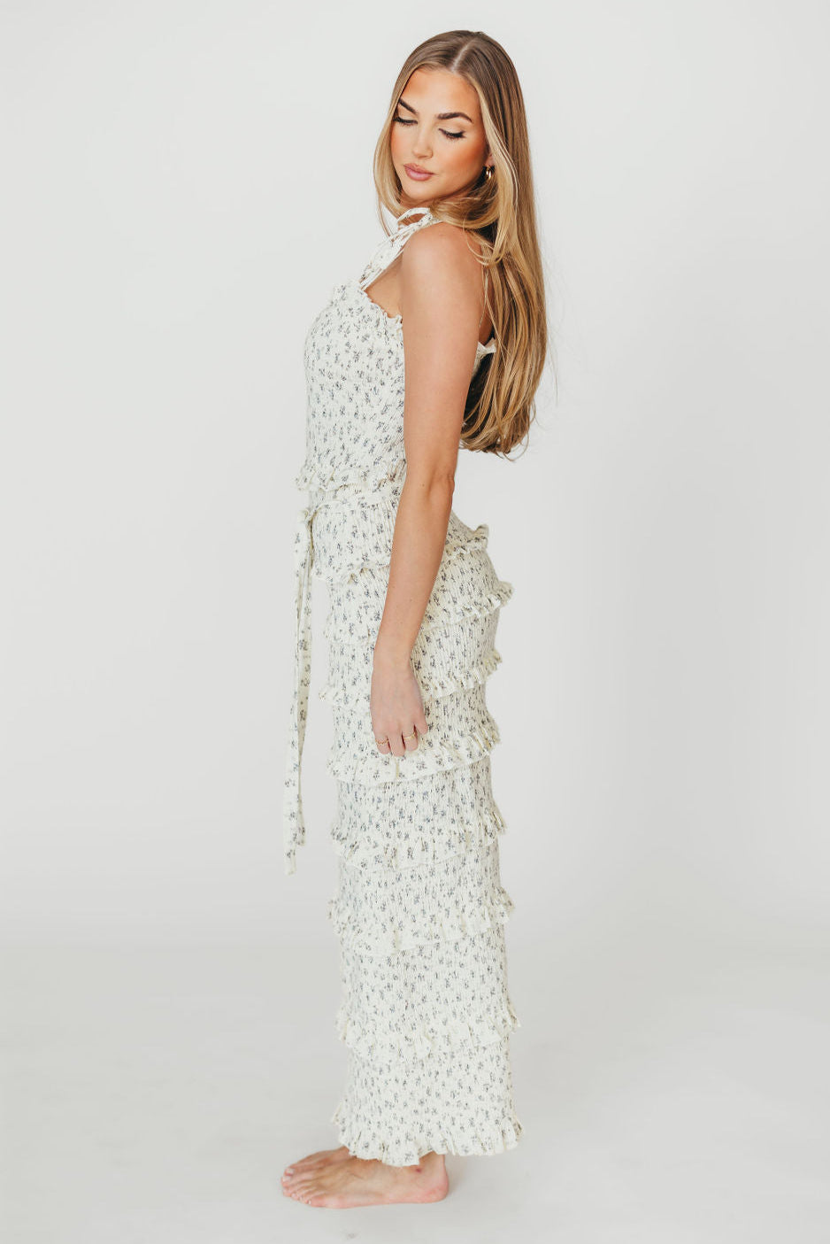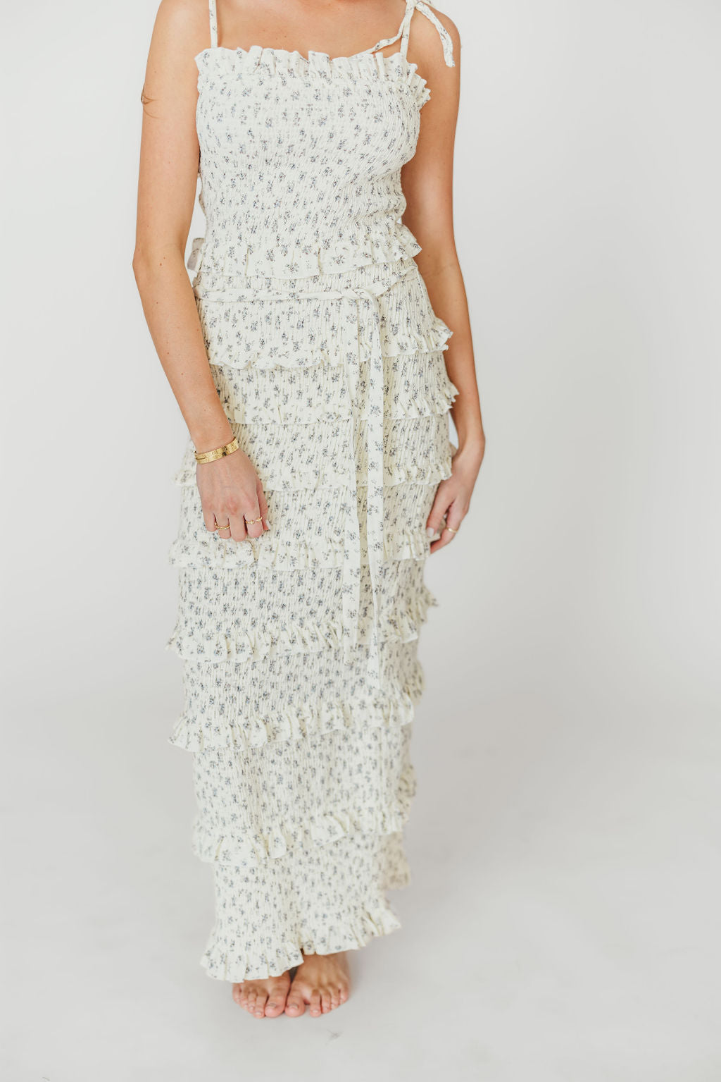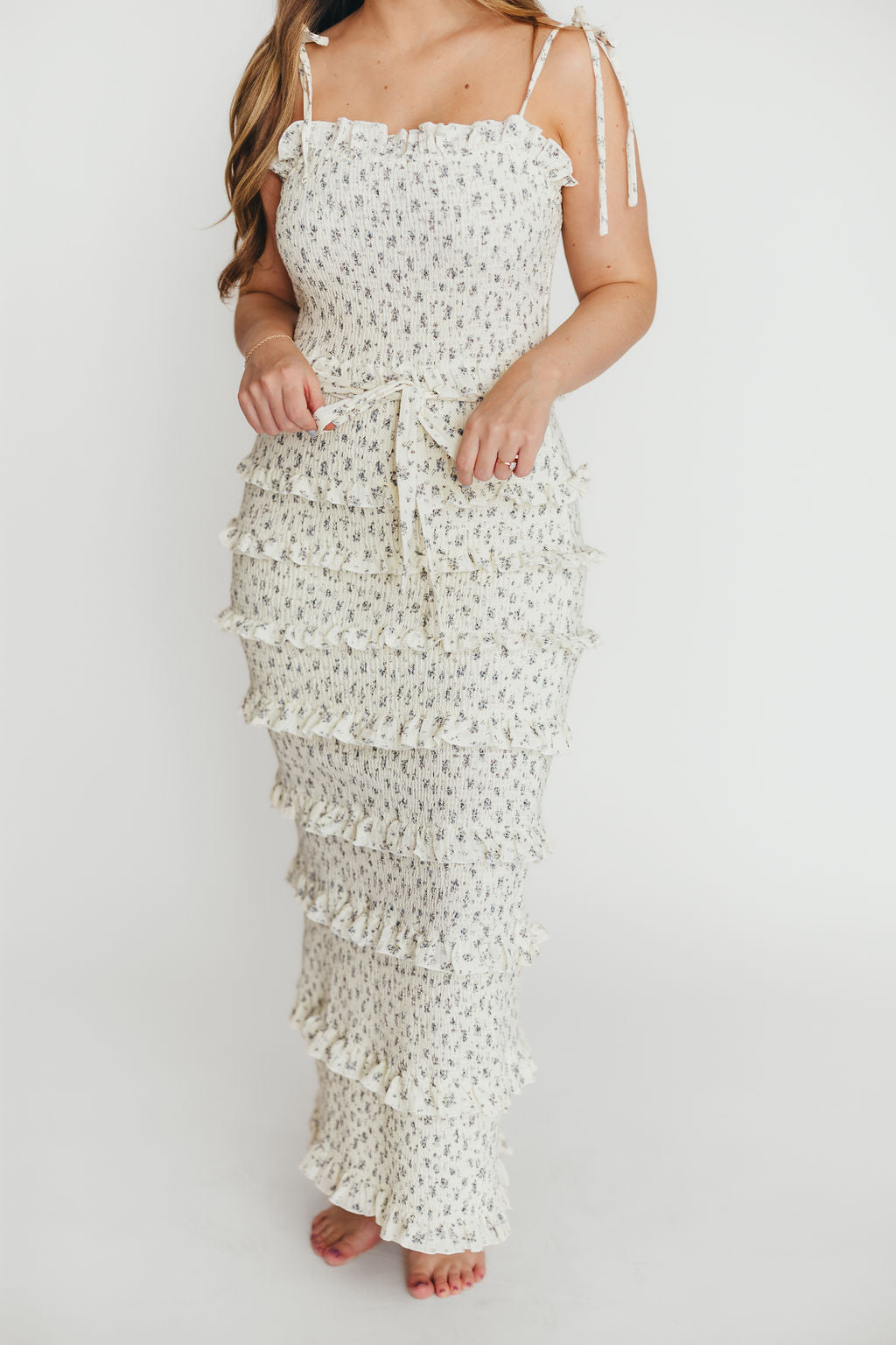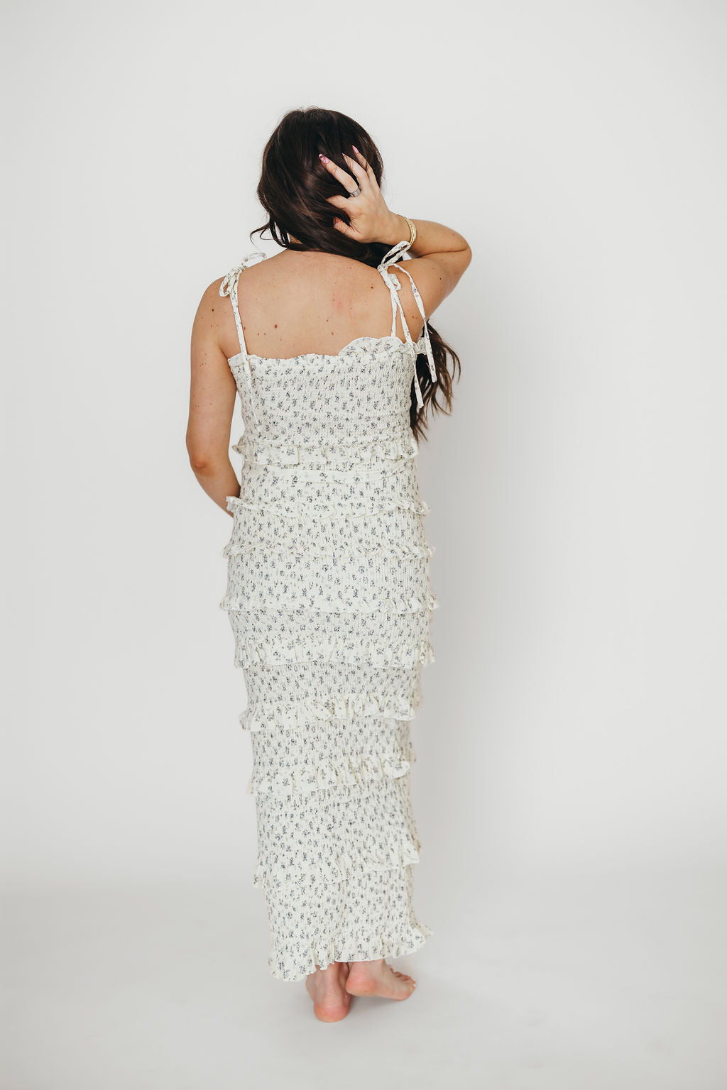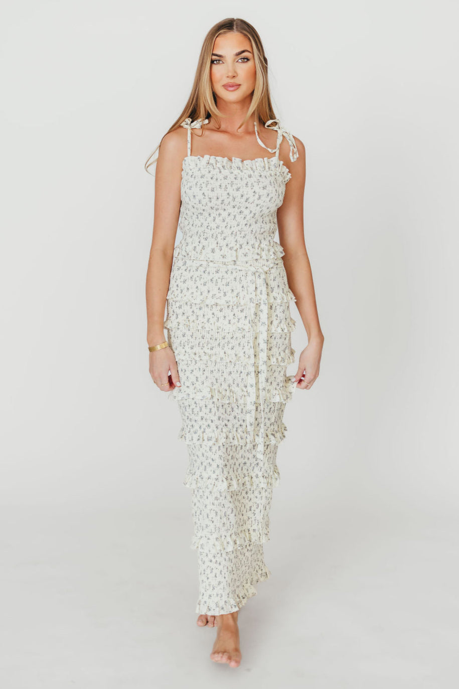 GARMENT DETAILS: Smocked 100% cotton maxi dress with square neckline, adjustable tie shoulder straps, and a fitted, sheath-style silhouette. Features a multi-tiered skirt with ruffle accents and a front tie detail. Lined.