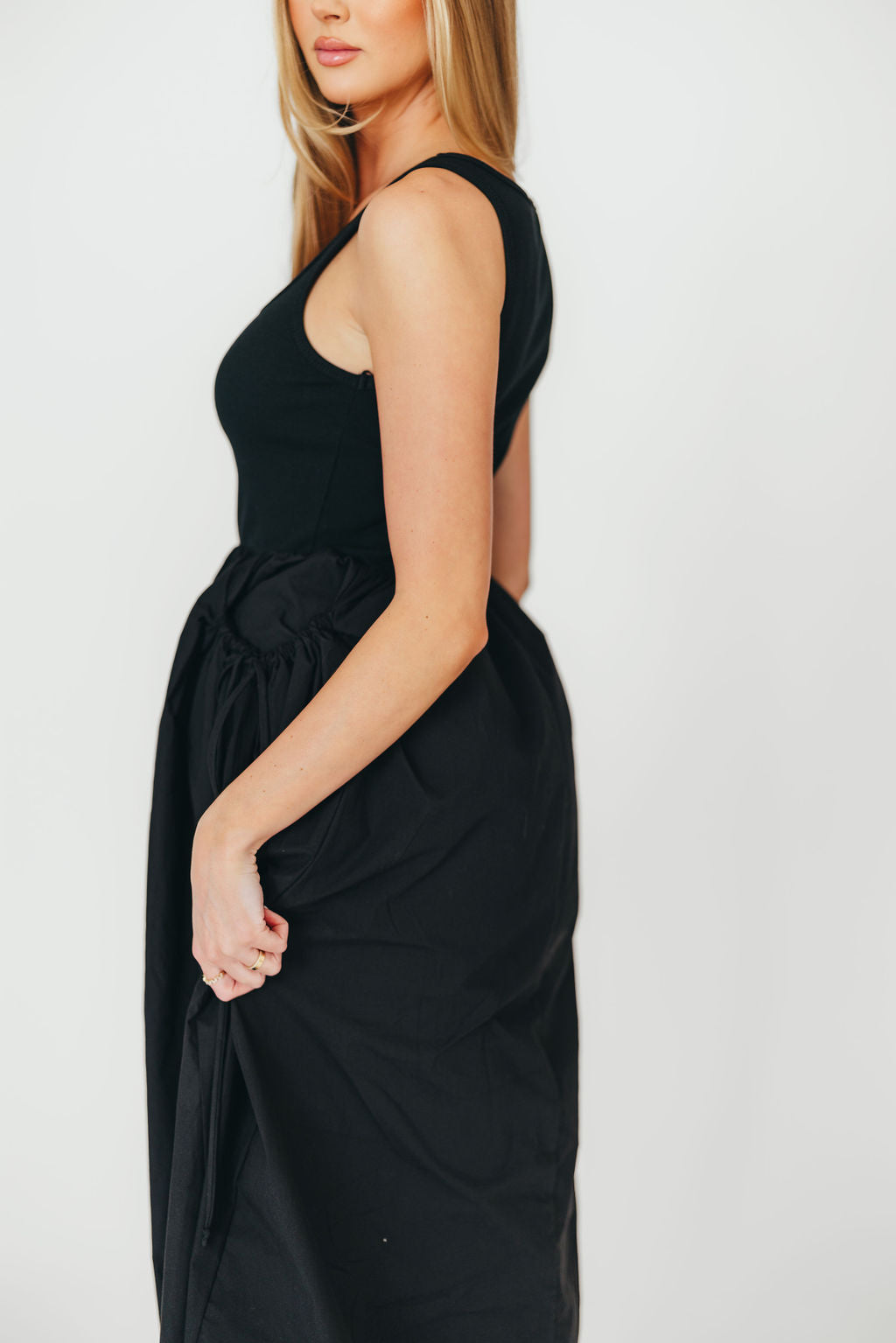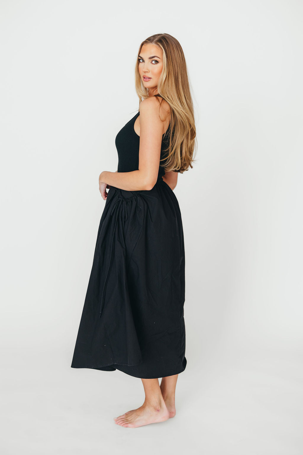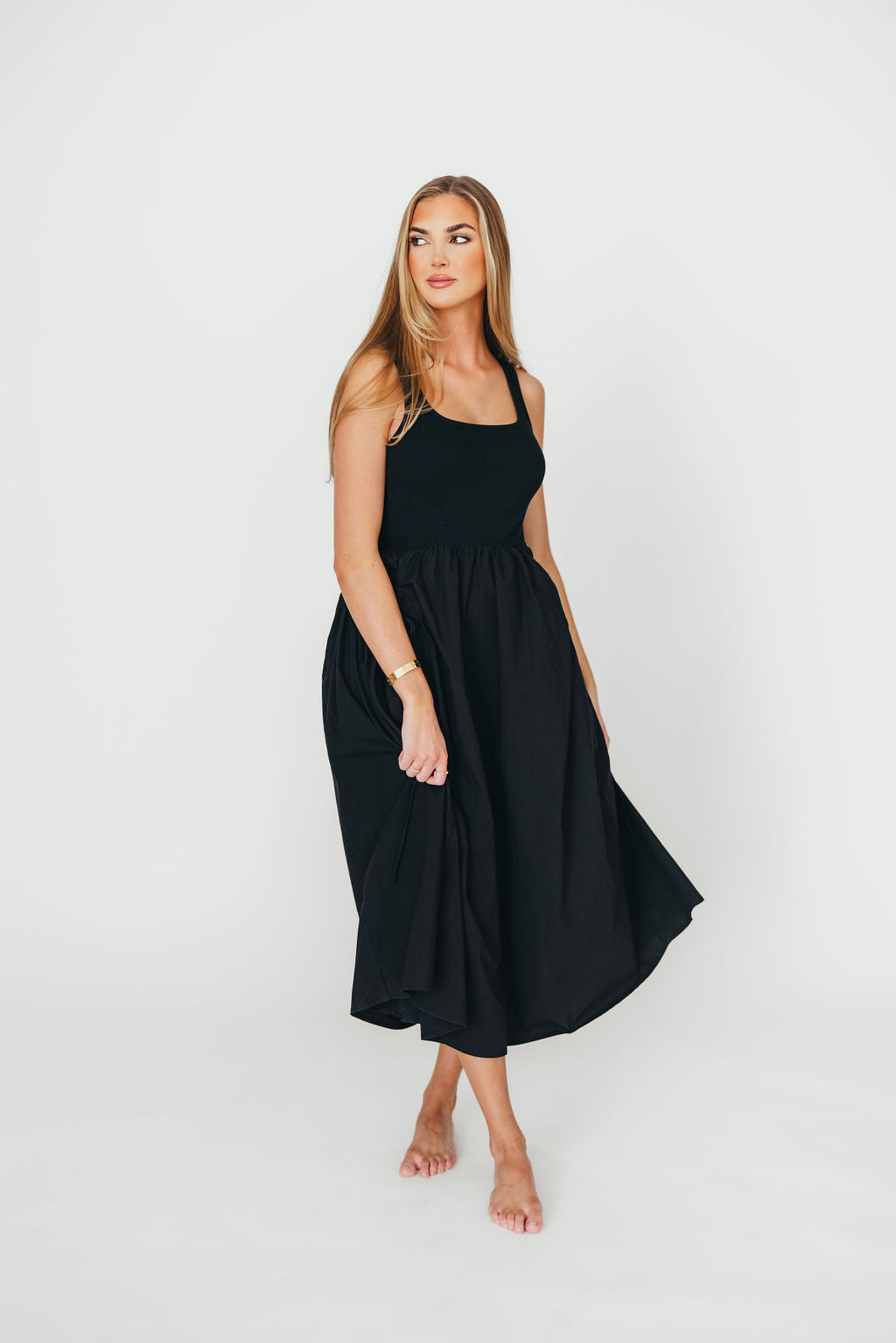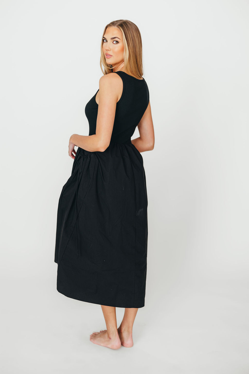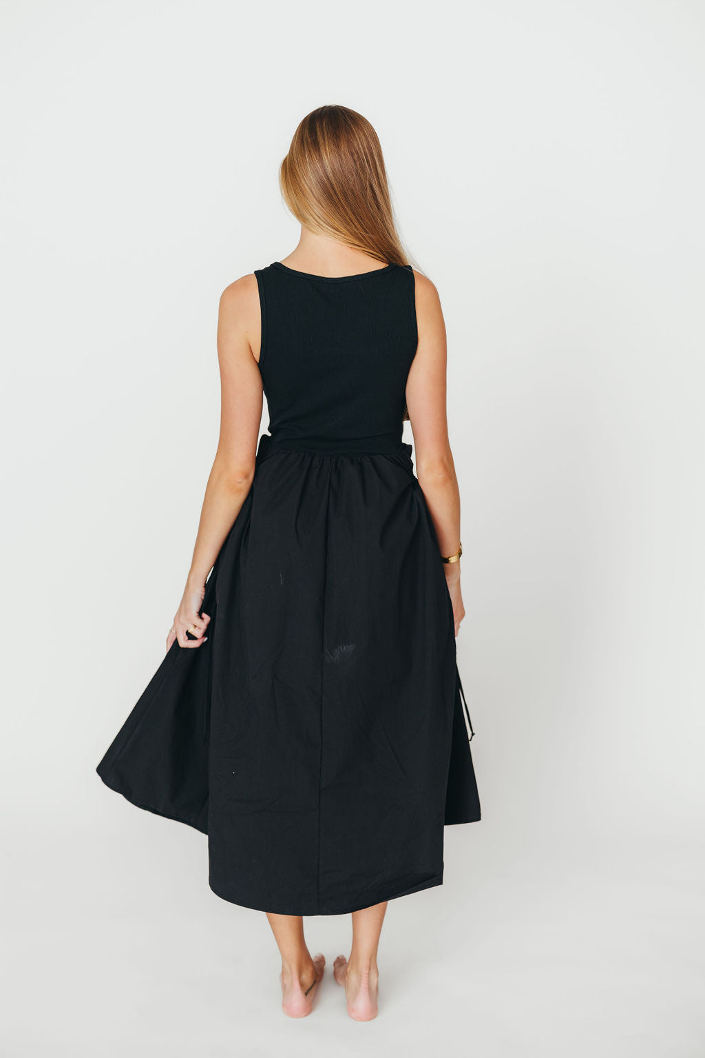 GARMENT DETAILS: Lightweight multi-fabric midi with a stretchy, ribbed knit tank bodice paired with a full poplin skirt. Finished with in-seam side pockets.
