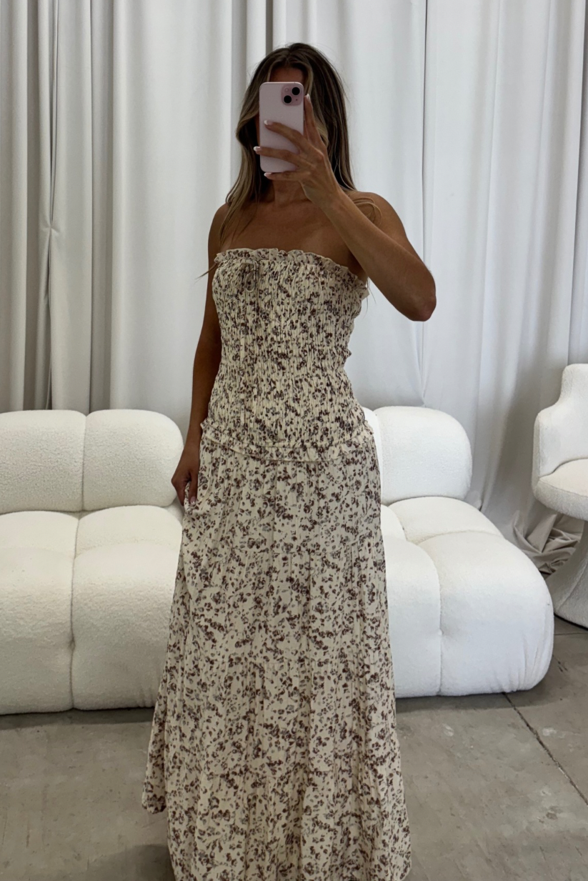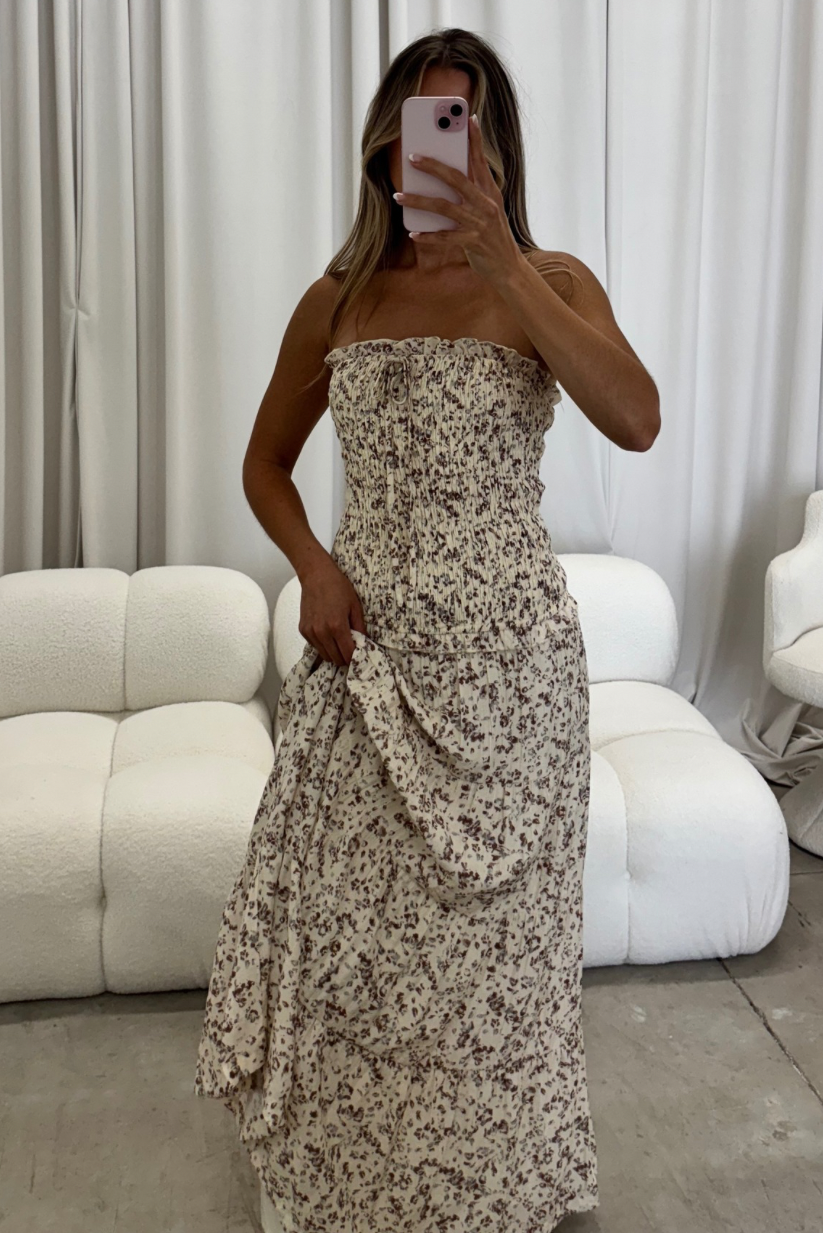 GARMENT DETAILS: Lightweight strapless maxi dress in a feminine floral print. Features a fully smocked bodice, dropped waist, front tie detail and ruffle accents.