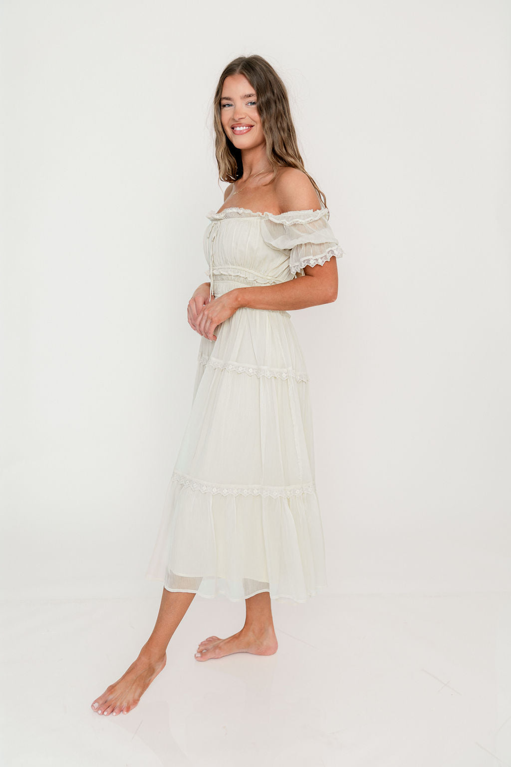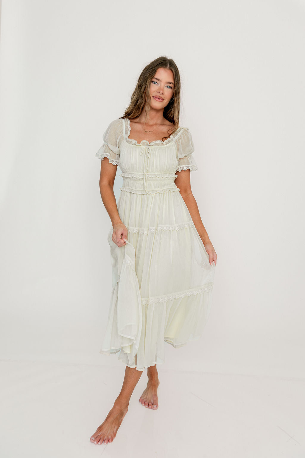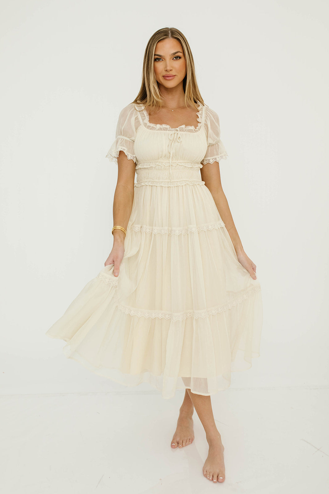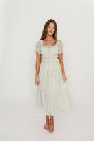 GARMENT DETAILS: Elegant, lightweight maxi dress with square, elasticated neckline that can be worn on or off the shoulders, gathered puffed sleeves, and a defined, stretchy bodice with elasticated waist. Features a multi-tiered skirt design, with full lining and ruffle accents throughout. Color may appear slightly different depending on lighting and your device screen.