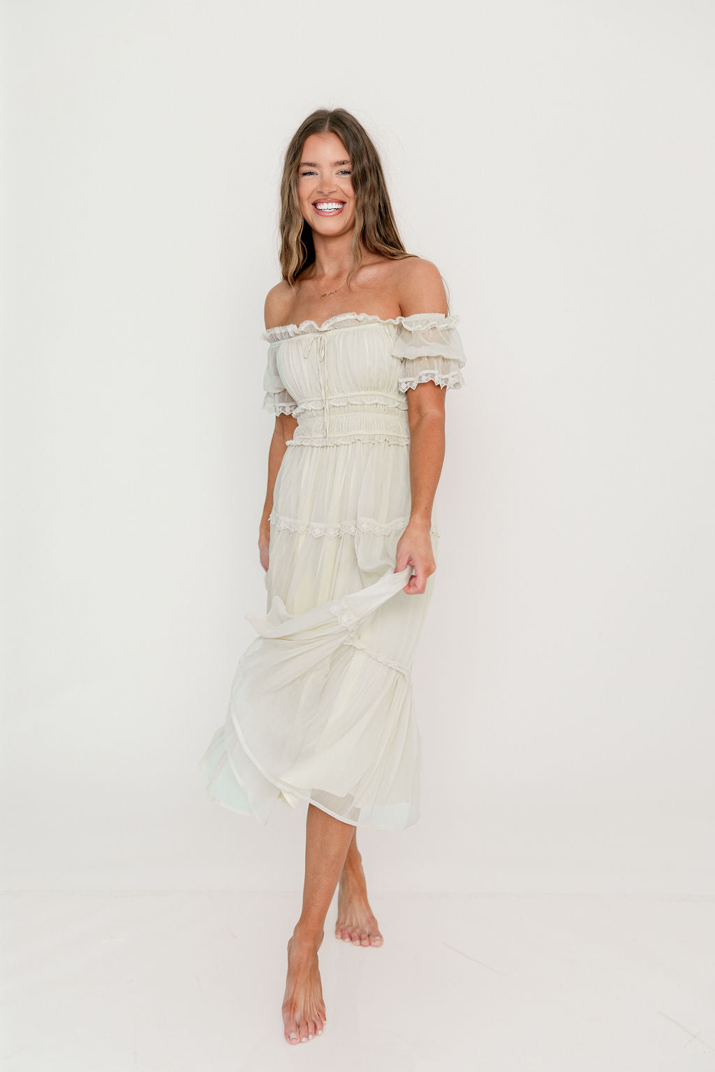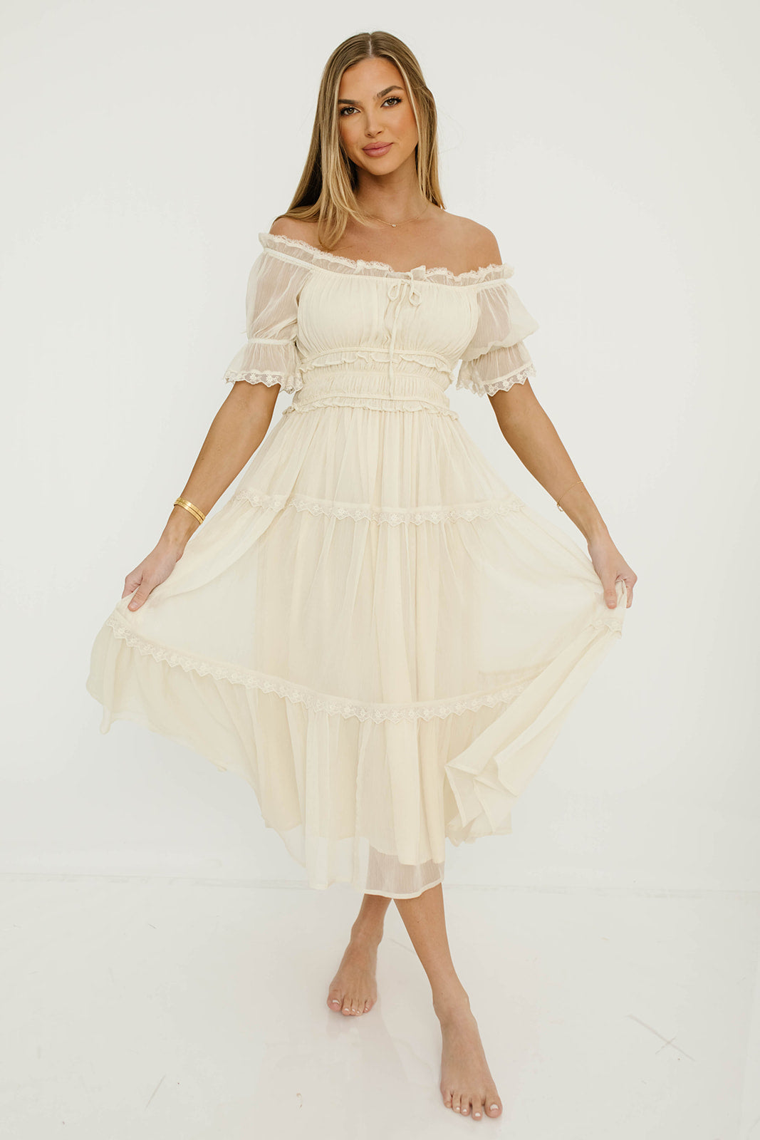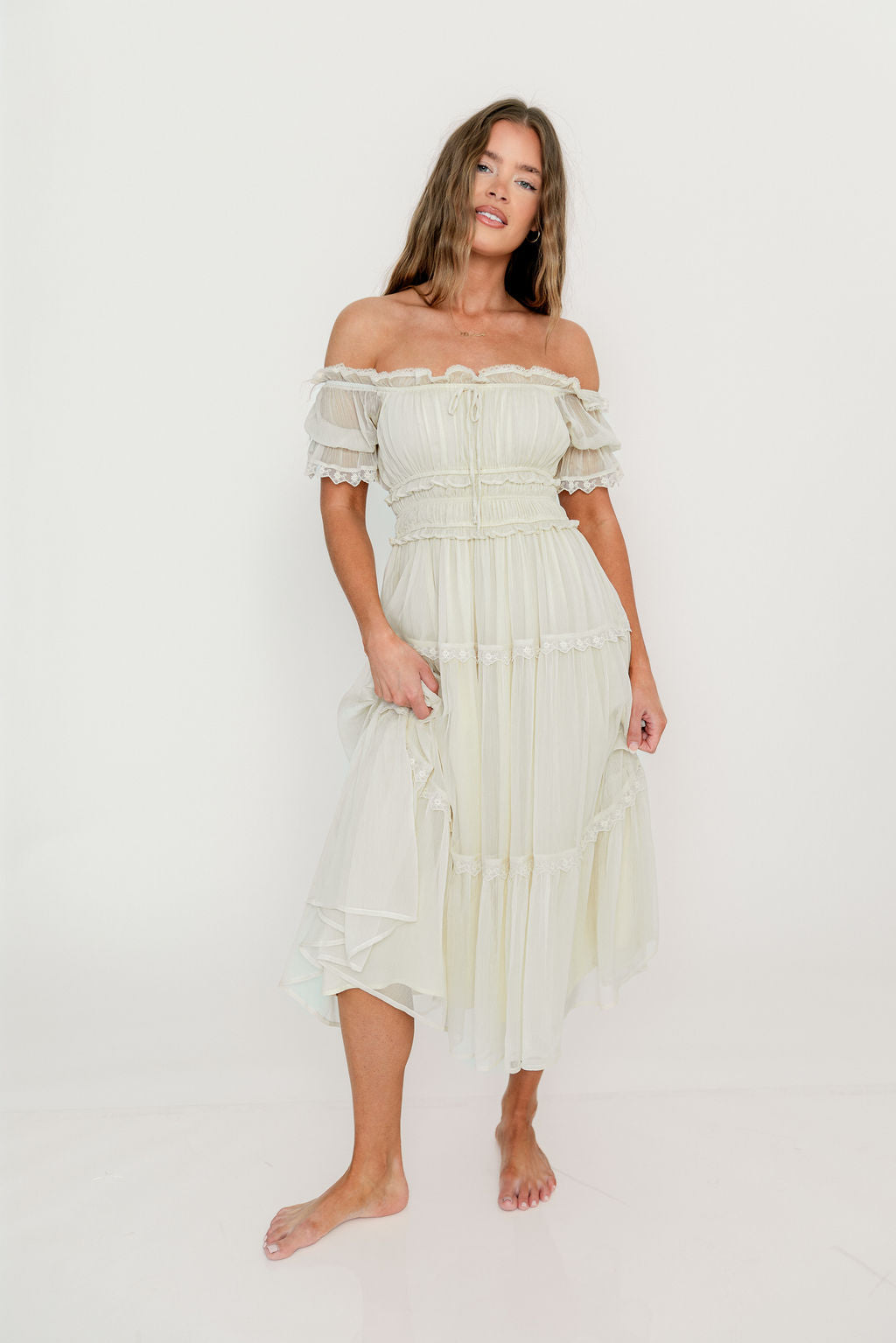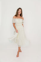 Meet the lovely Marla Maxi, a cloud-like concoction of lace and ruffles and sheer fabric that subtly flutters with every step. This charming gown has an elasticated neckline that can be worn on or off the shoulders, with gathered puffed sleeves, a defined waist, and an elegant, multi-tiered skirt with full lining and flowy sheer overlay. Make the Marla yours, just in time for Easter and spring events!