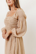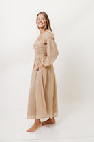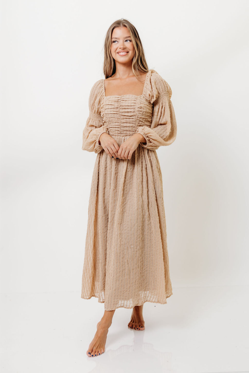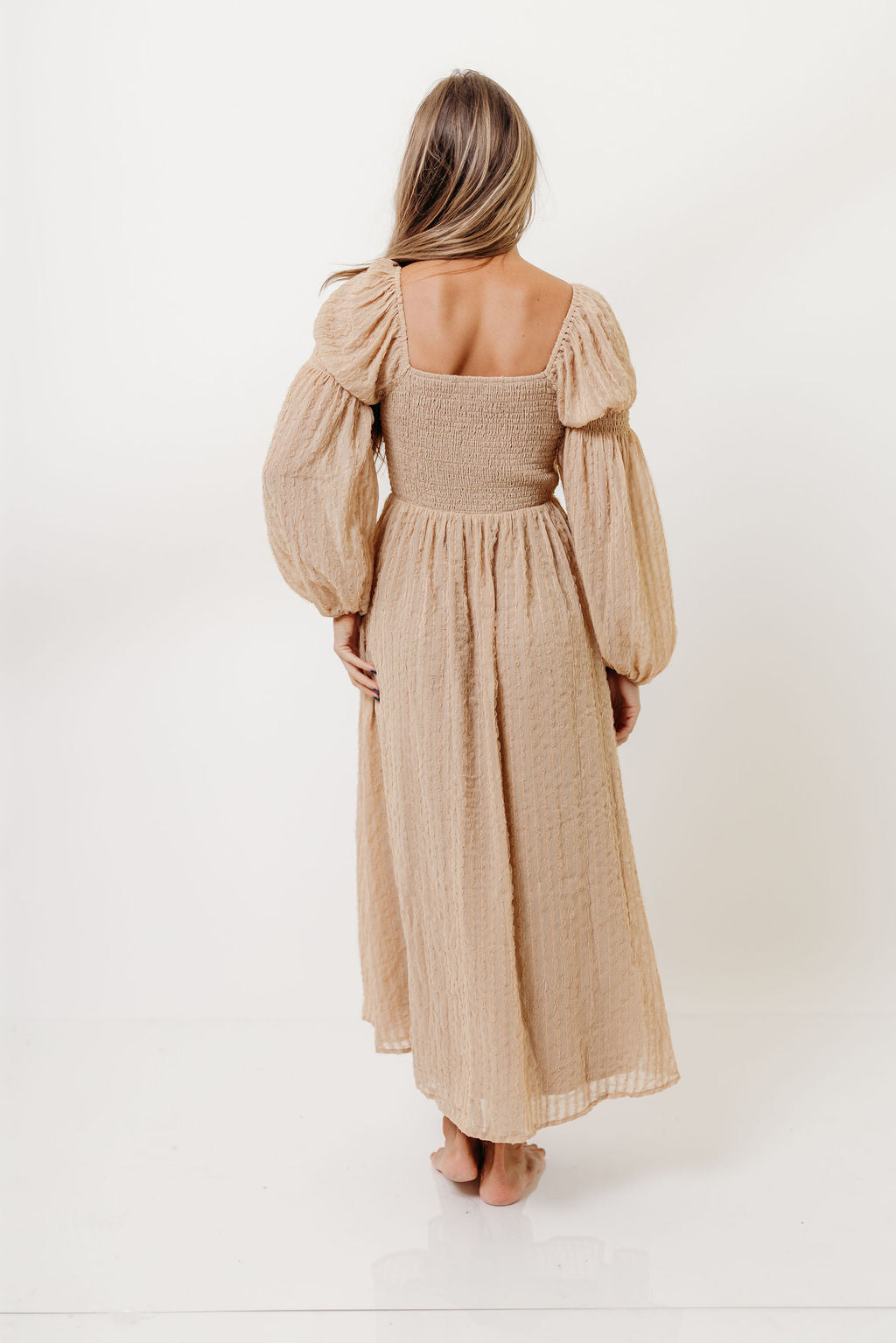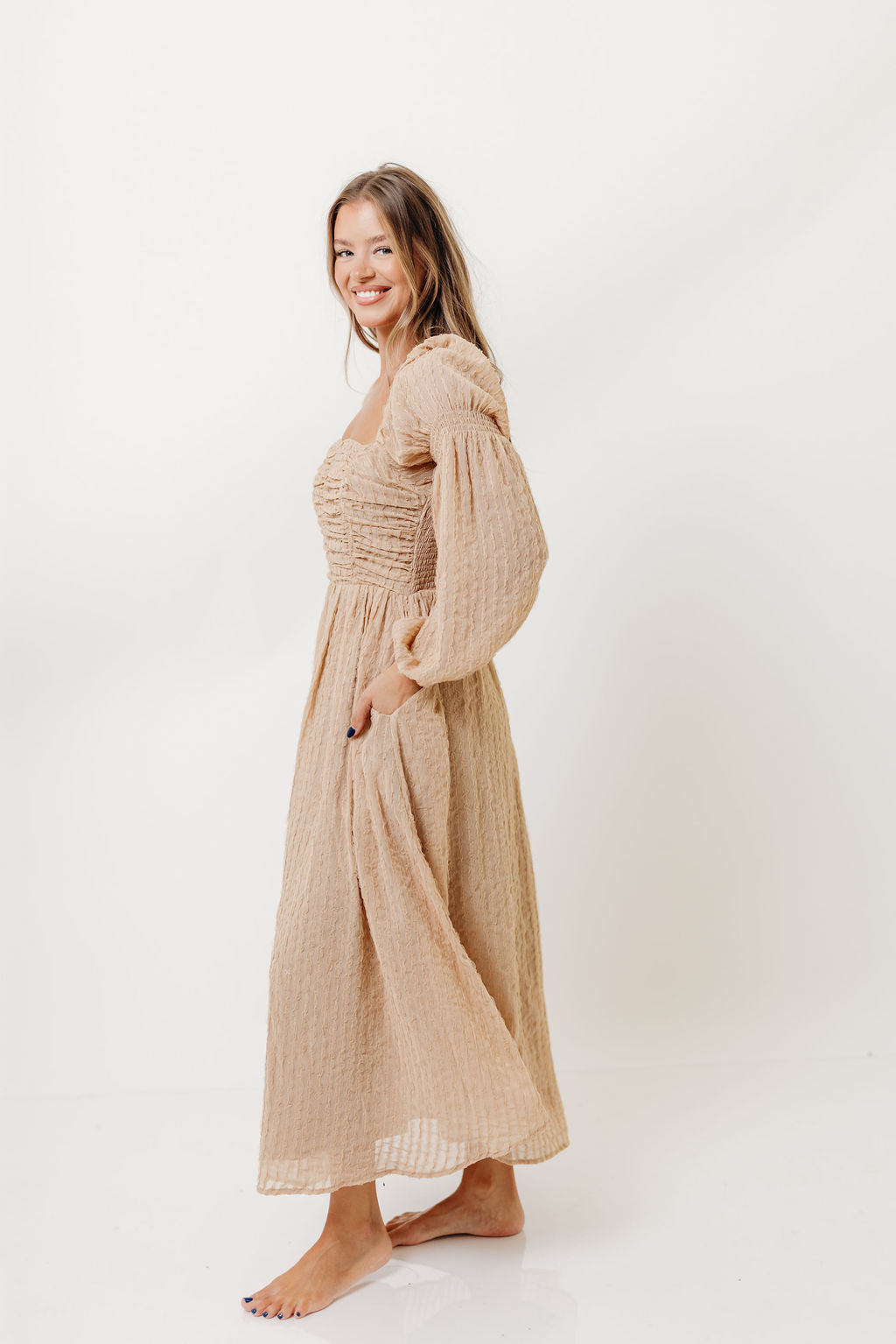 GARMENT DETAILS: Lightweight chiffon maxi dress with a subtle textured stripe pattern, with a smocked bodice and ruched details. Features long bishop sleeves, square neckline, and functional side pockets. Fully lined.