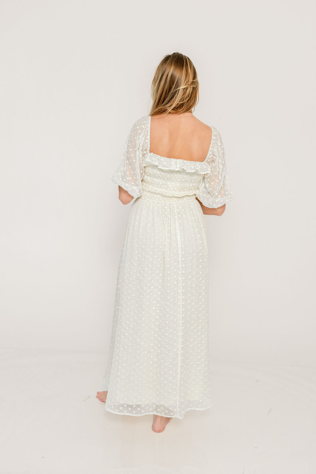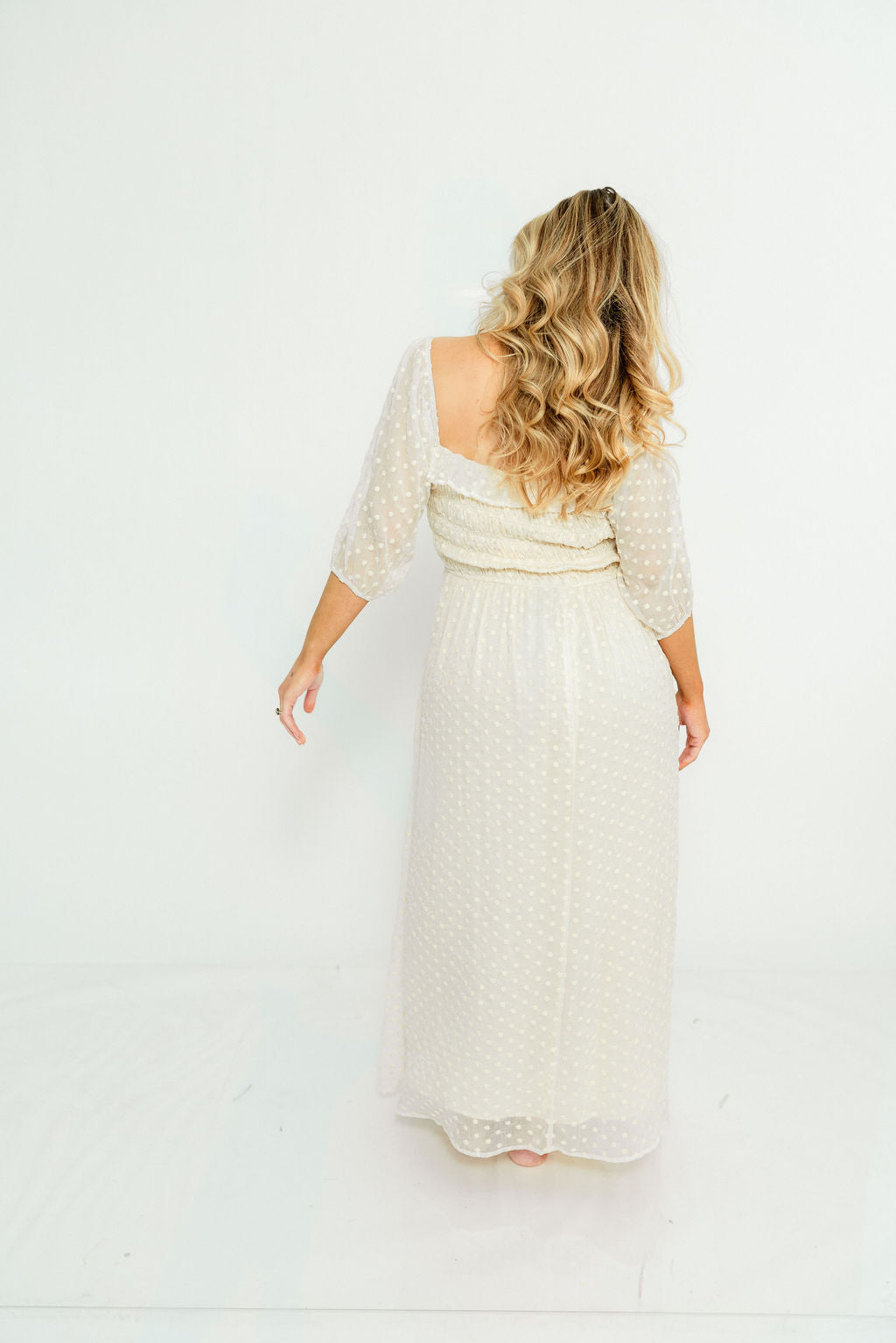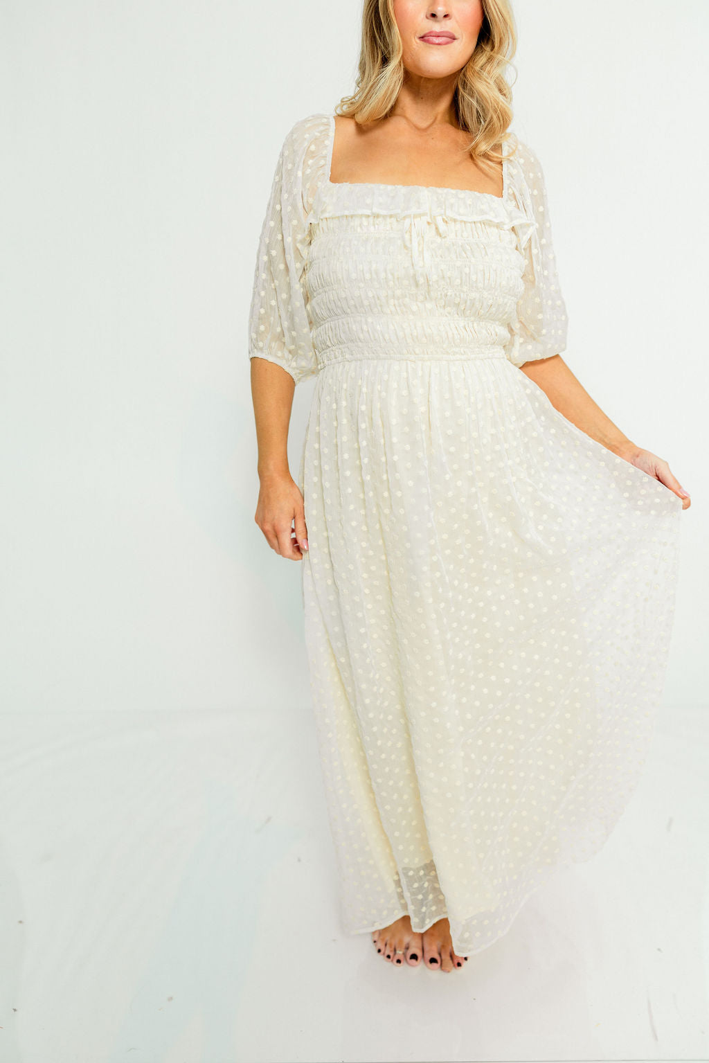 GARMENT DETAILS: Elegant maxi dress with a lightweight chiffon Swiss dot overlay. Features a square neckline, 3/4 length puffed sleeves, and a ruched and smocked bodice. Fully lined.