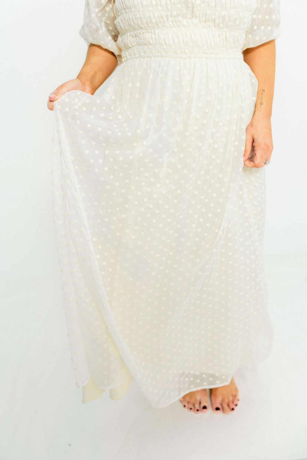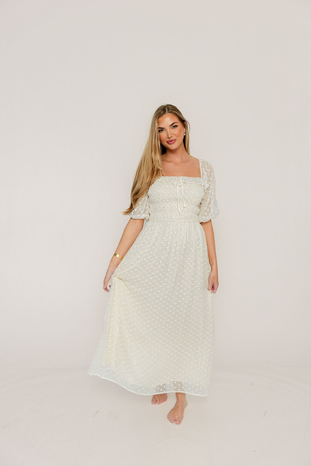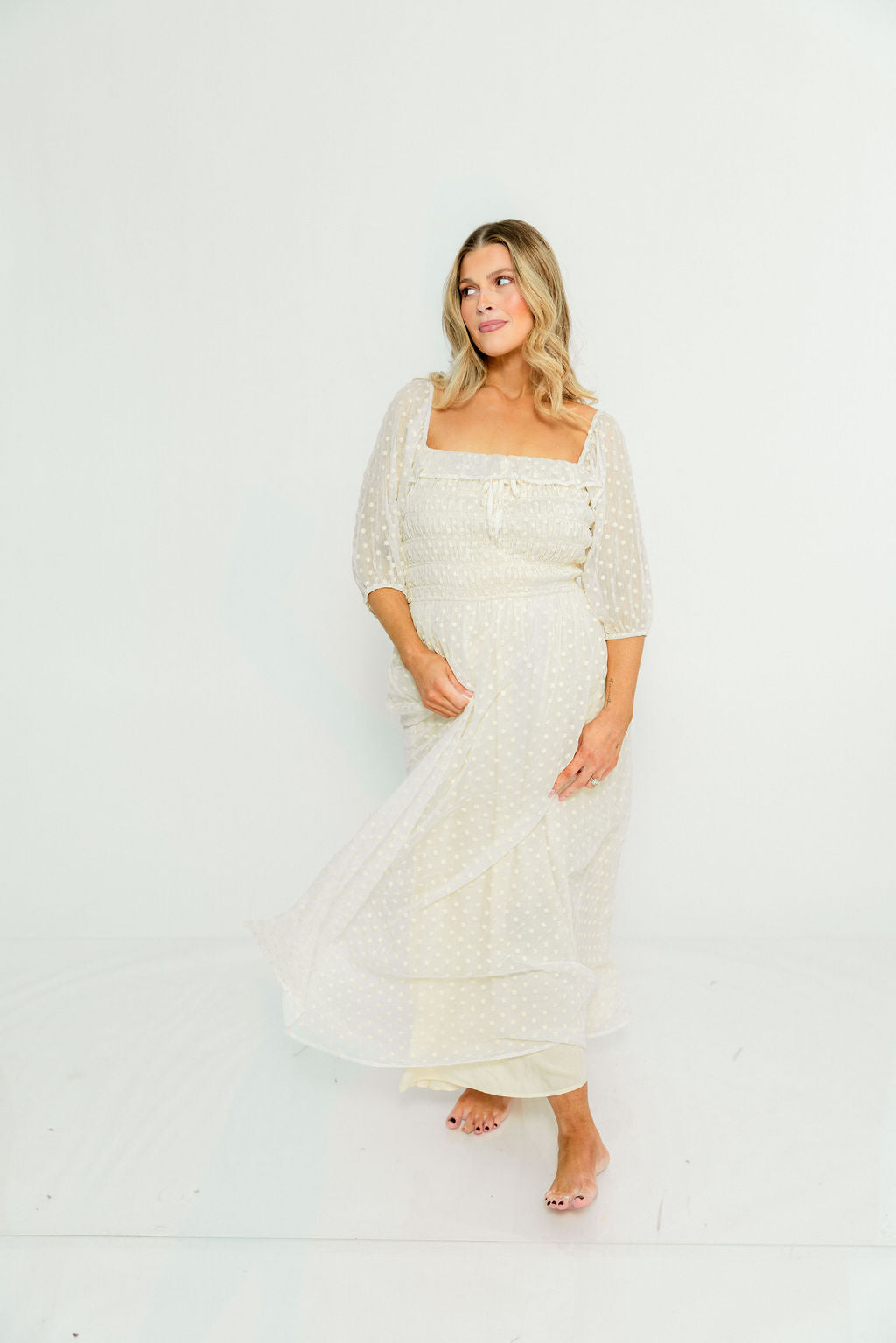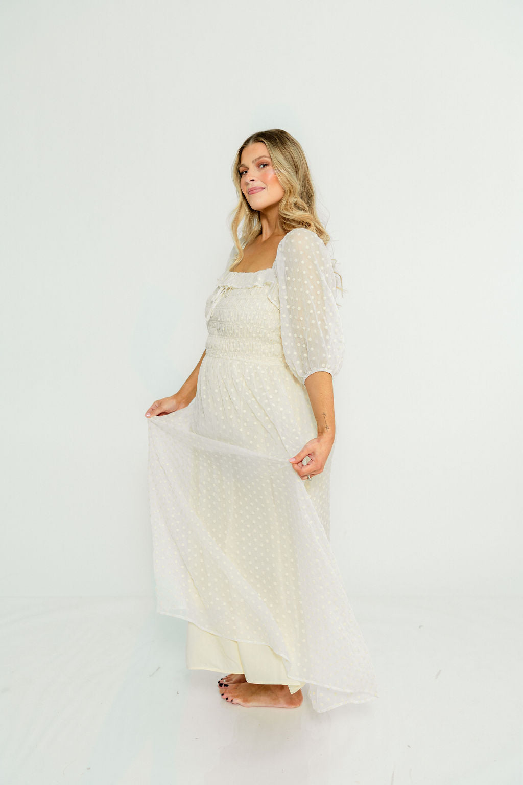 GARMENT DETAILS: Elegant maxi dress with a lightweight chiffon Swiss dot overlay. Features a square neckline, 3/4 length puffed sleeves, and a ruched and smocked bodice. Fully lined.