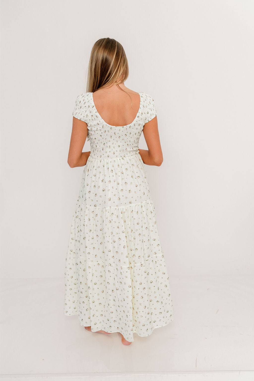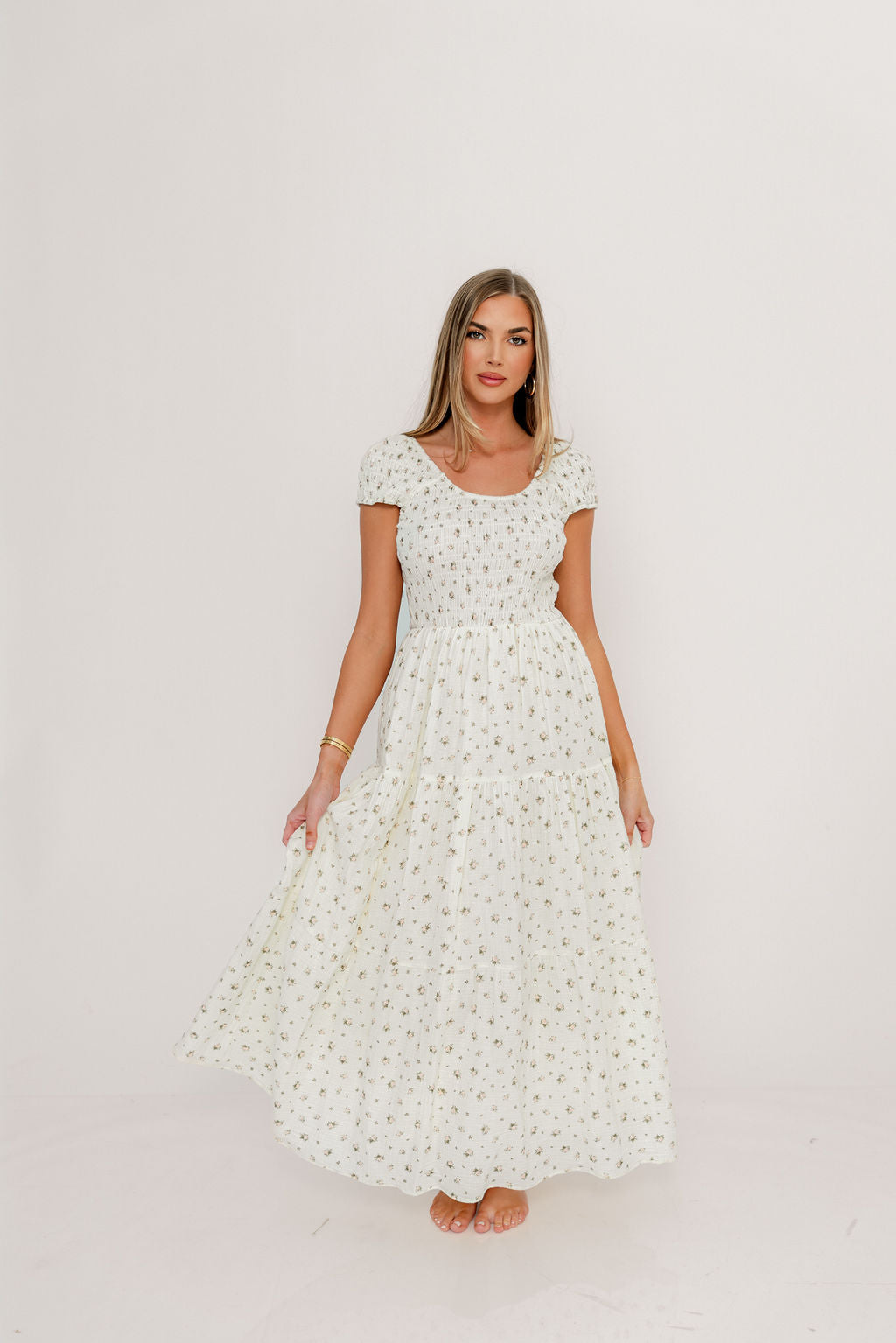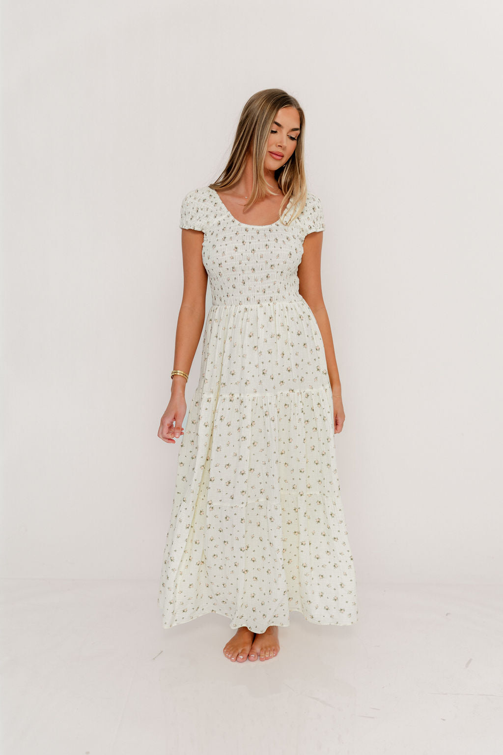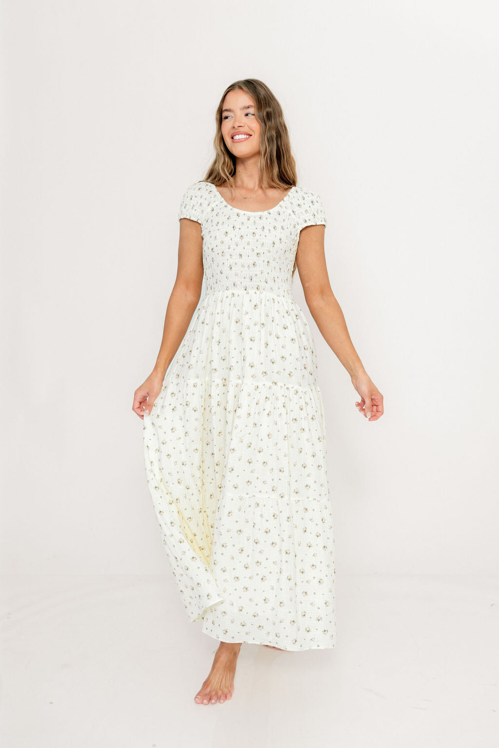 GARMENT DETAILS: Elegant cottagecore maxi dress with a playful floral print and 100% cotton construction. Features a scooped neckline, puffed cap sleeves, and a fully smocked and stretchy bodice. Finished with extra-wide and flowy maxi-length skirt.