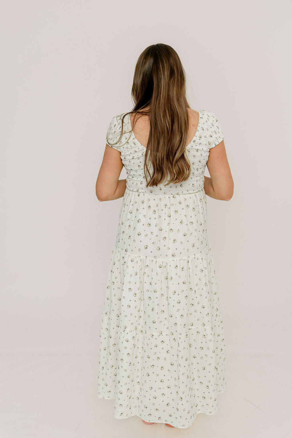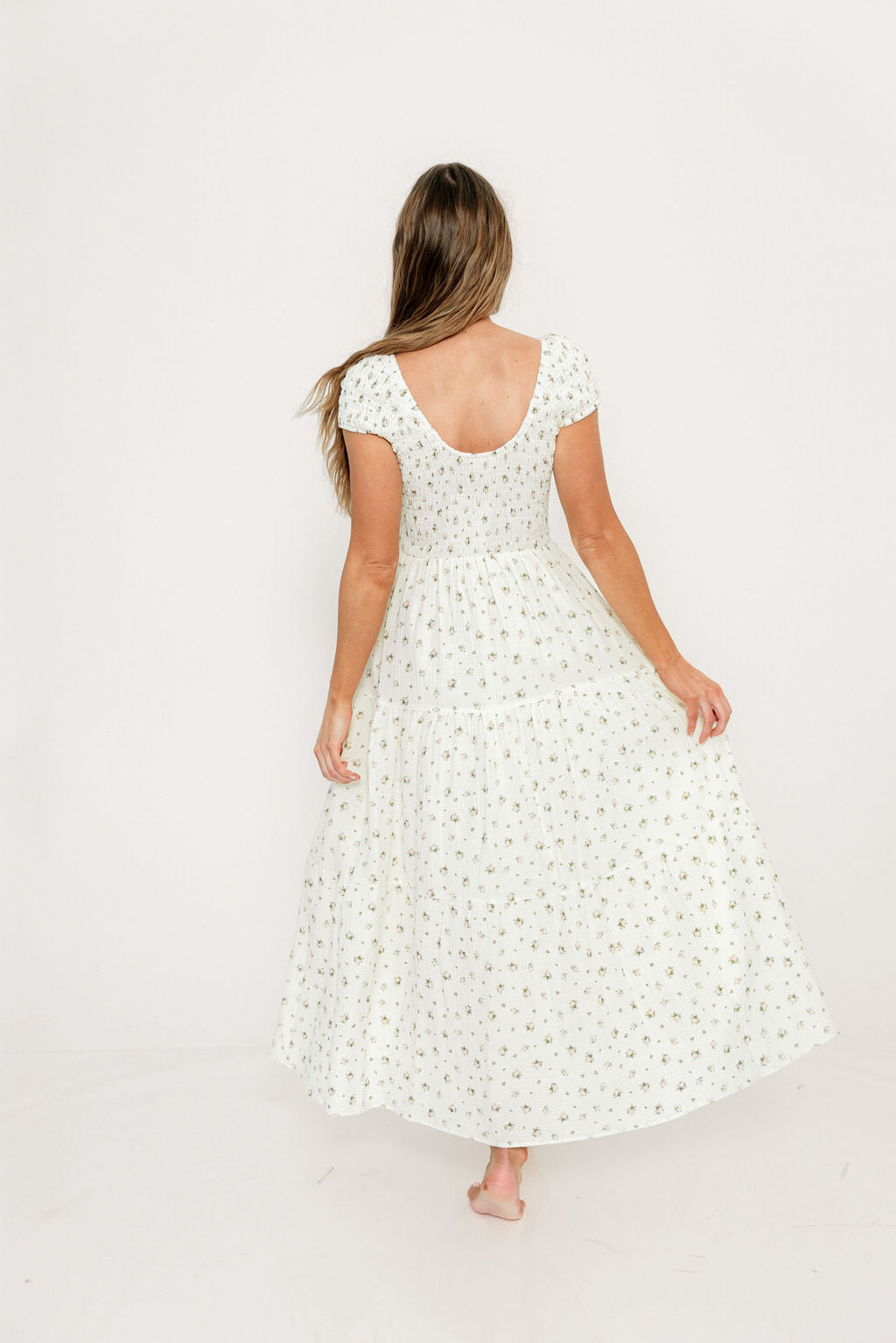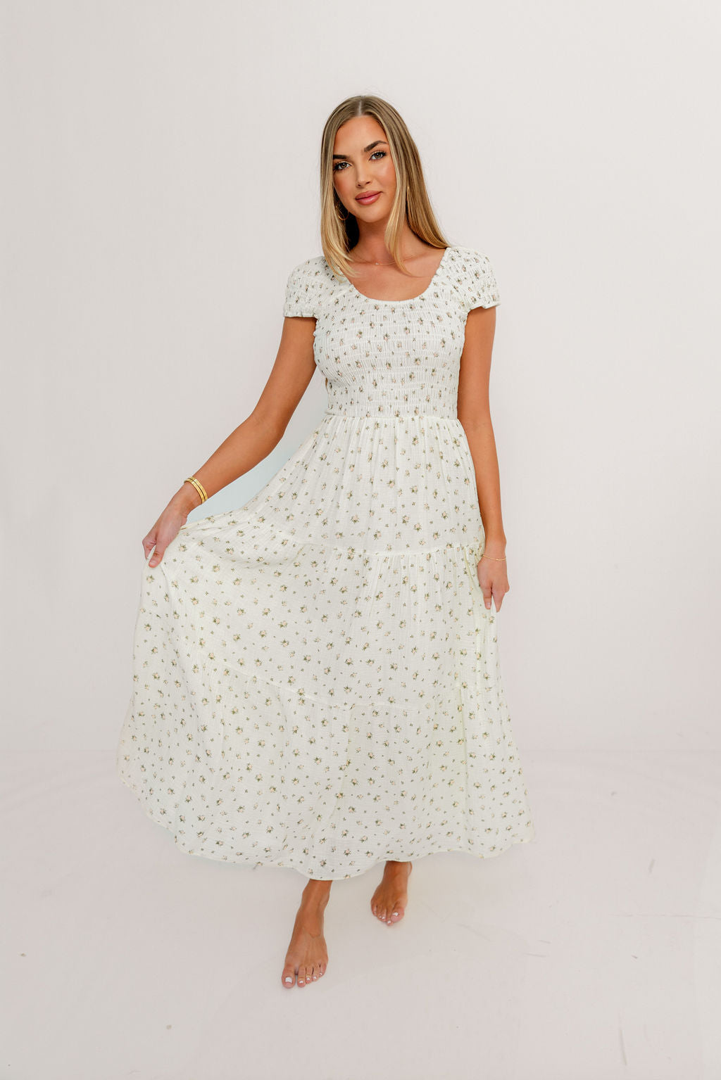 GARMENT DETAILS: Elegant cottagecore maxi dress with a playful floral print and 100% cotton construction. Features a scooped neckline, puffed cap sleeves, and a fully smocked and stretchy bodice. Finished with extra-wide and flowy maxi-length skirt.