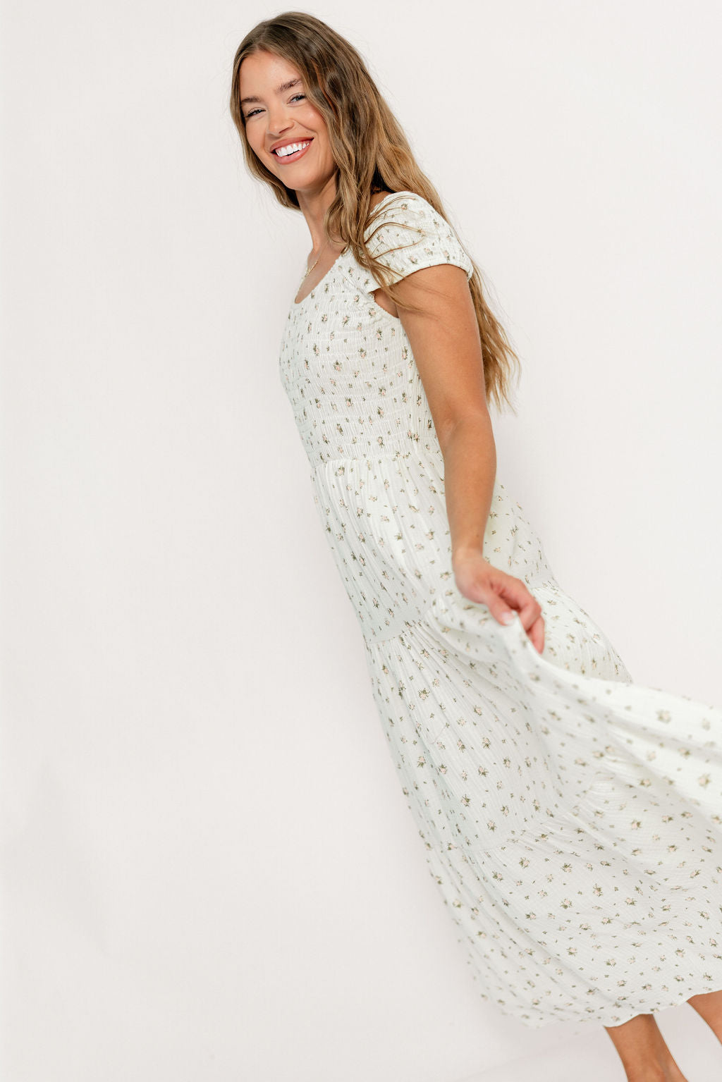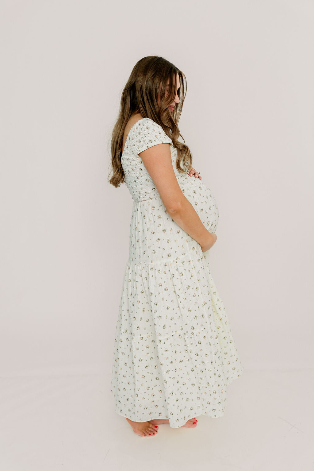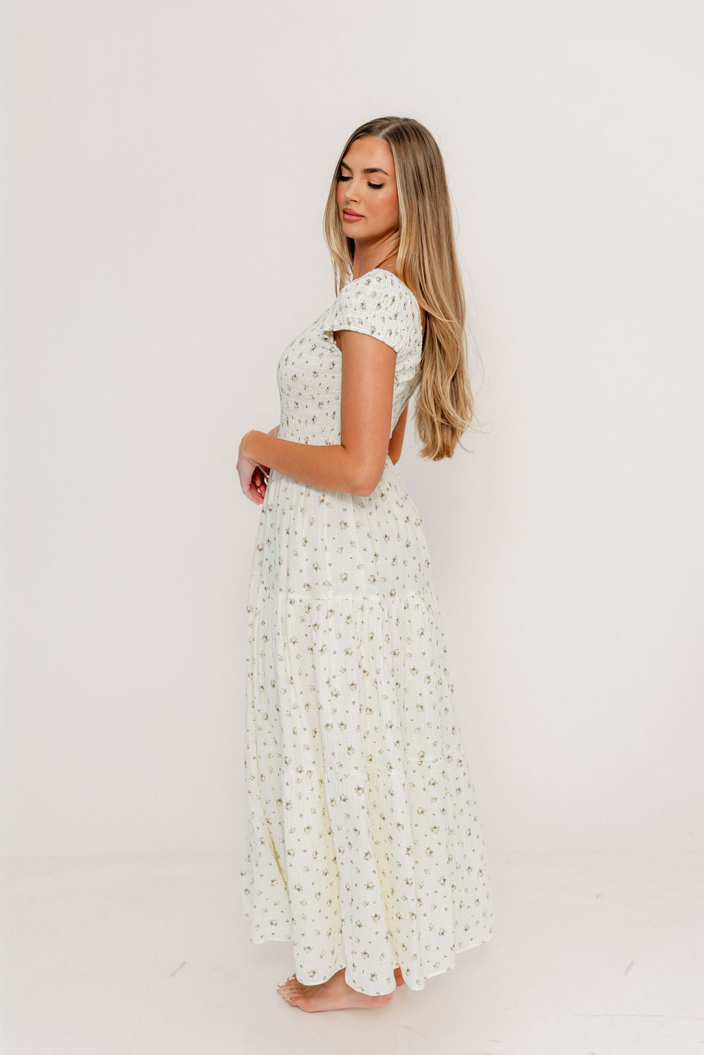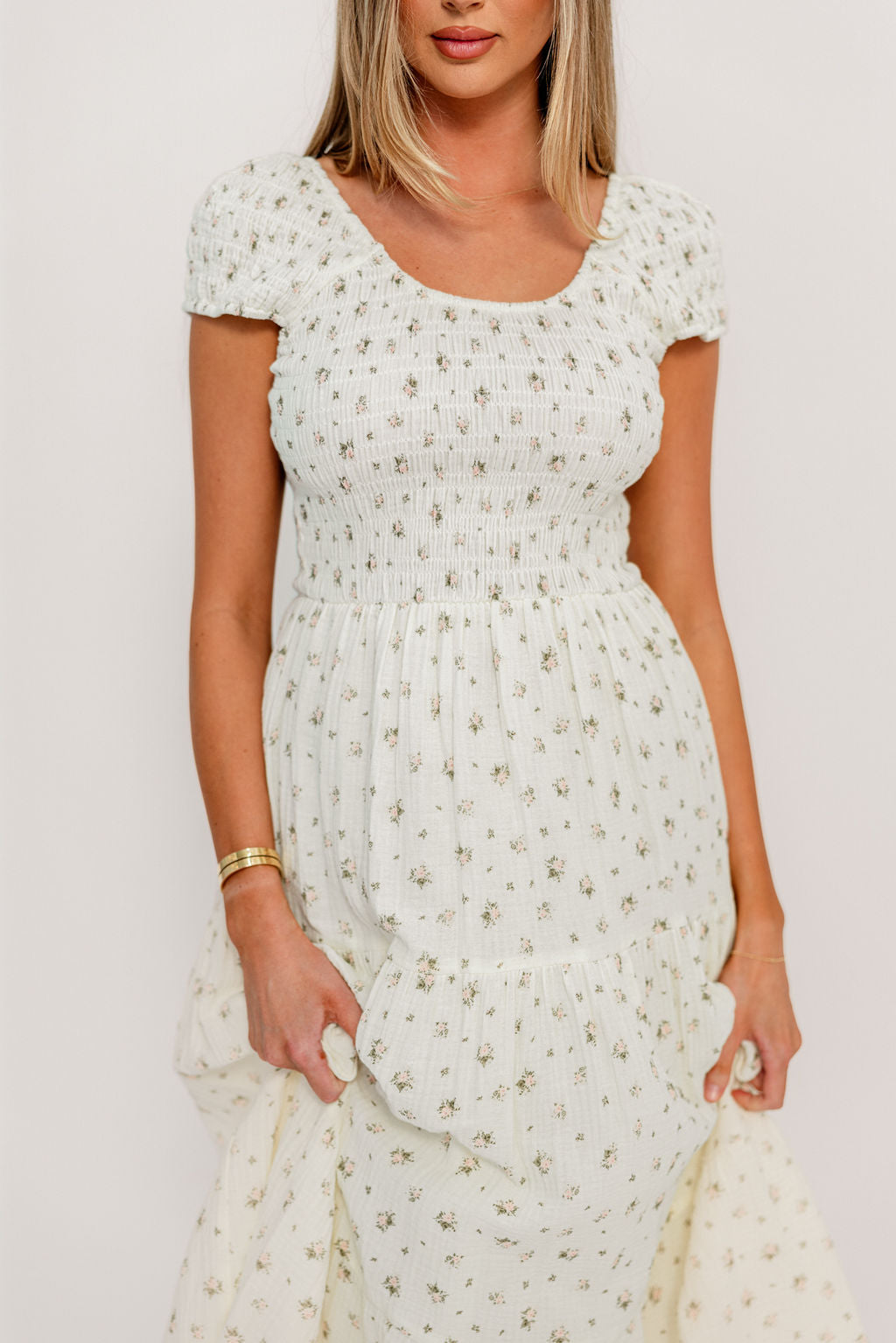 GARMENT DETAILS: Elegant cottagecore maxi dress with a playful floral print and 100% cotton construction. Features a scooped neckline, puffed cap sleeves, and a fully smocked and stretchy bodice. Finished with extra-wide and flowy maxi-length skirt.