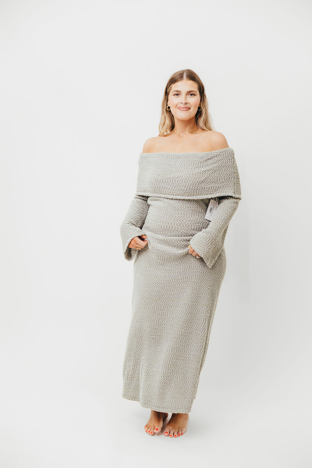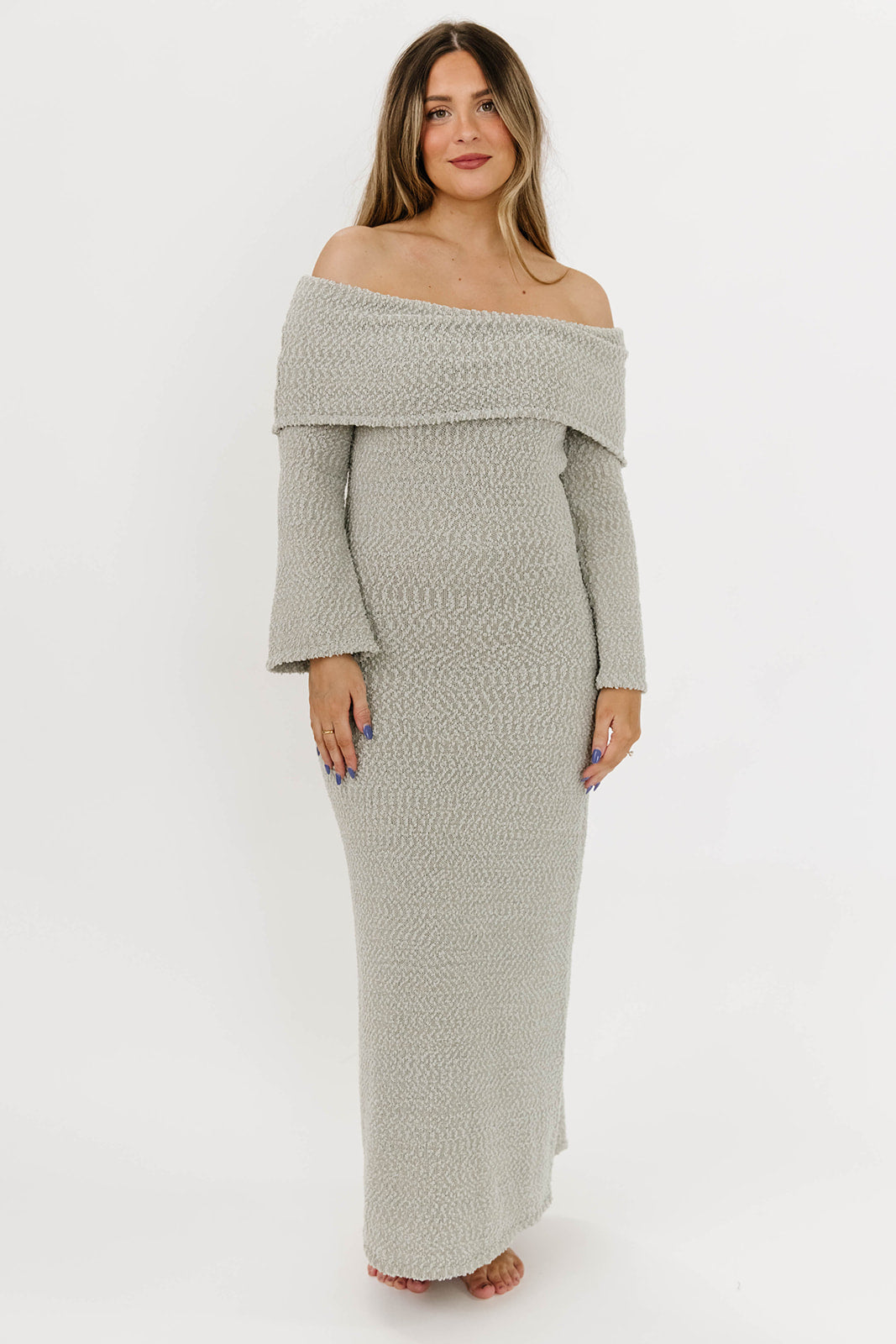GARMENT DETAILS: Gorgeous chenille-like knit maxi dress with folded off-the-shoulder neckline, flared long sleeves, and a fit-and-flare skirt. Features a full lining (neck to hem) but still very lightweight.