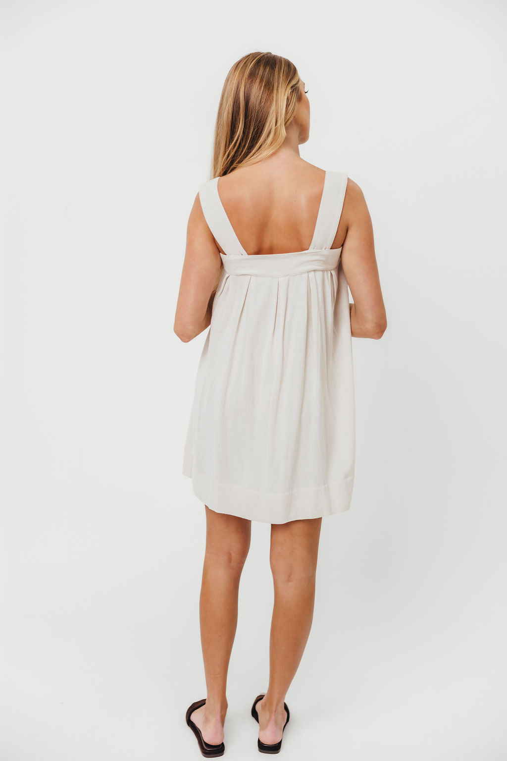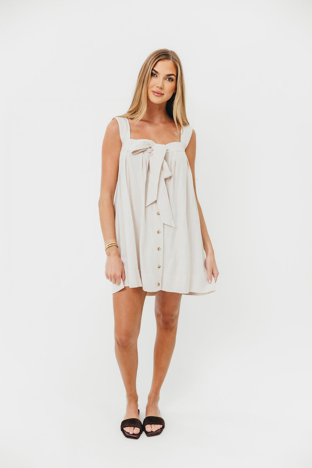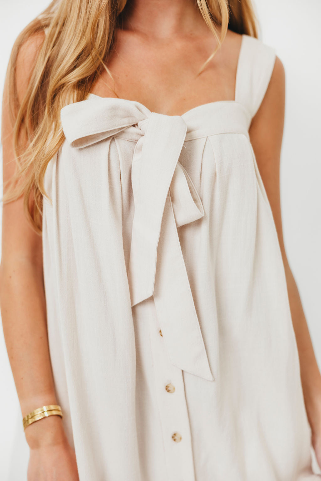 GARMENT DETAILS: Soft, premium cotton mini dress in a babydoll swing-style silhouette. Features a sweetheart neckline with statement bow detail, front button placket, and adjustable buttoned shoulder straps.