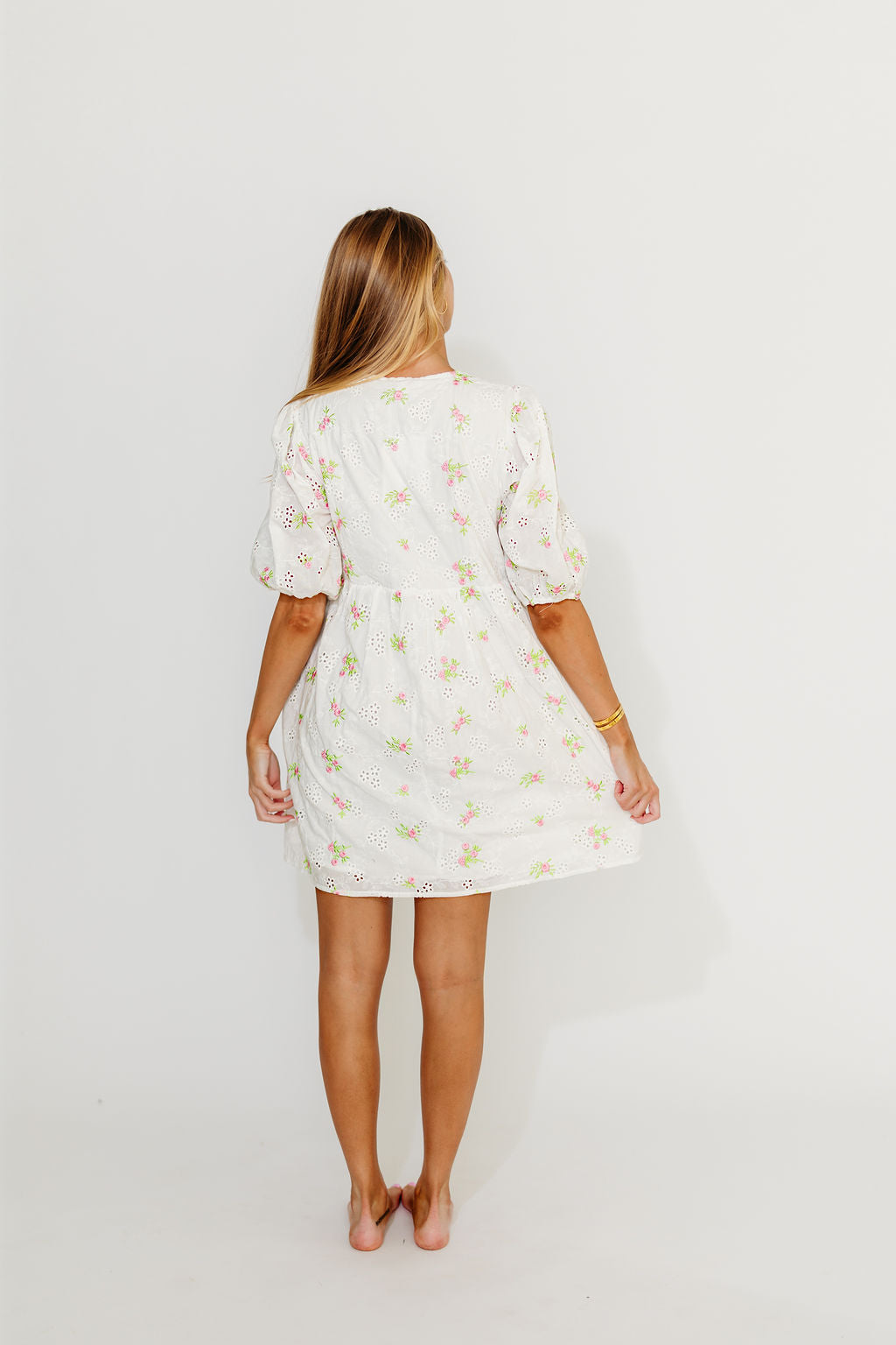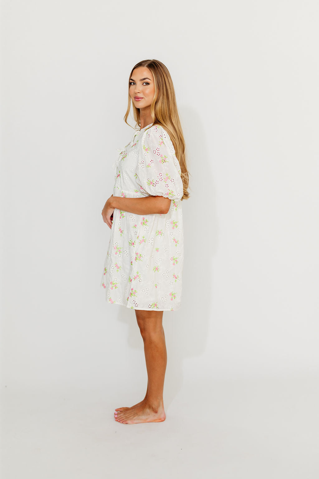 GARMENT DETAILS: Delicate floral summer dress in a long mini length, with 1/2 length sleeves, rounded neckline, and dainty eyelet lace details. Features an open front style with functional and adjustable ties.