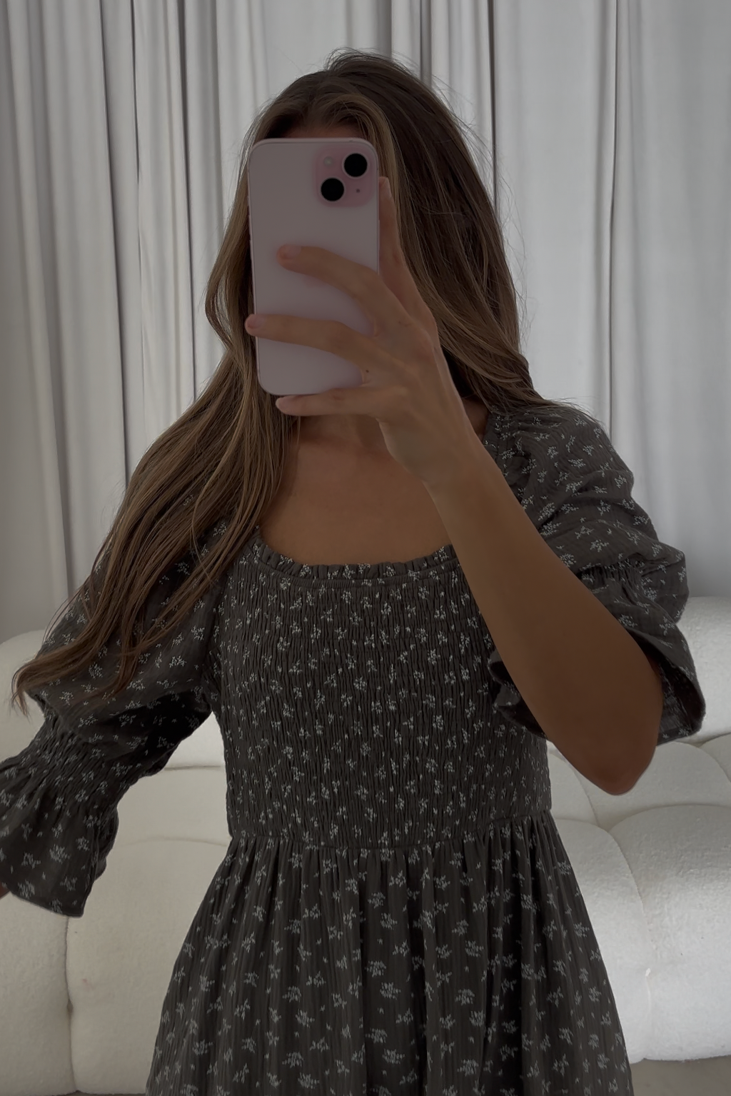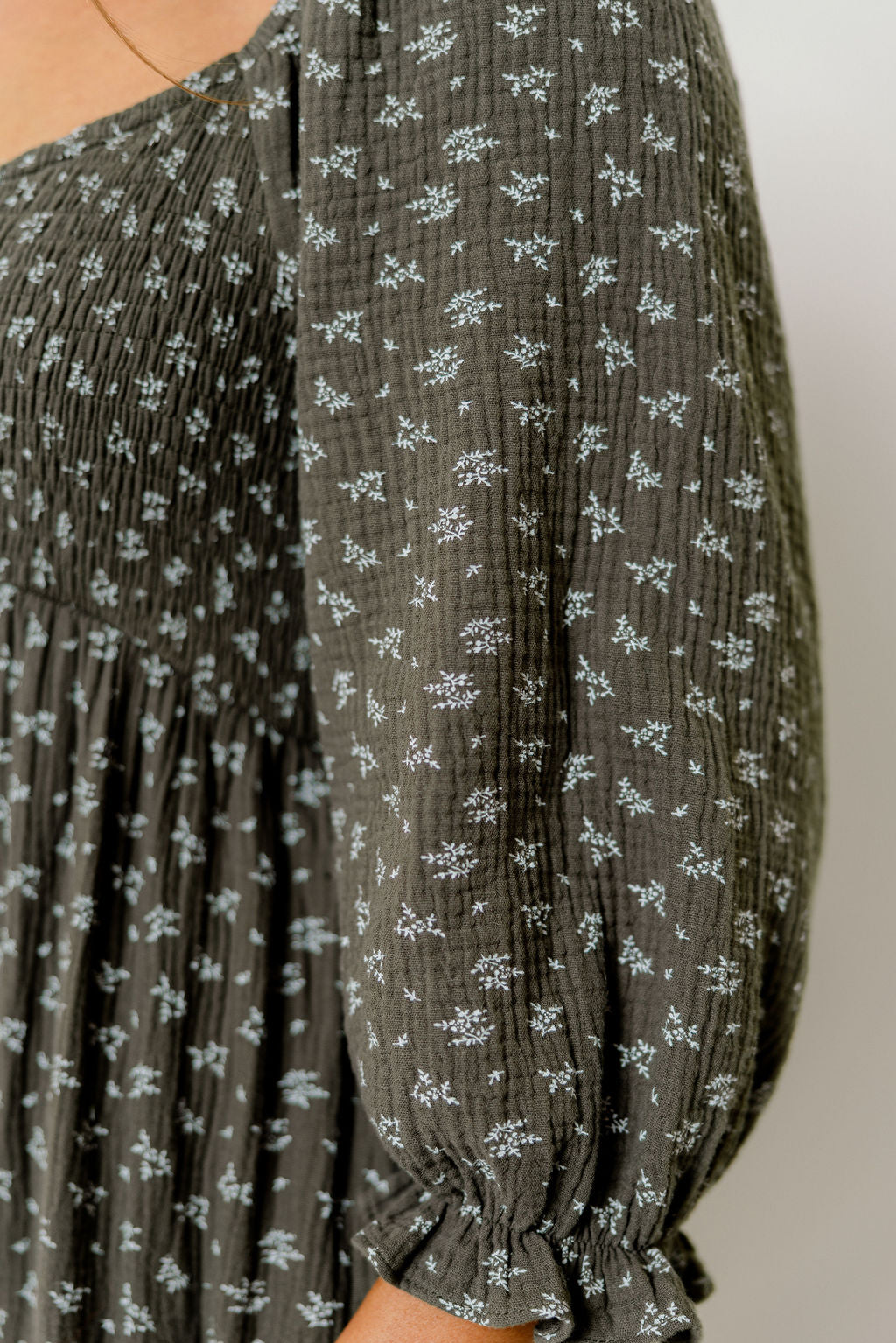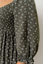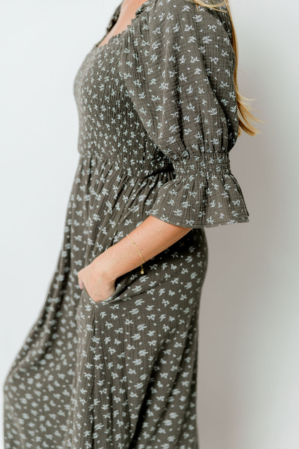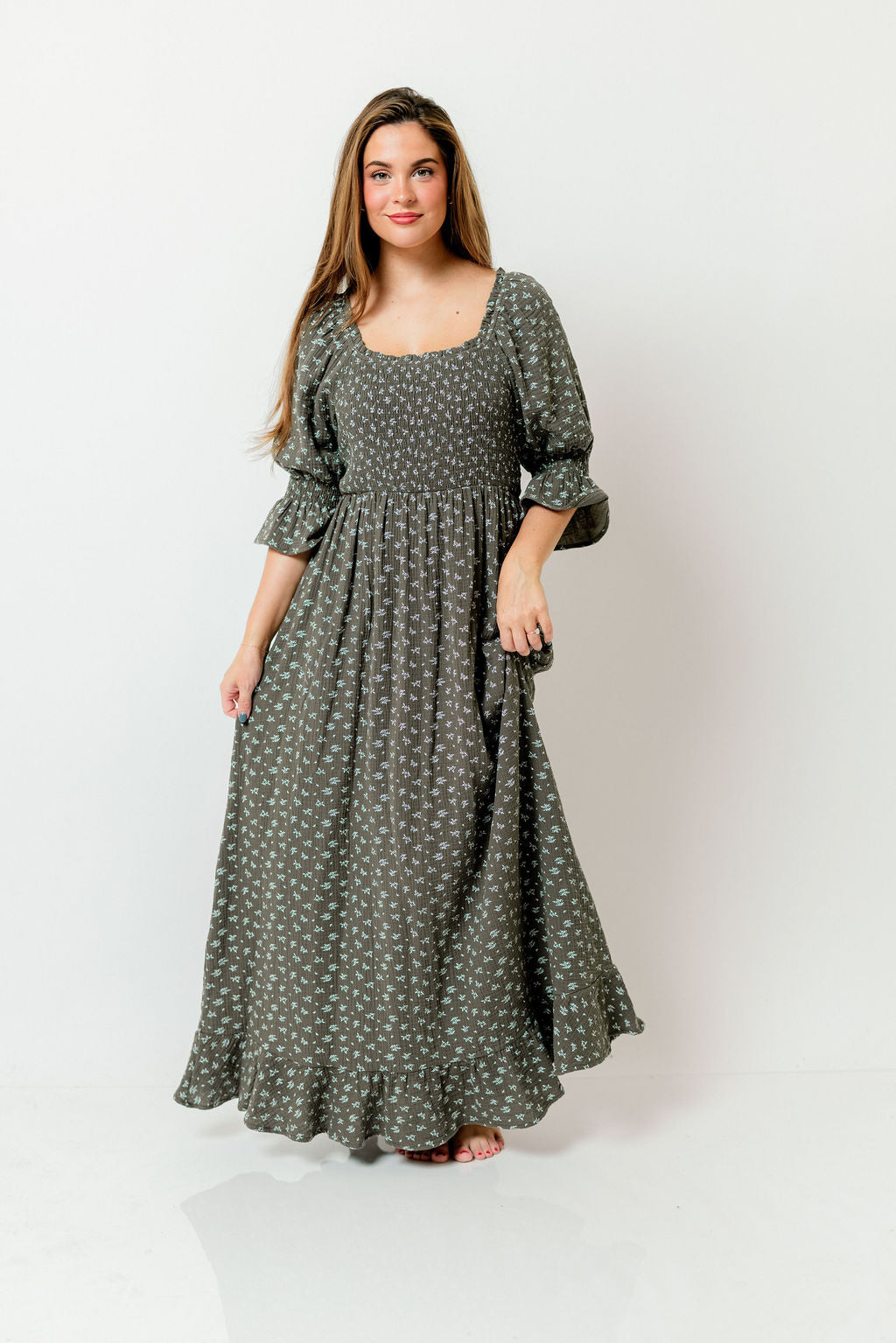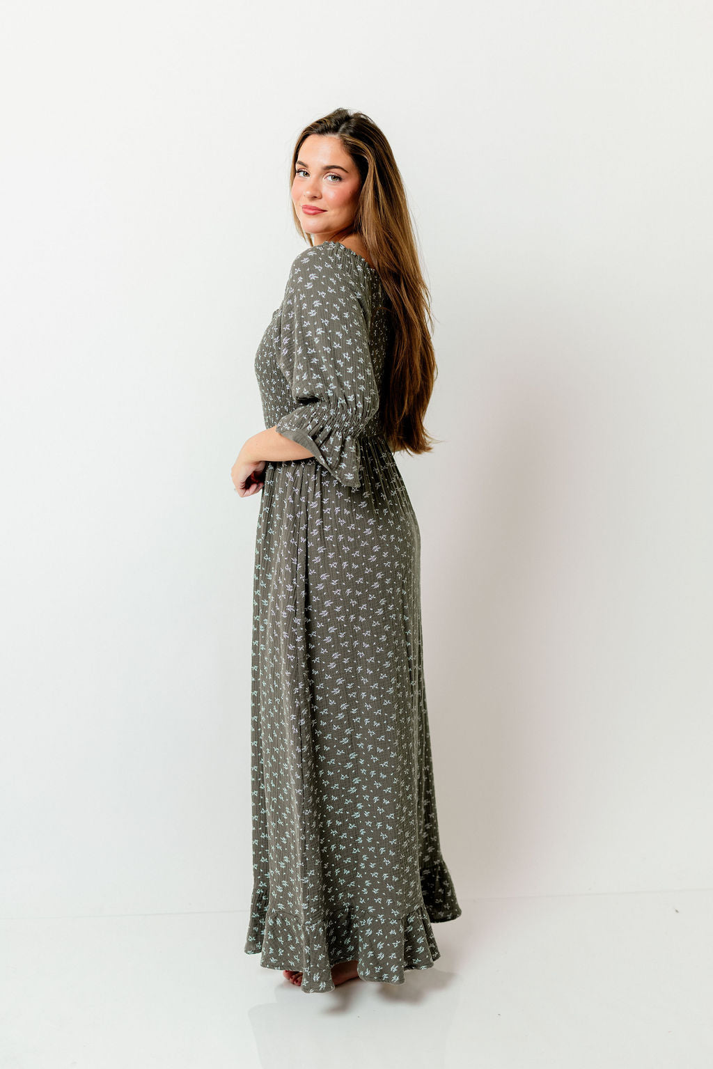 GARMENT DETAILS: Elegant, lightweight maxi dress in a darling foliage print, with stretchy neckline that can be worn on or off the shoulder. Features 3/4 length puffed sleeves with ruffle, and a stretchy, smocked bodice.