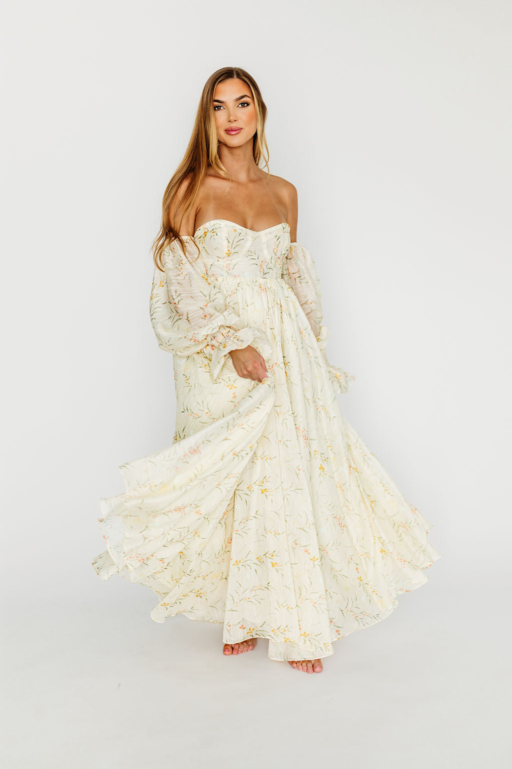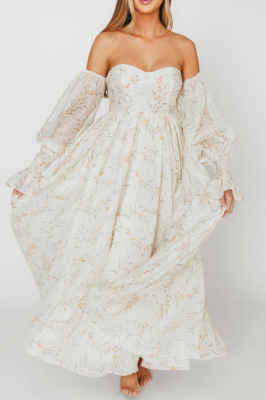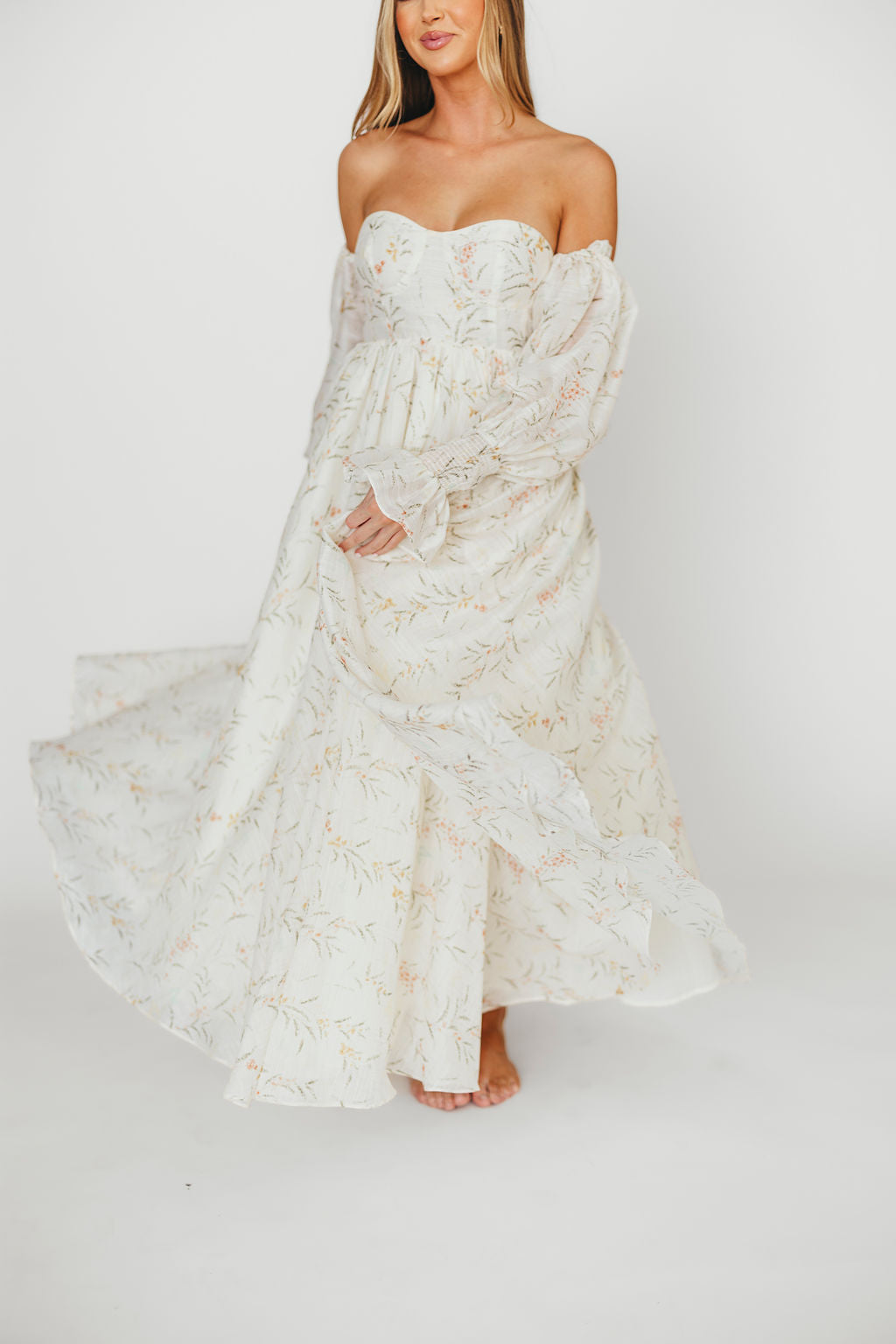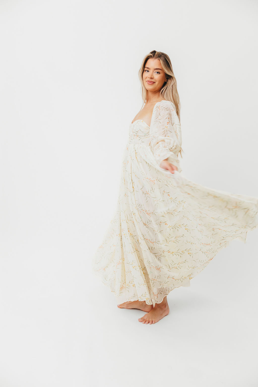 GARMENT DETAILS: Premium floral maxi dress in a lightweight, shirred chiffon. Features a soft bustier-style bodice (no boning), sweetheart neckline, smocked back panel, and sheer long sleeves with elastic cuffs and ruffles. Sleeves can be worn on or off the shoulder. Finished with a sweeping maxi-length skirt. Lined.