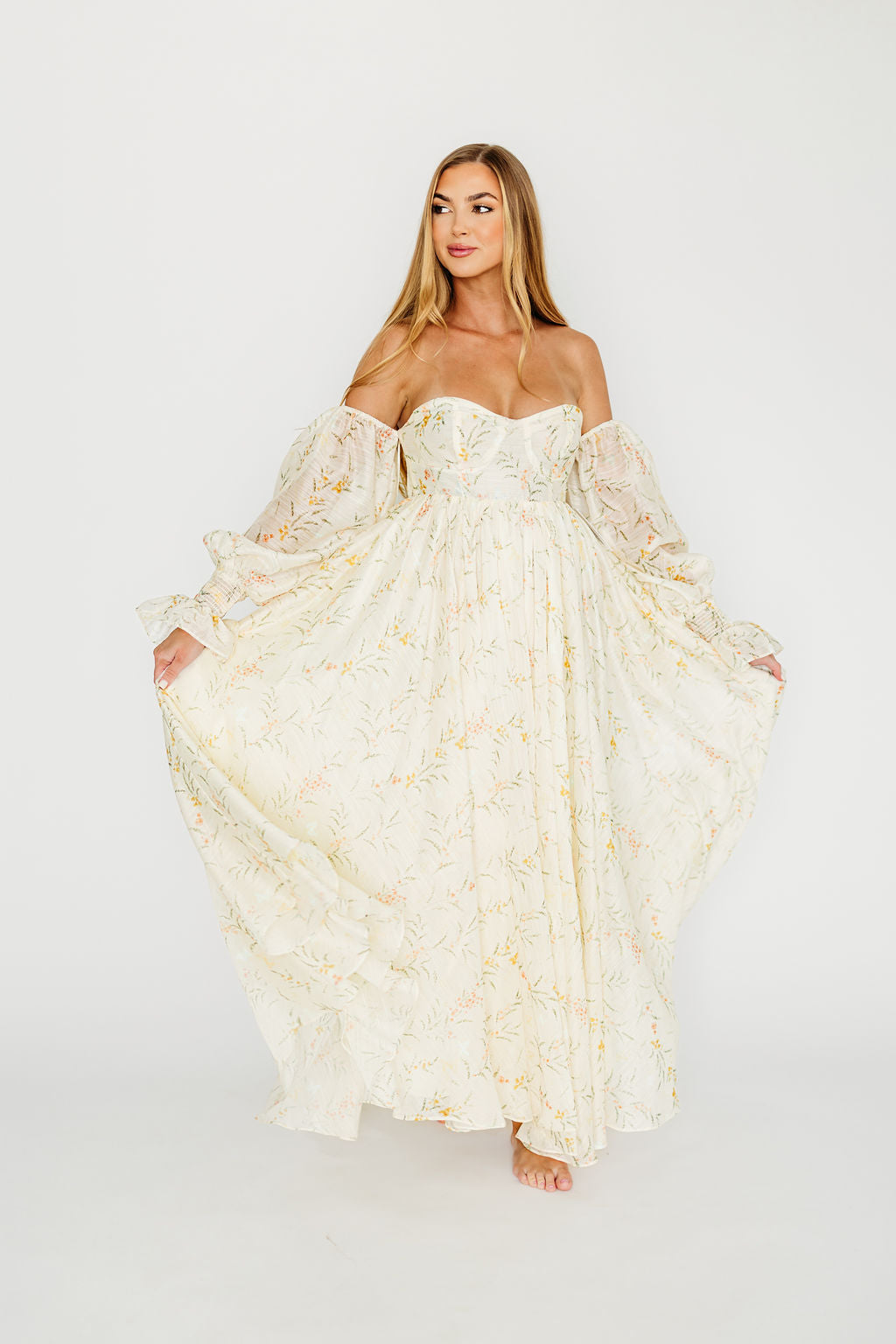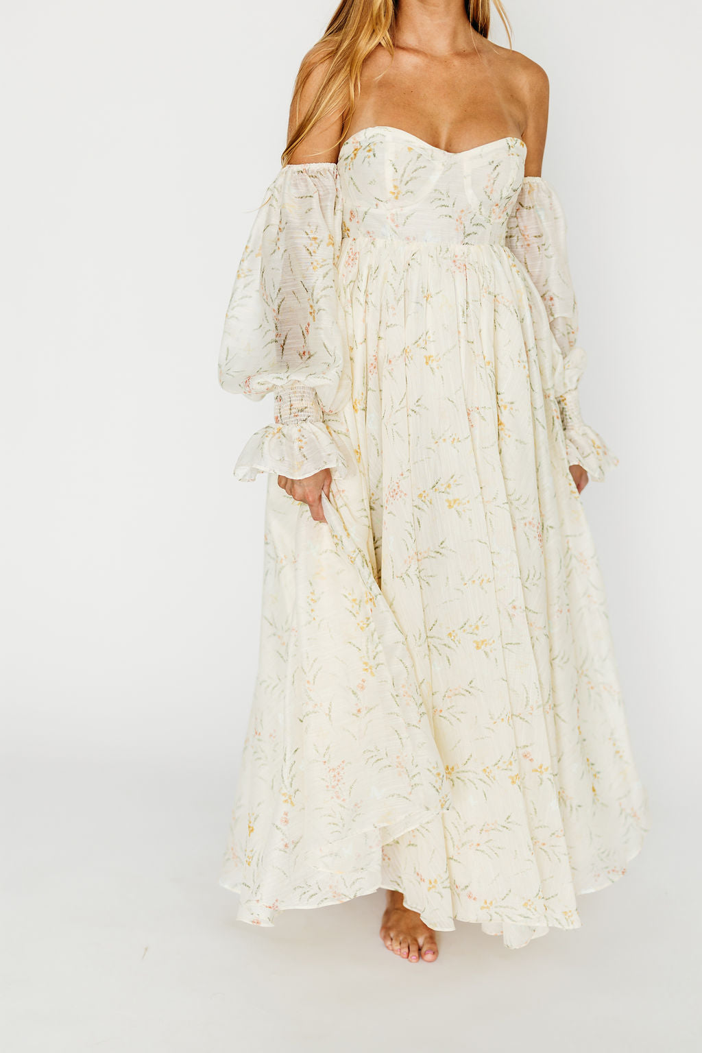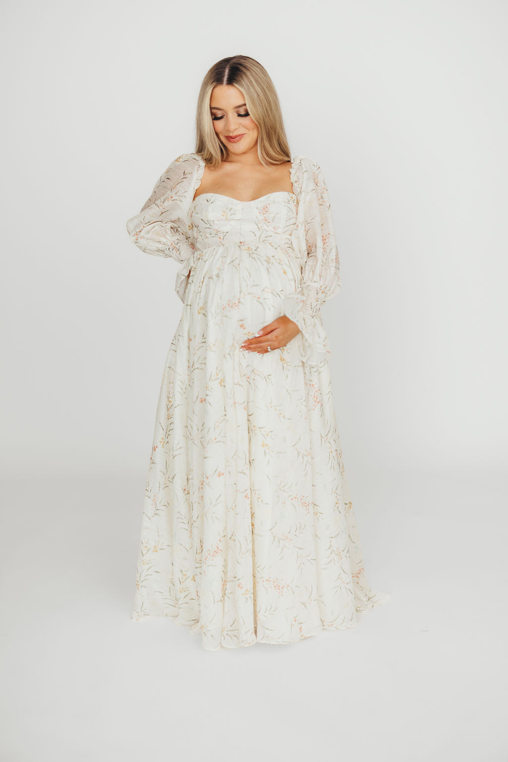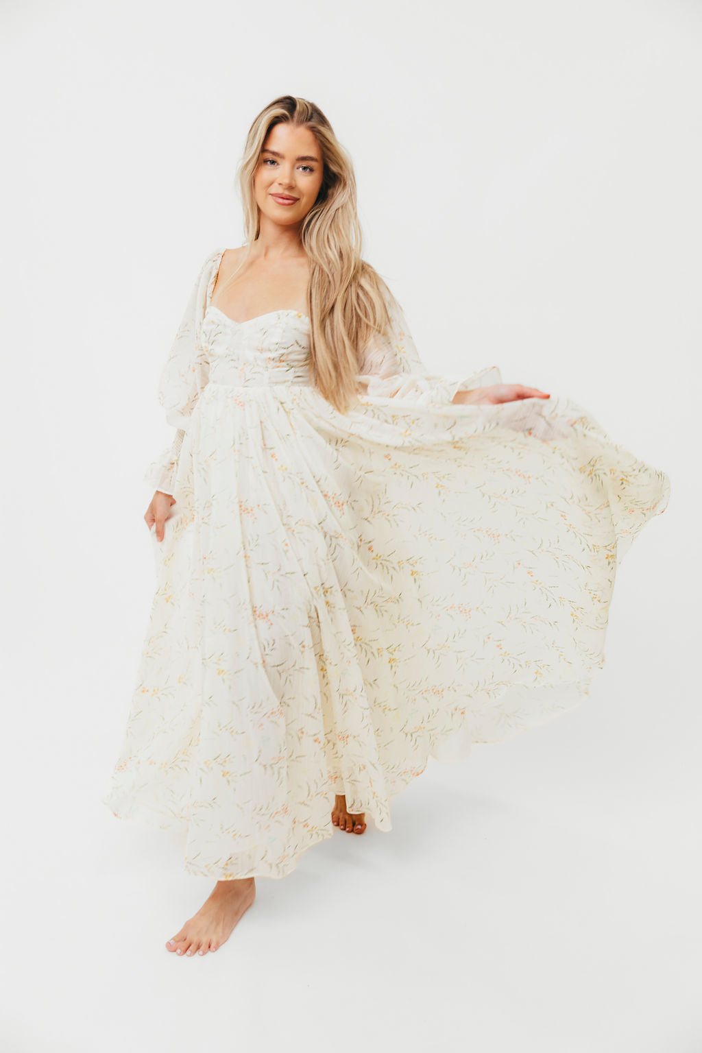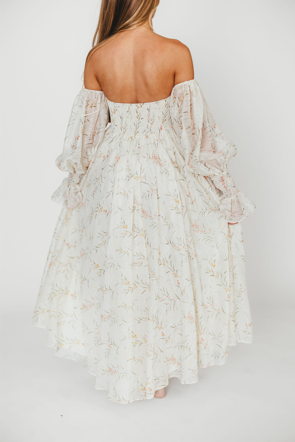 GARMENT DETAILS: Premium floral maxi dress in a lightweight, shirred chiffon. Features a soft bustier-style bodice (no boning), sweetheart neckline, smocked back panel, and sheer long sleeves with elastic cuffs and ruffles. Sleeves can be worn on or off the shoulder. Finished with a sweeping maxi-length skirt. Lined.