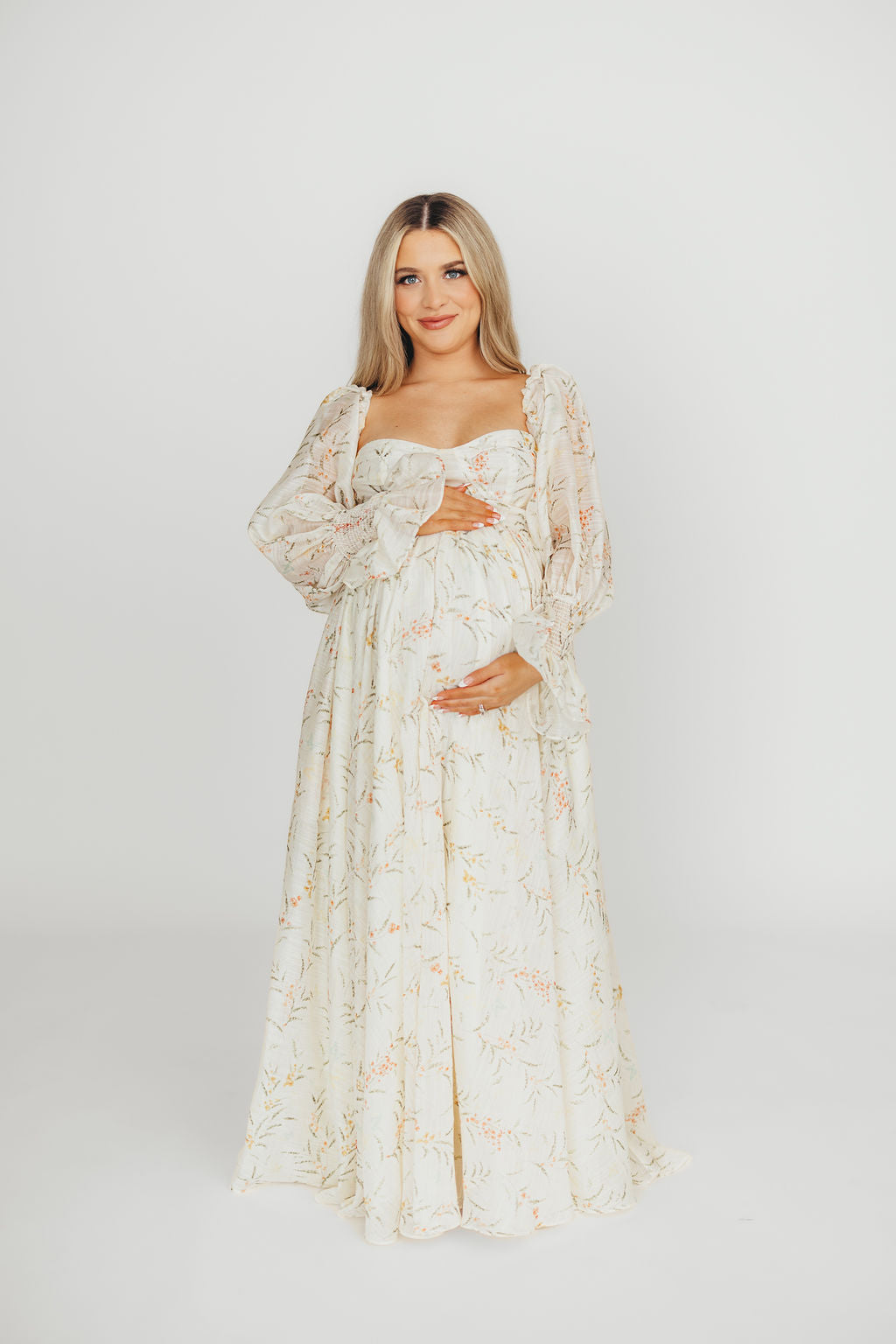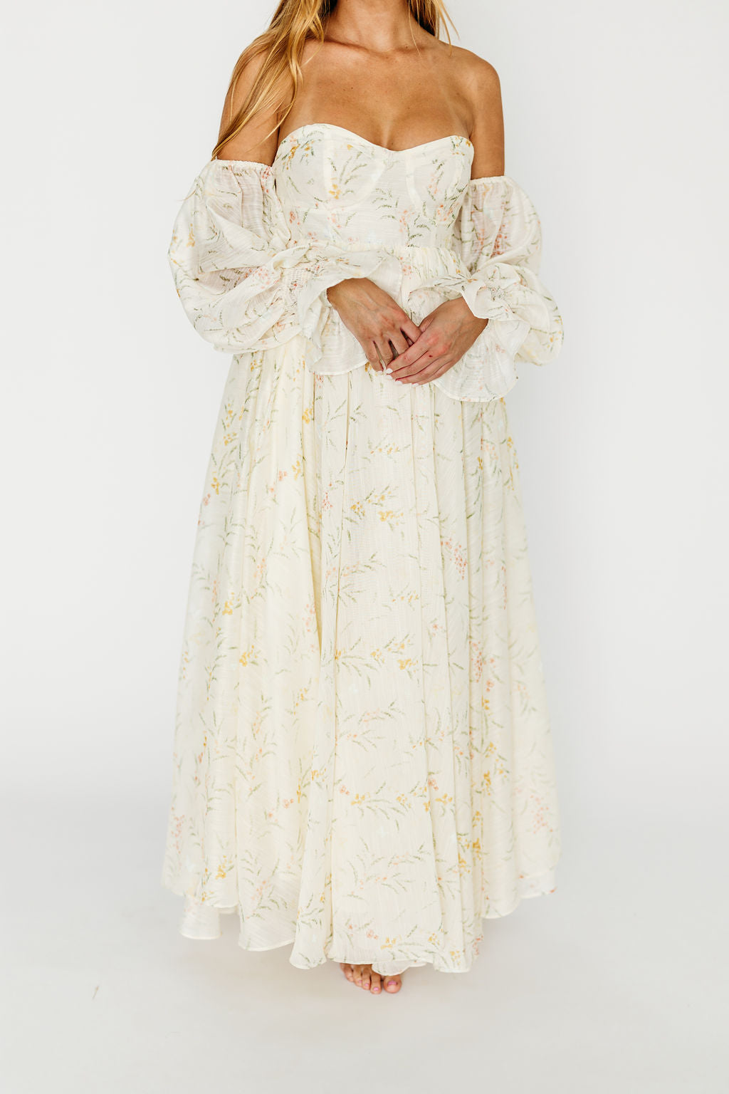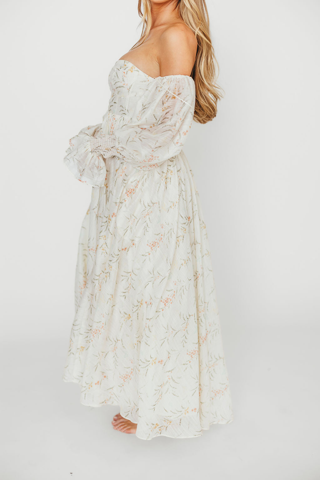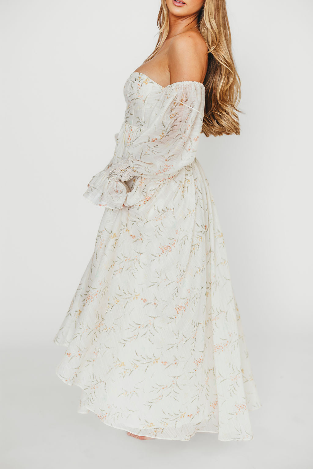 GARMENT DETAILS: Premium floral maxi dress in a lightweight, shirred chiffon. Features a soft bustier-style bodice (no boning), sweetheart neckline, smocked back panel, and sheer long sleeves with elastic cuffs and ruffles. Sleeves can be worn on or off the shoulder. Finished with a sweeping maxi-length skirt. Lined.