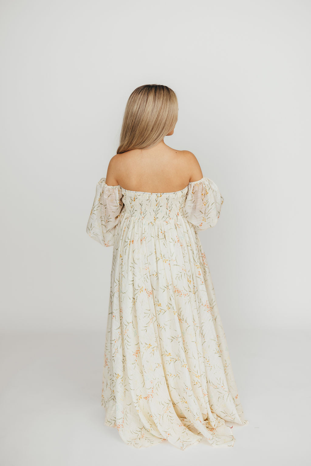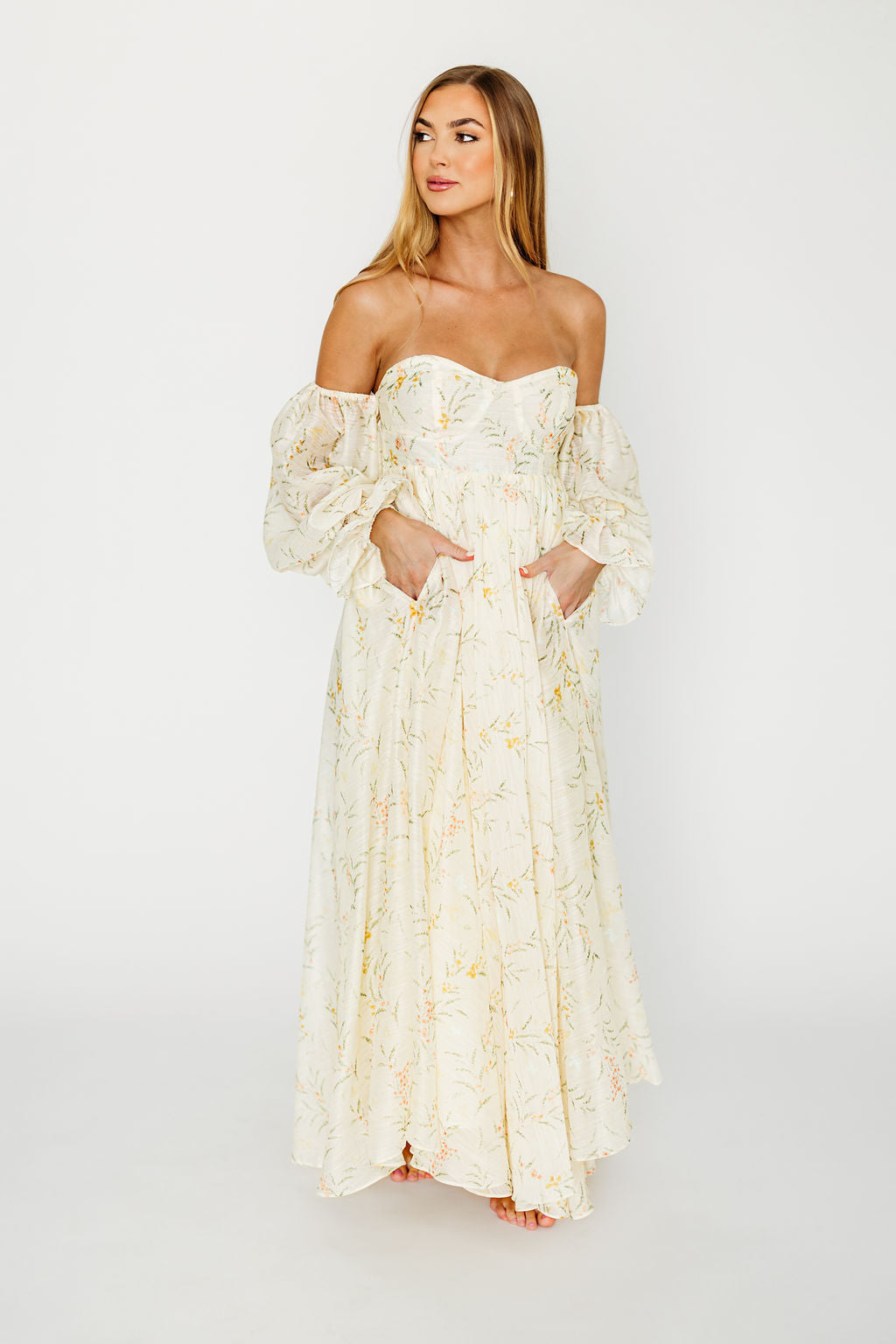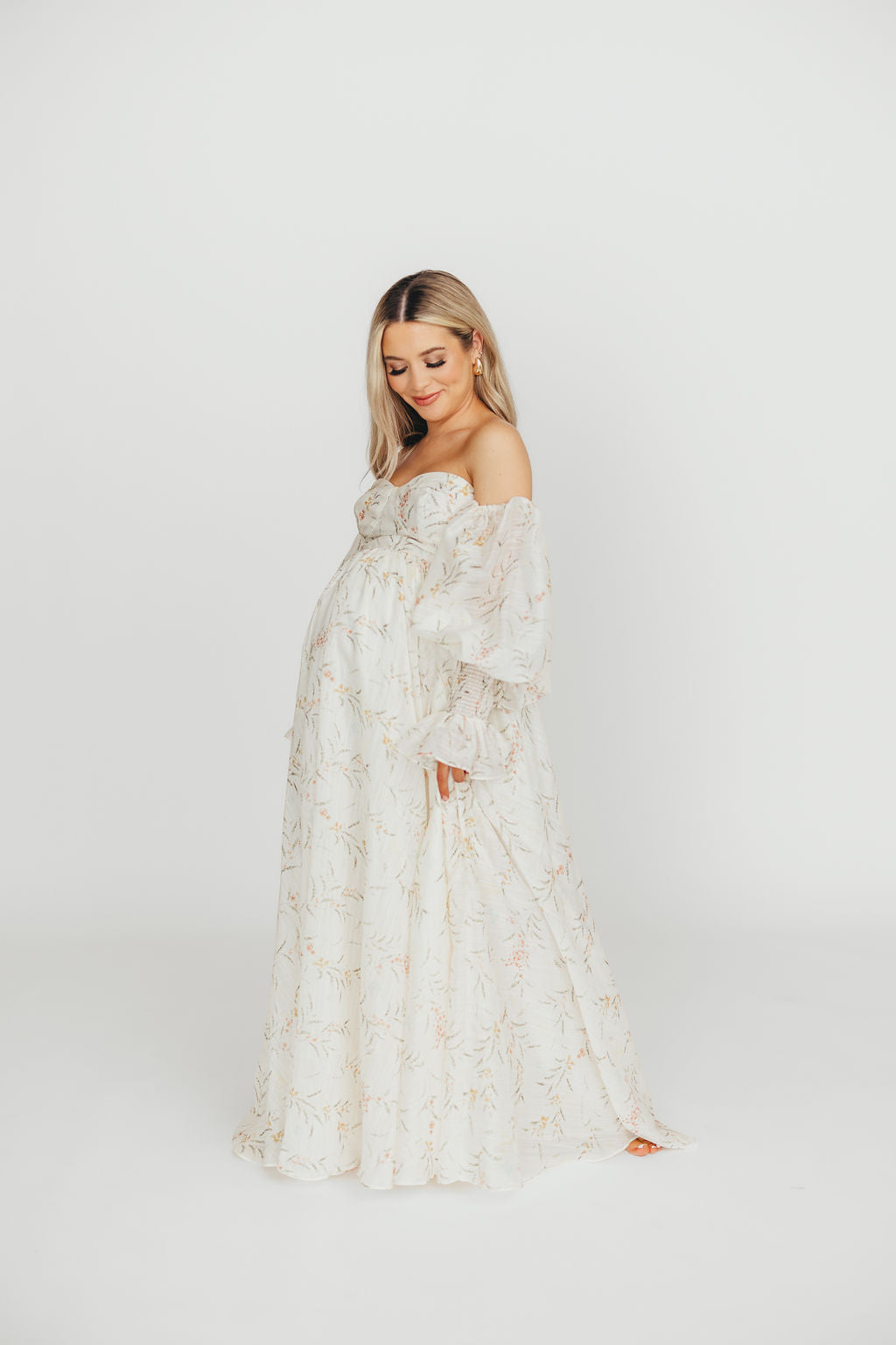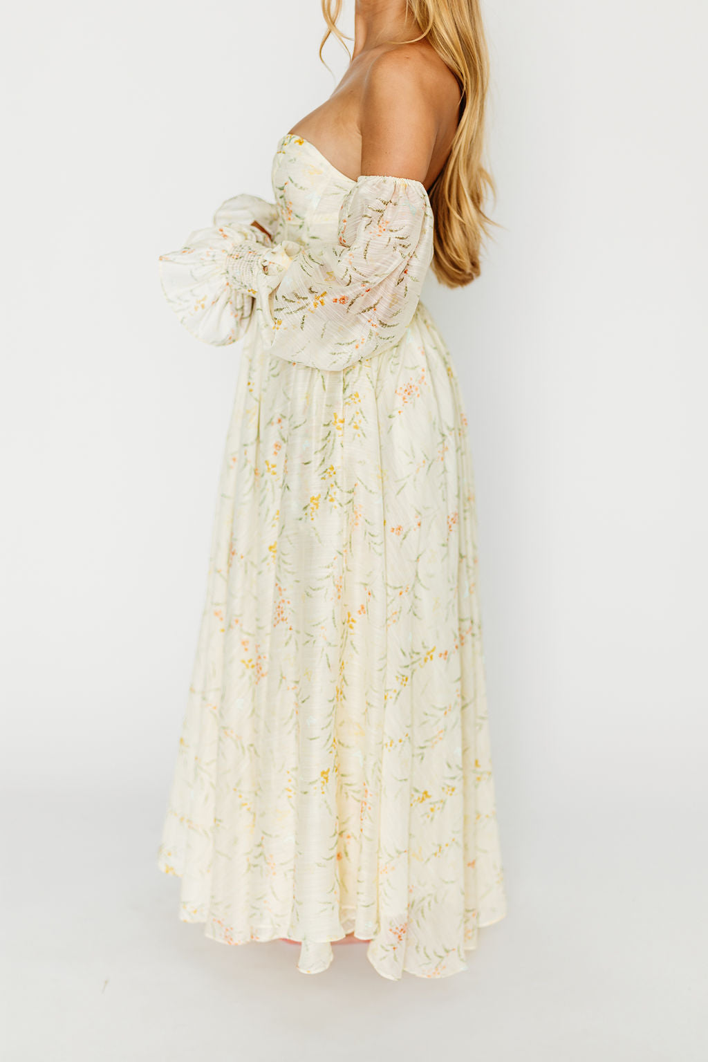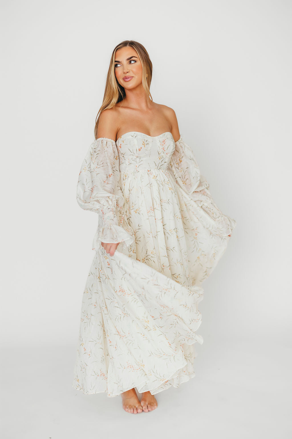 GARMENT DETAILS: Premium floral maxi dress in a lightweight, shirred chiffon. Features a soft bustier-style bodice (no boning), sweetheart neckline, smocked back panel, and sheer long sleeves with elastic cuffs and ruffles. Sleeves can be worn on or off the shoulder. Finished with a sweeping maxi-length skirt. Lined.