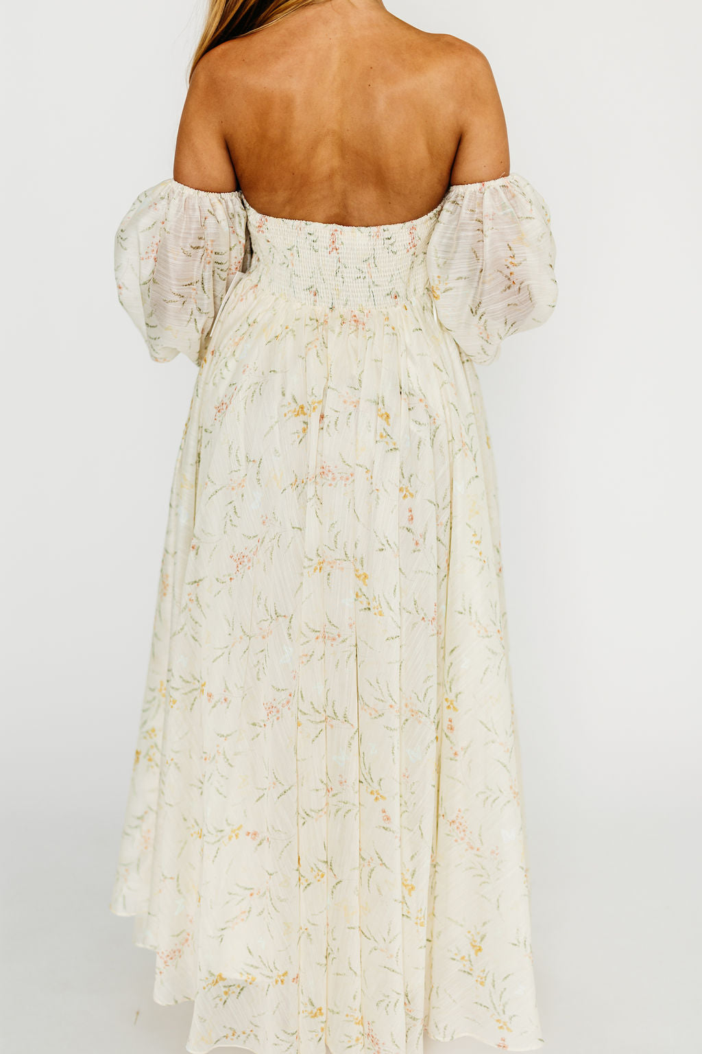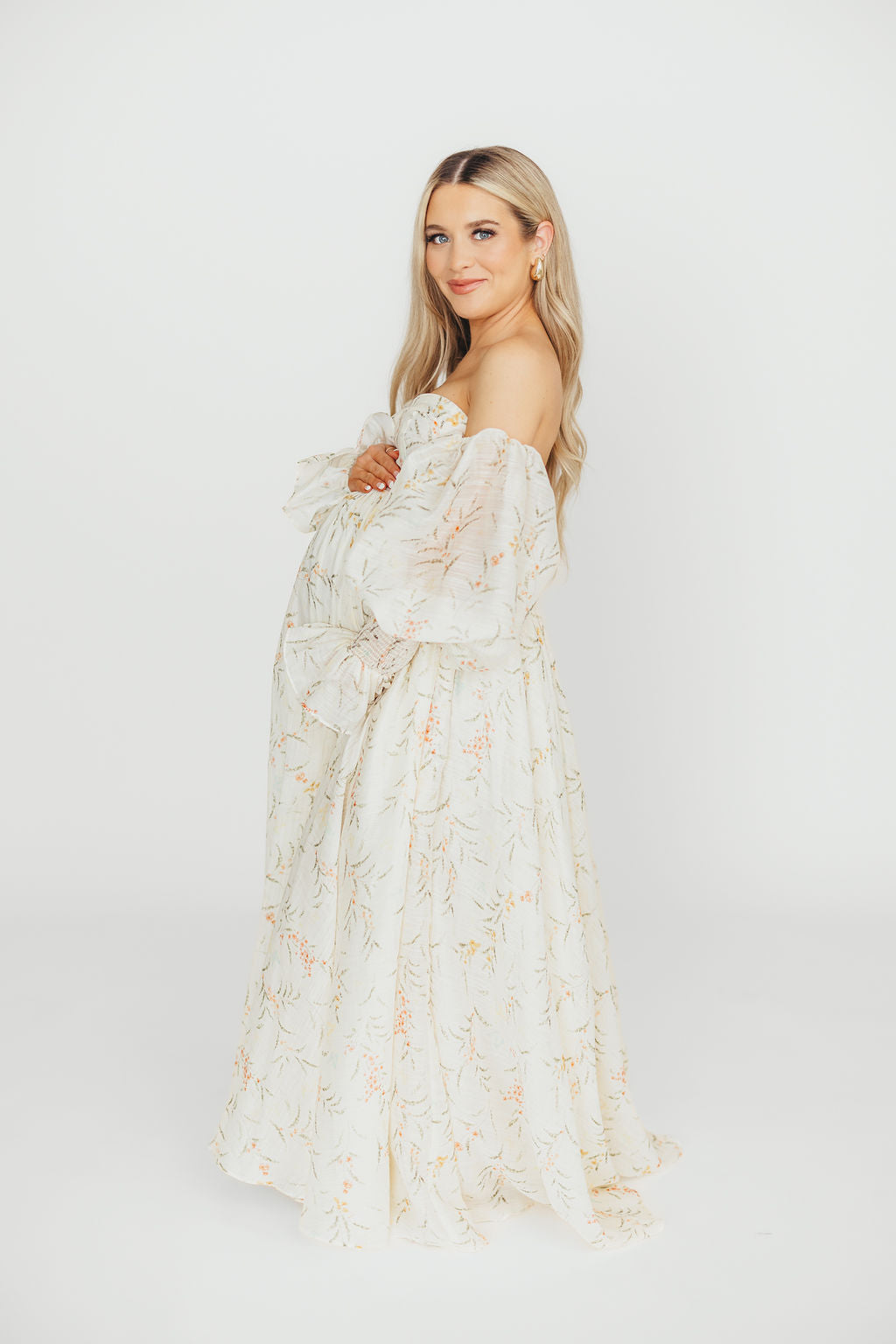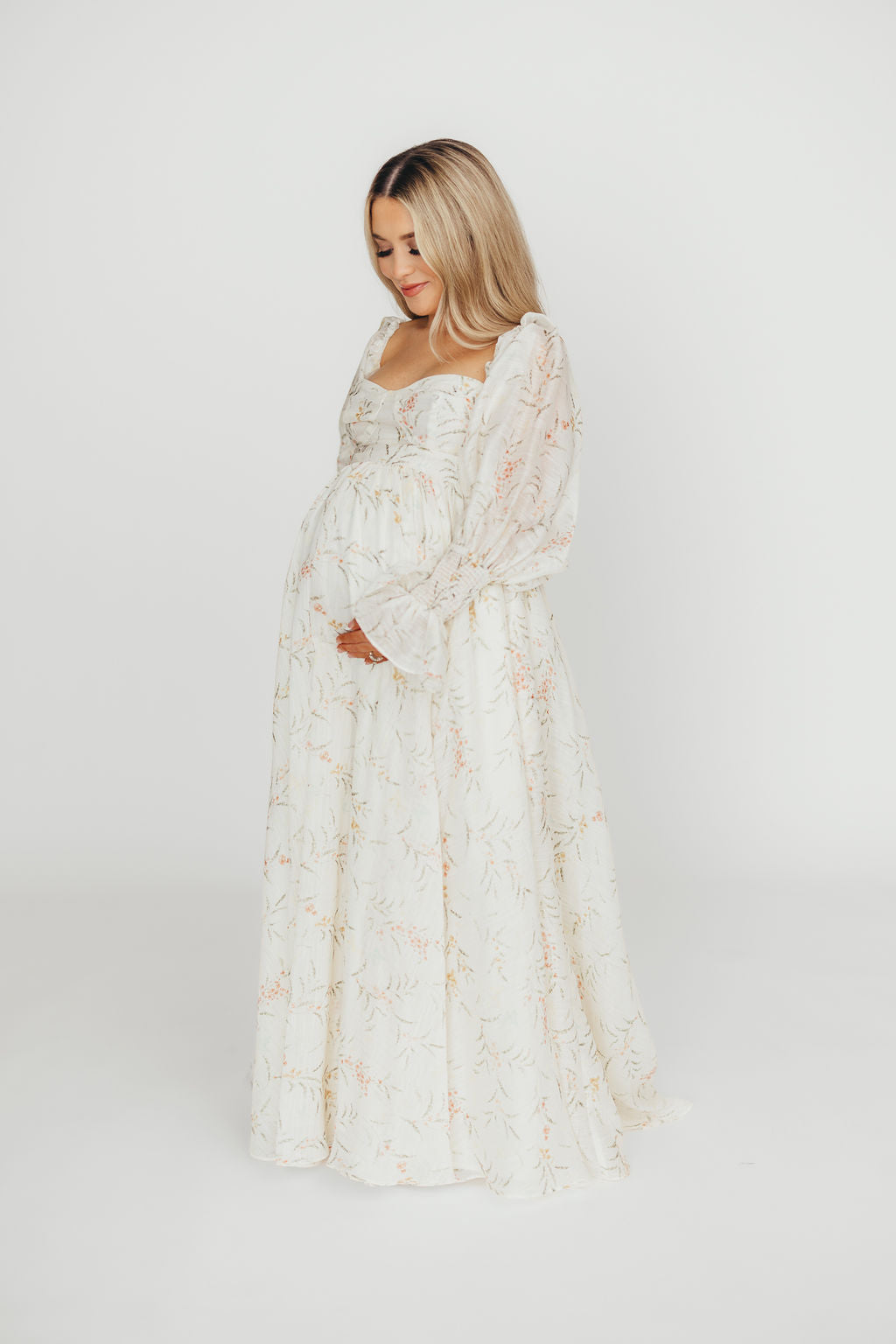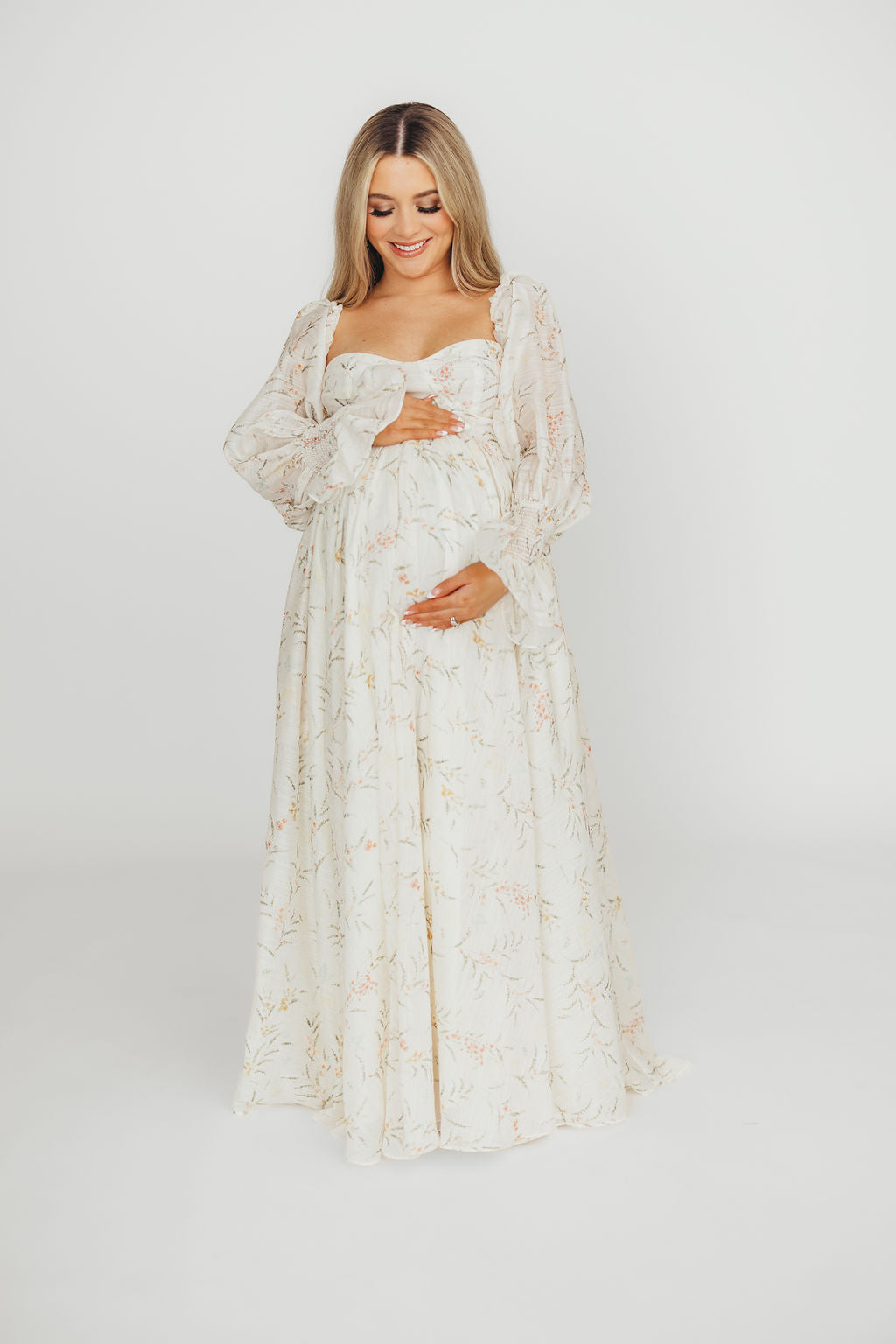 GARMENT DETAILS: Premium floral maxi dress in a lightweight, shirred chiffon. Features a soft bustier-style bodice (no boning), sweetheart neckline, smocked back panel, and sheer long sleeves with elastic cuffs and ruffles. Sleeves can be worn on or off the shoulder. Finished with a sweeping maxi-length skirt. Lined.