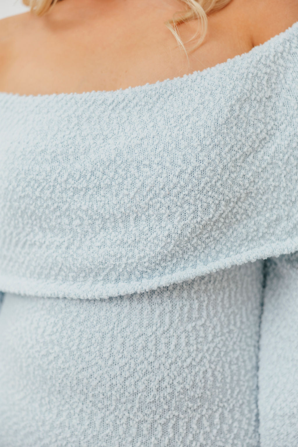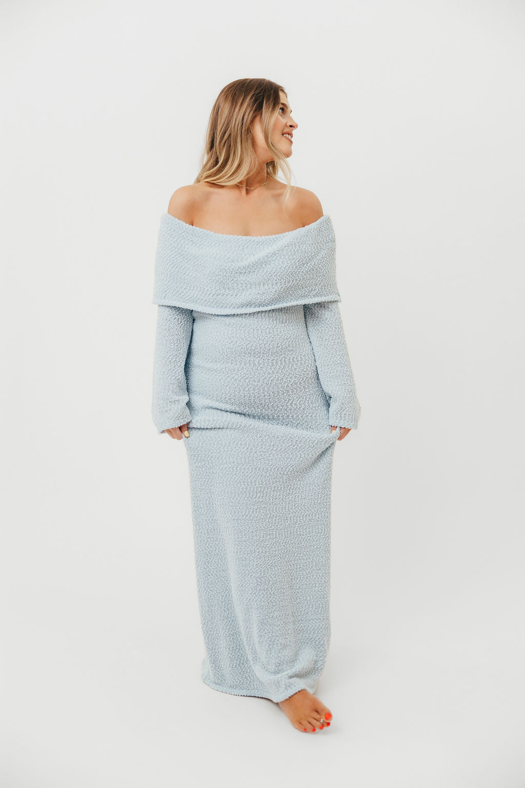 GARMENT DETAILS: Gorgeous chenille-like knit maxi dress with folded off-the-shoulder neckline, flared long sleeves, and a fit-and-flare skirt. Features a full lining (neck to hem) but still very lightweight.