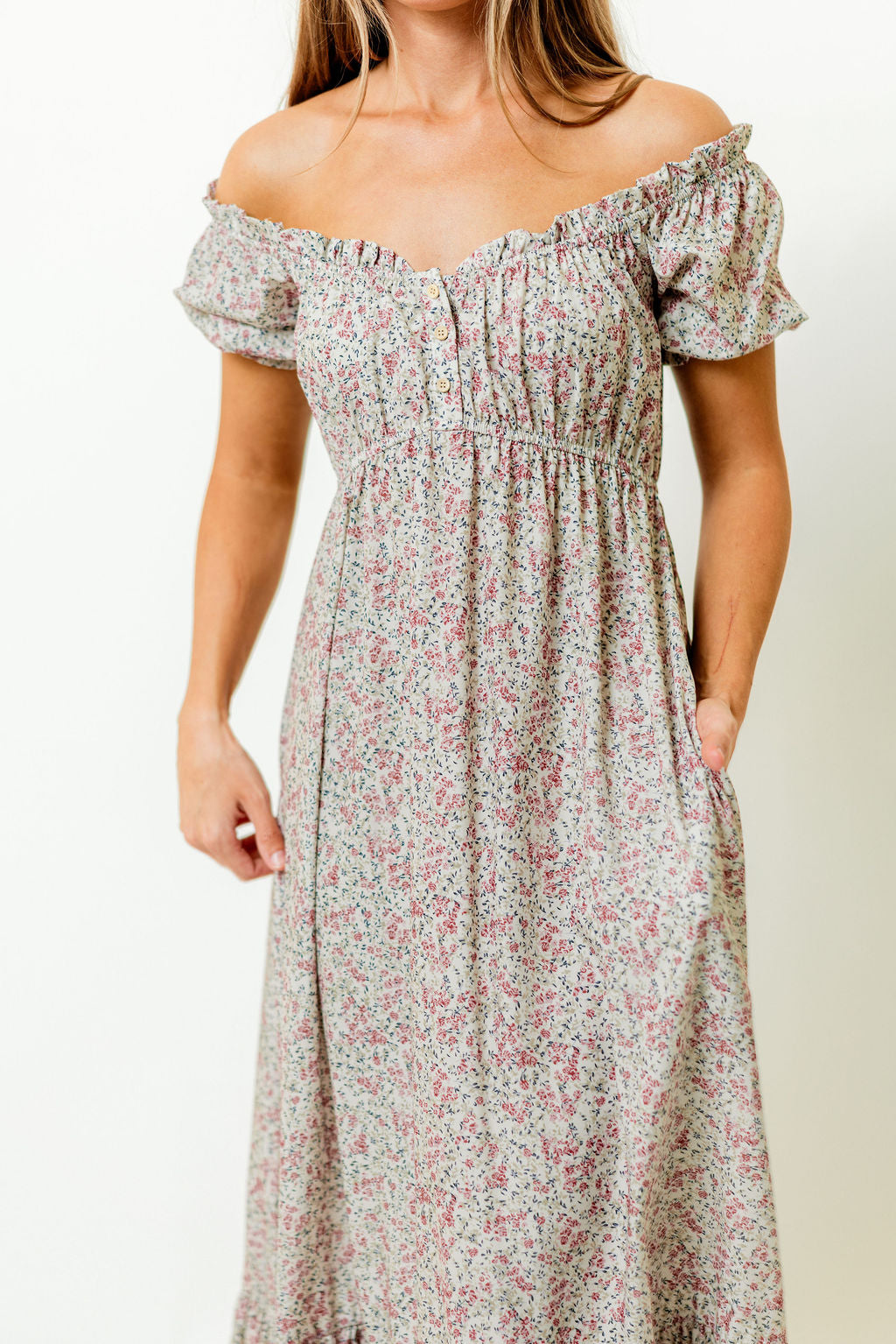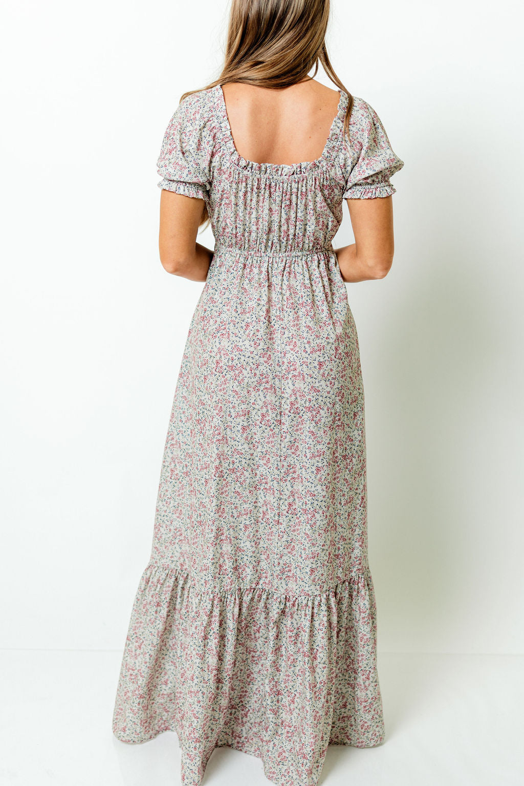 GARMENT DETAILS: Elegant maxi dress with scooped, elasticated neckline, puffed short sleeves, and gathered bodice. Features dainty wooden front buttons, adjustable neckline, and ruffled details, with an extra-wide, tiered skirt. Finished with side pockets.
