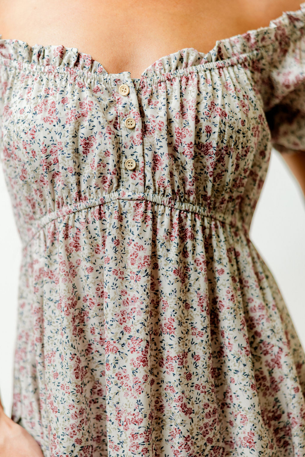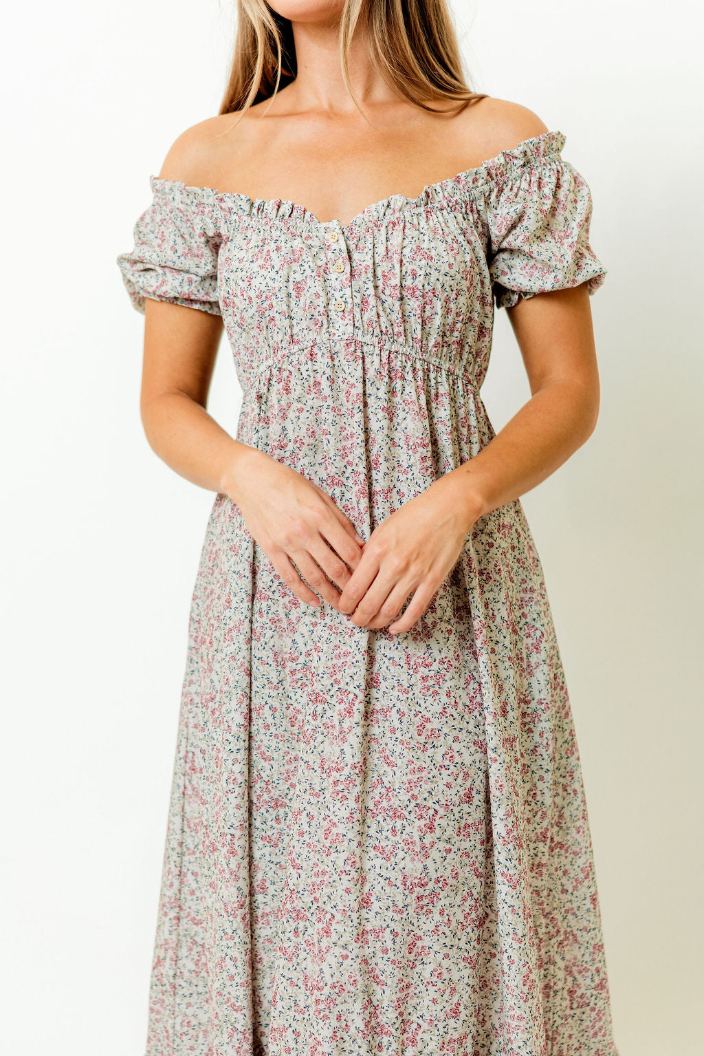 Florals meet feminine elegance in the new Valeria Maxi Dress! This stunning gown is the very definition of romance; it offers a gorgeous smocked bodice, dainty wooden buttons, and a flattering fit with an adjustable neckline. We love that you can pair the Valeria with a cardigan and boots for a festive Christmas matinee, or style her with sandals and a straw hat for summer strawberry-picking. You'll love this one year round!