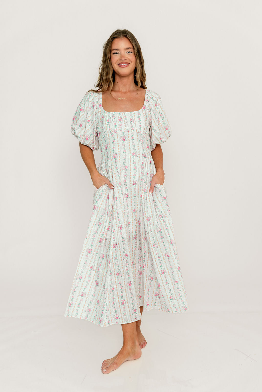Amalia 100% Cotton Floral Puff Sleeve Midi Dress in Natural/Pink