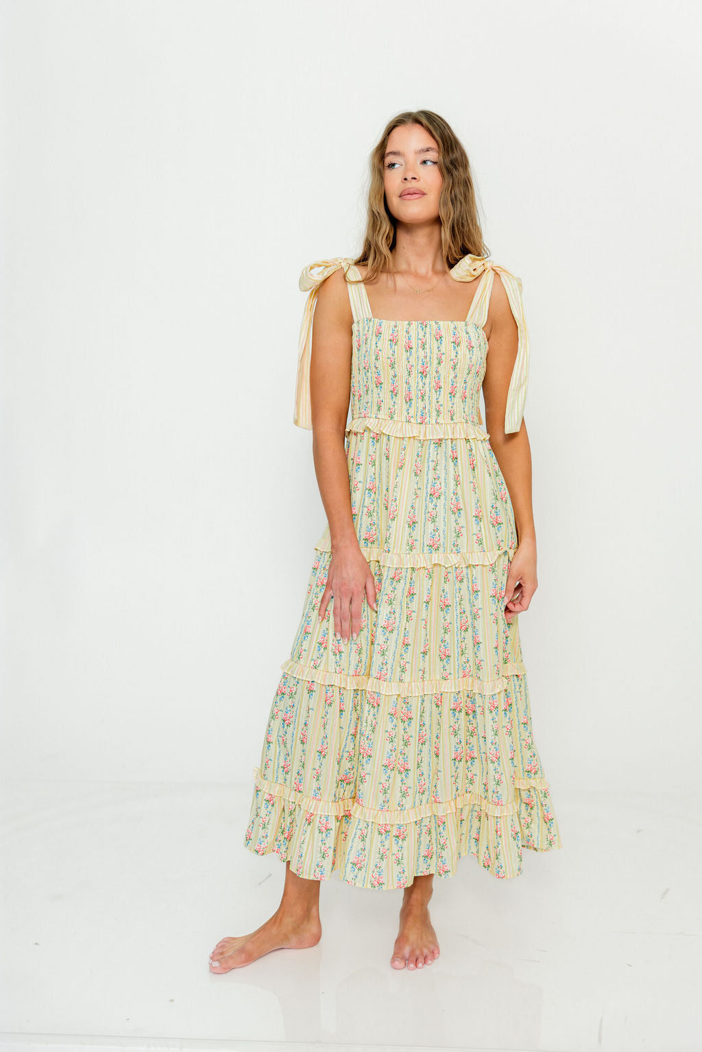 Maley Floral Maxi Dress with Tie Straps in Light Yellow Multi