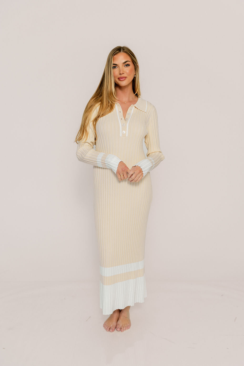 Kris Colorblock Polo Rib-Knit Maxi Dress in Natural