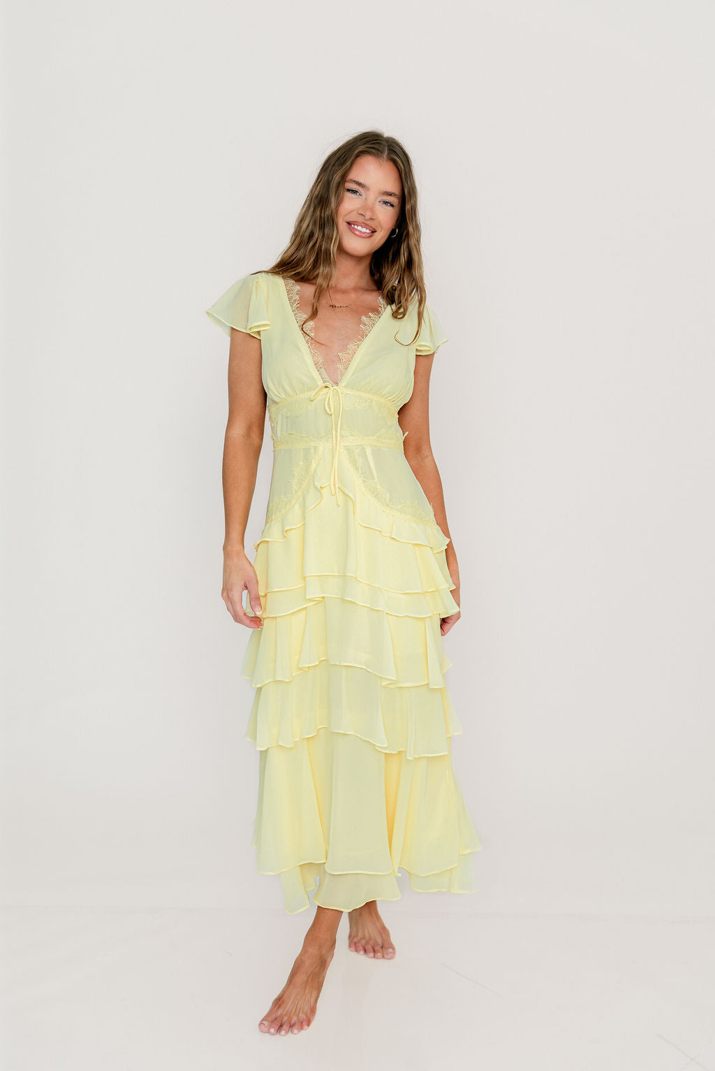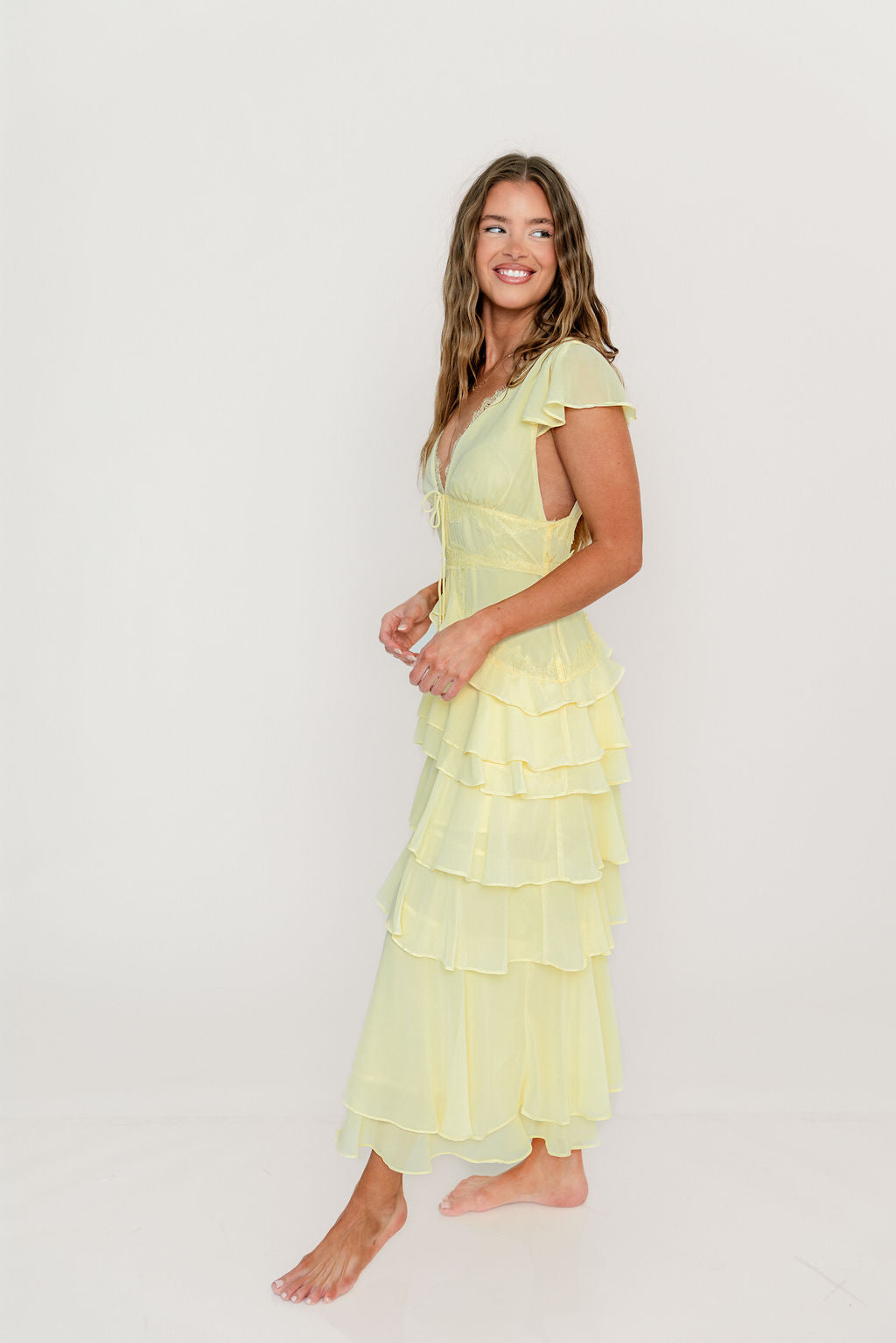 Jessa Tiered Ruffle Midi Dress in Yellow
