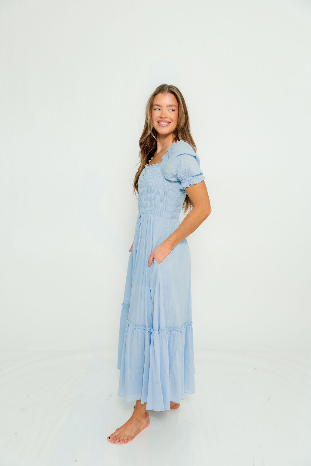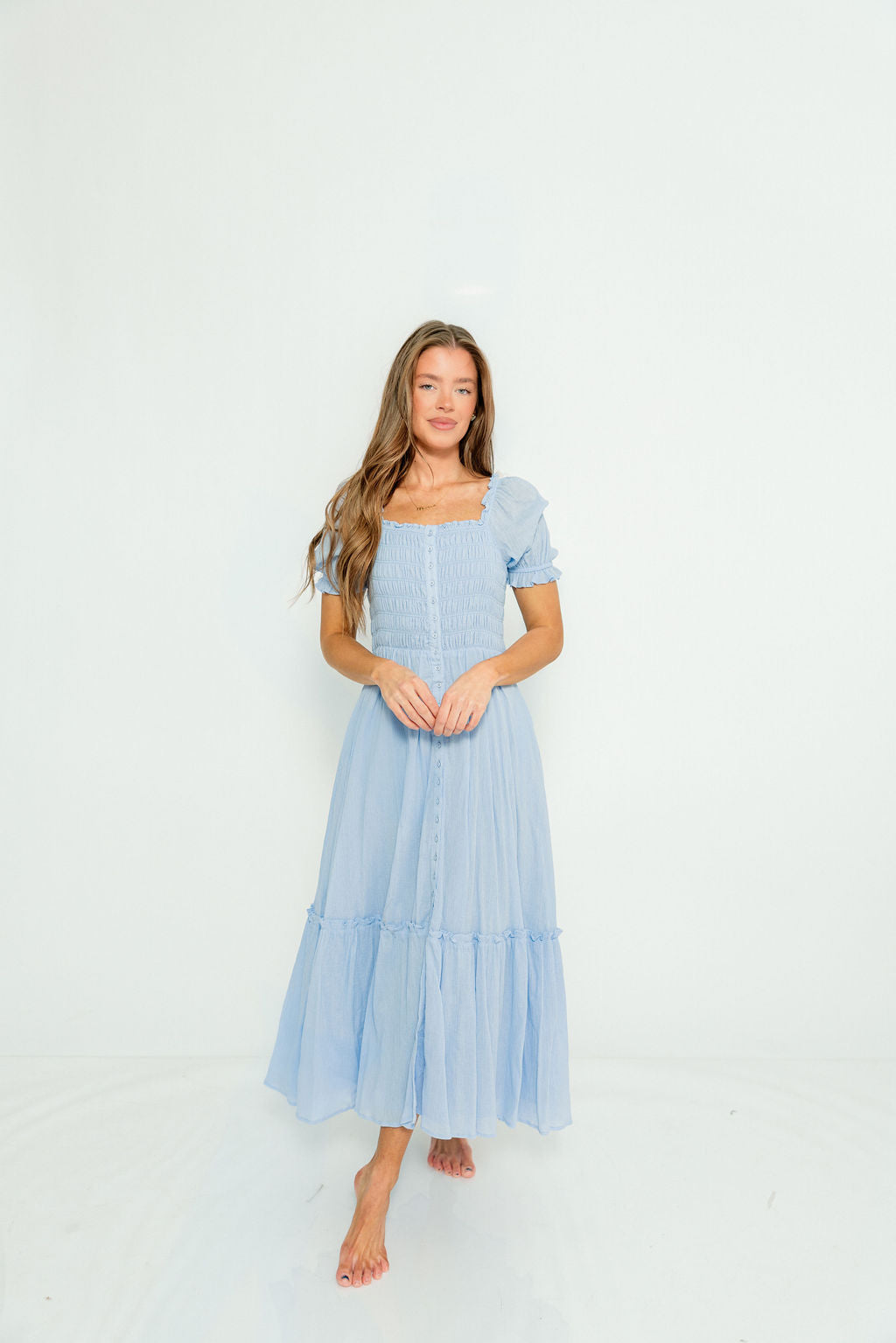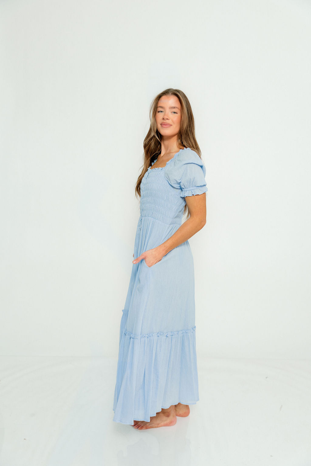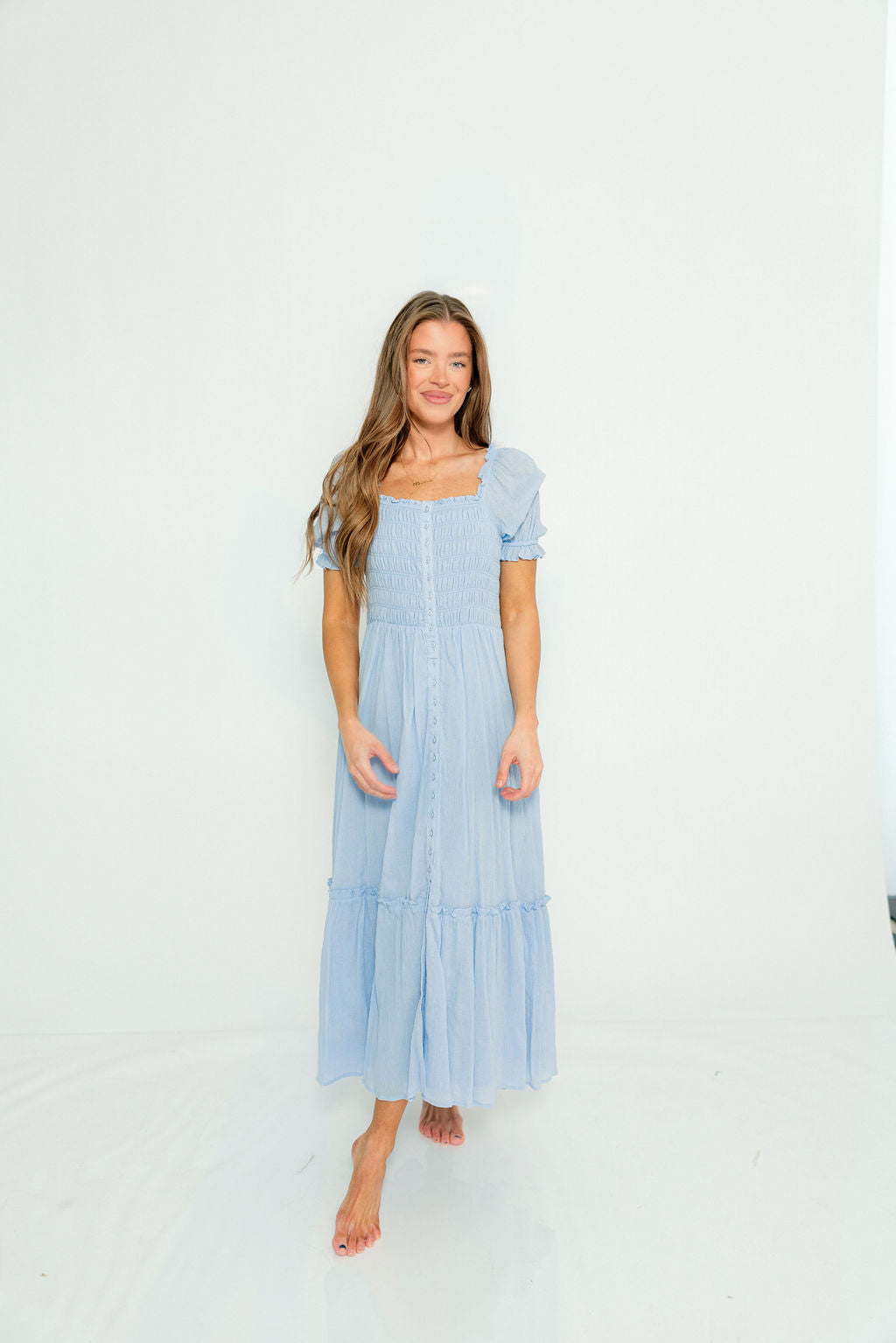 Mara Smocked Button Down Maxi Dress in Blue Aura