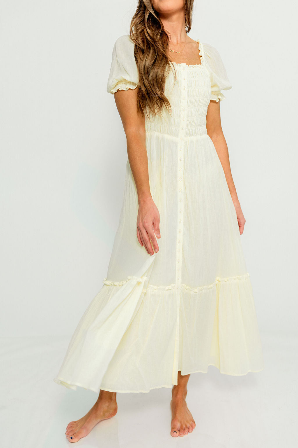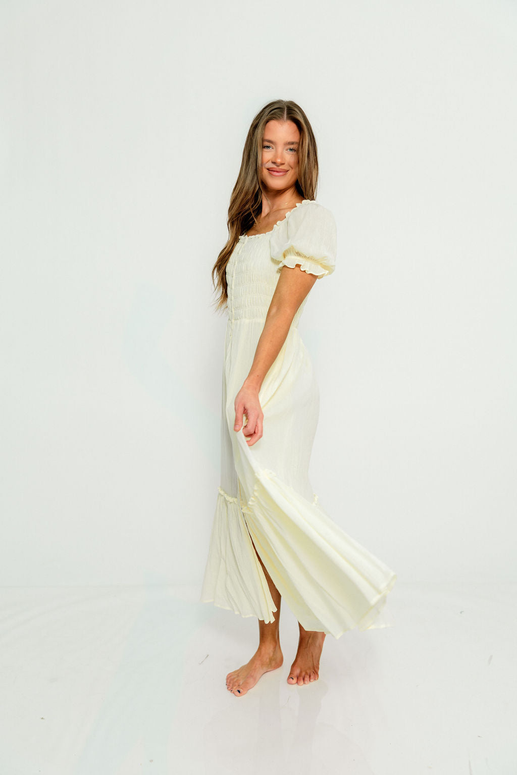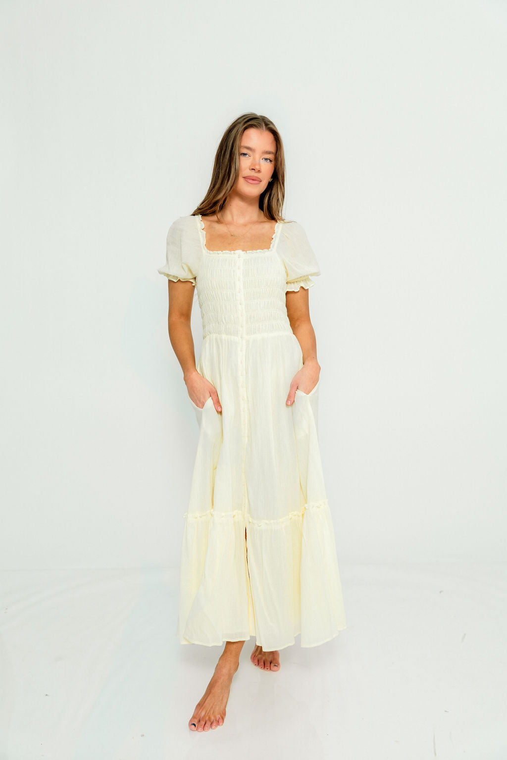 Mara Smocked Button Down Maxi Dress in Lemon Water
