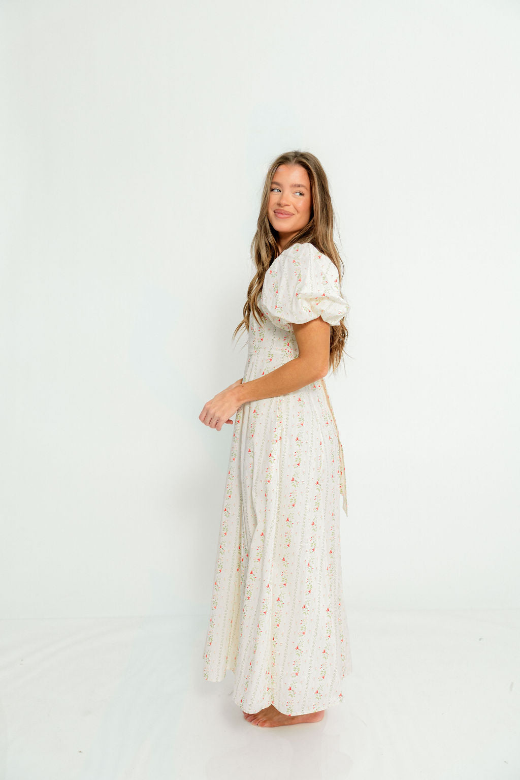 Tate 100% Cotton Floral Print Puff Sleeve Maxi Dress in Cream