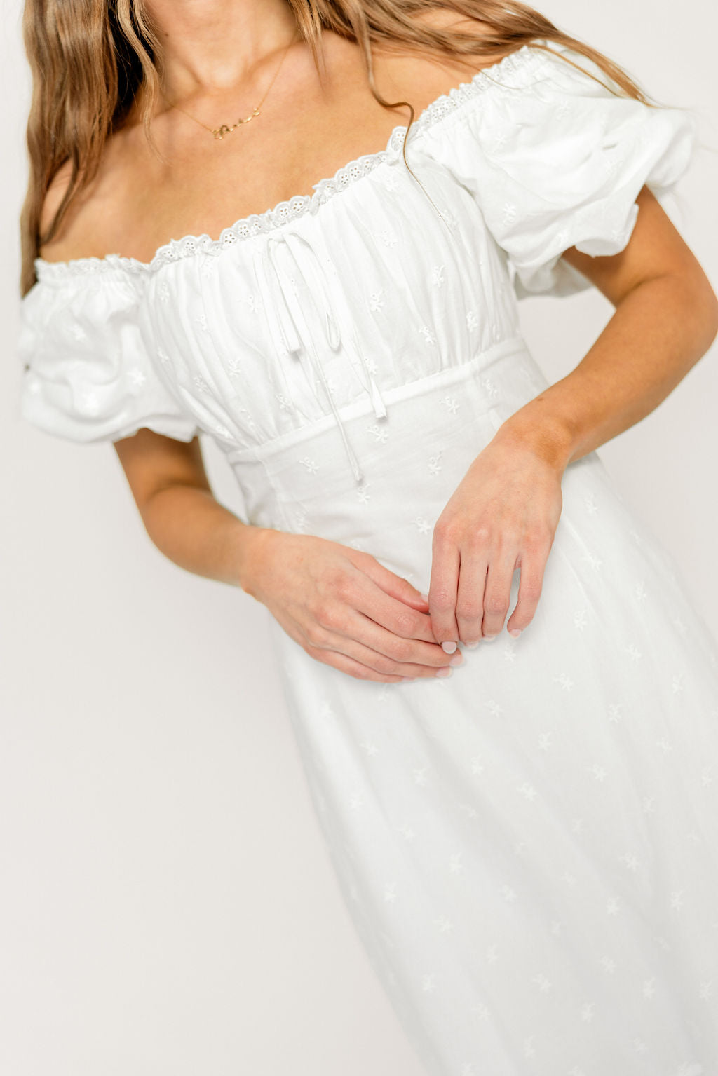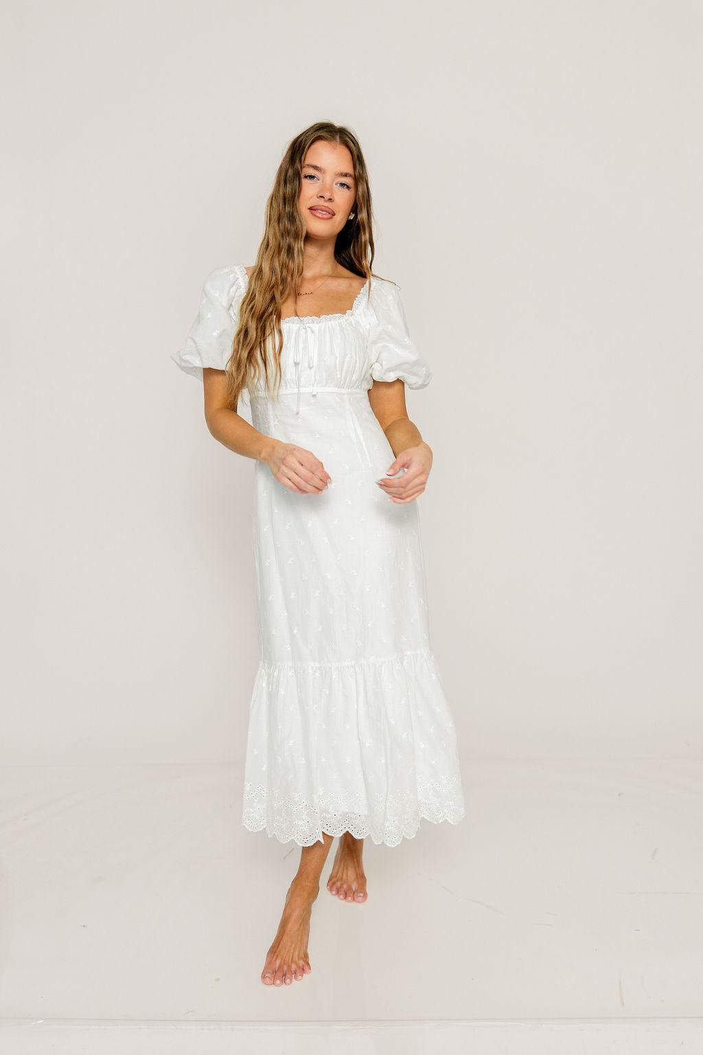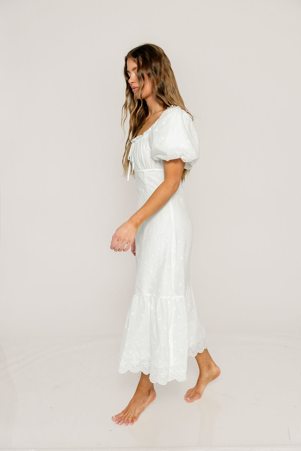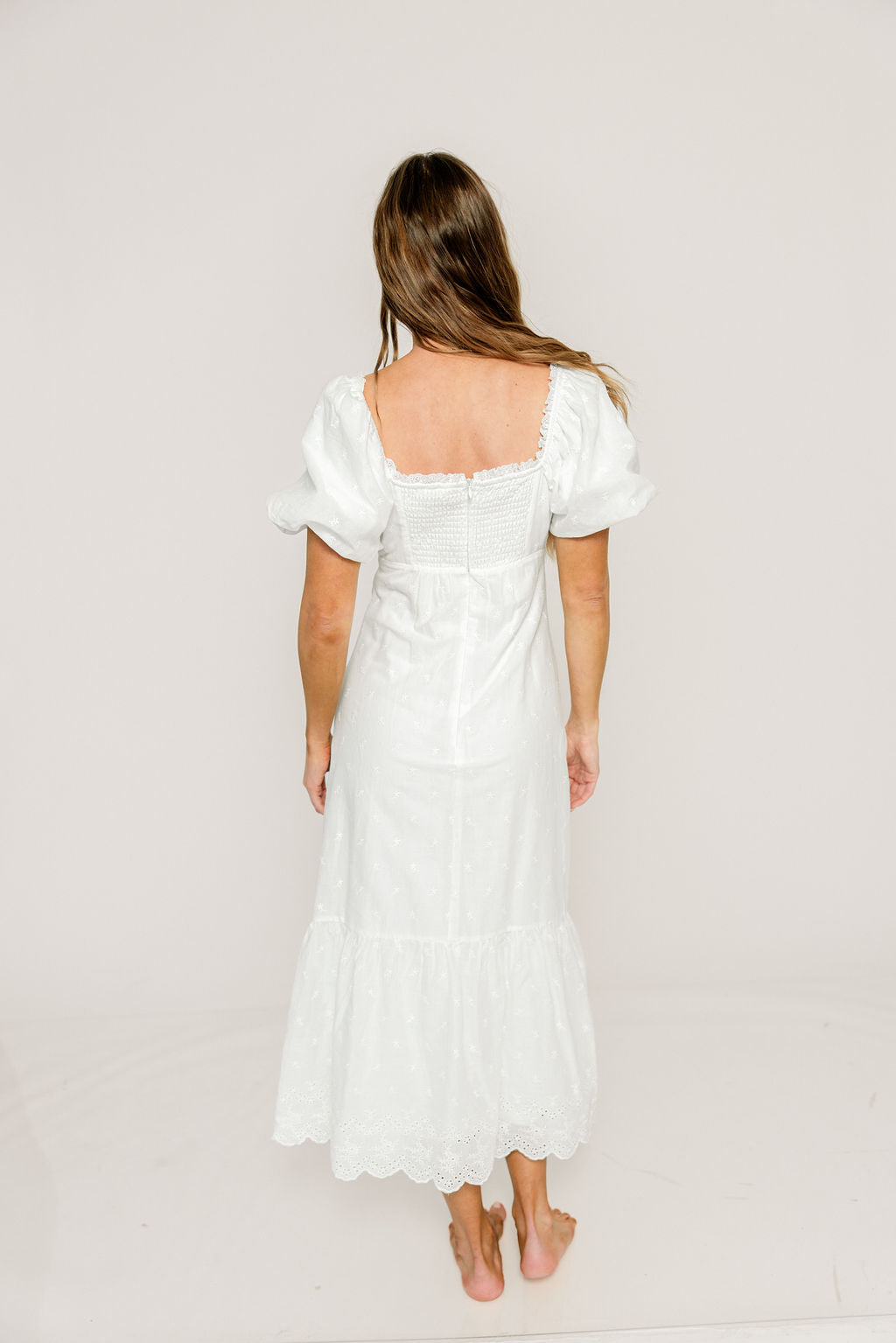 Azaria 100% Cotton Eyelet Puff Sleeve Midi Dress in White Floral