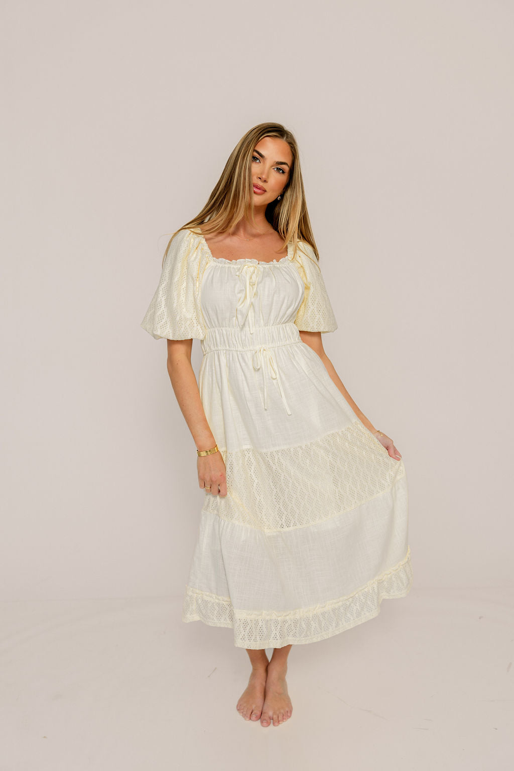 Noor Lace Tiered Midi Dress in Cream