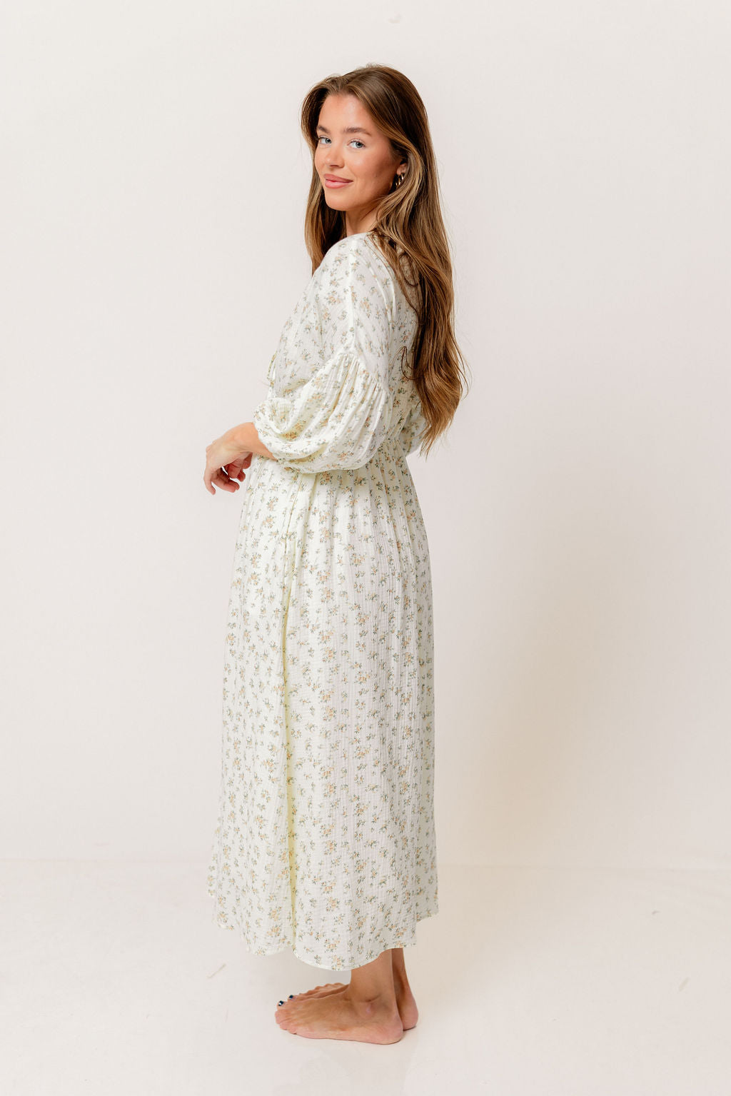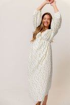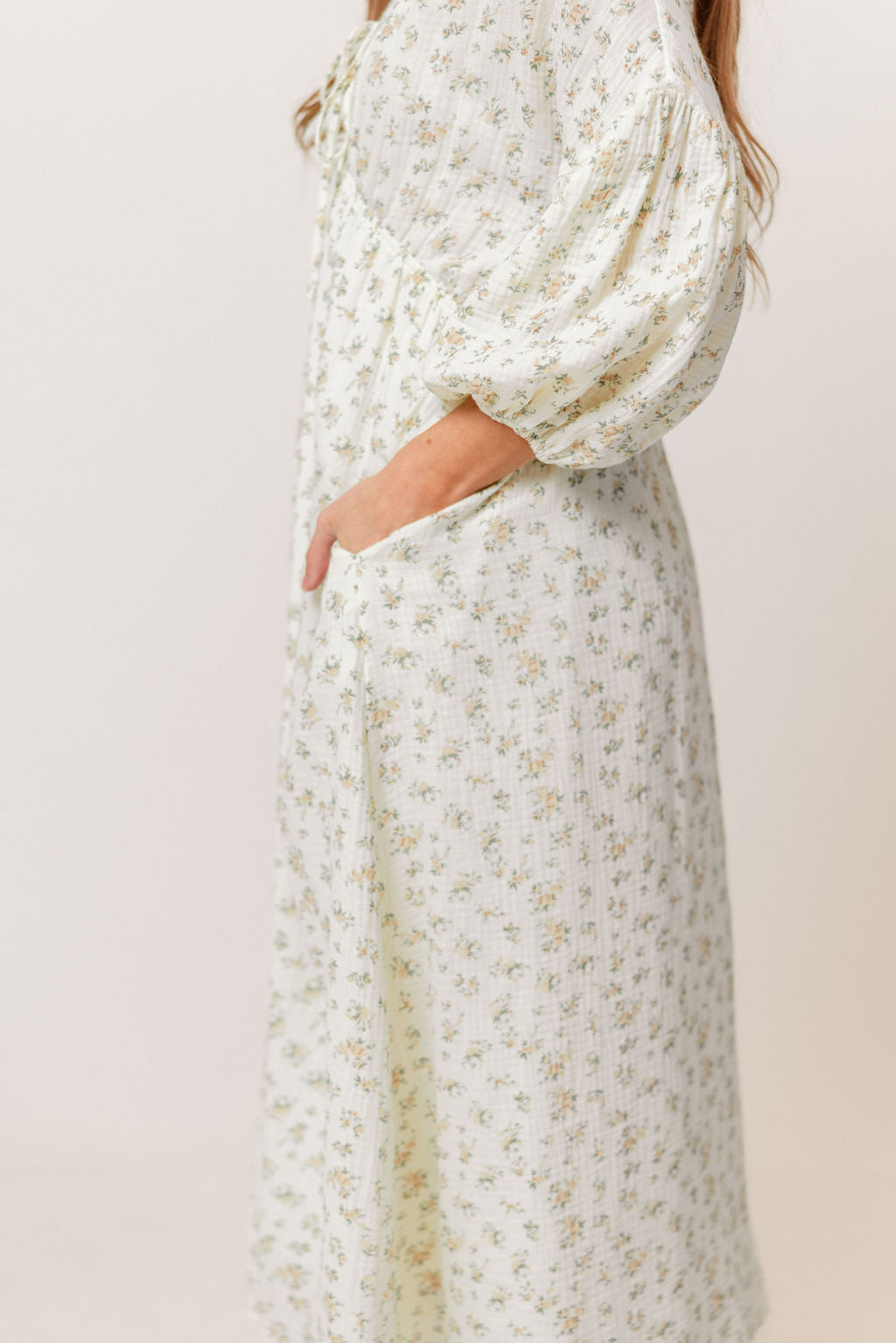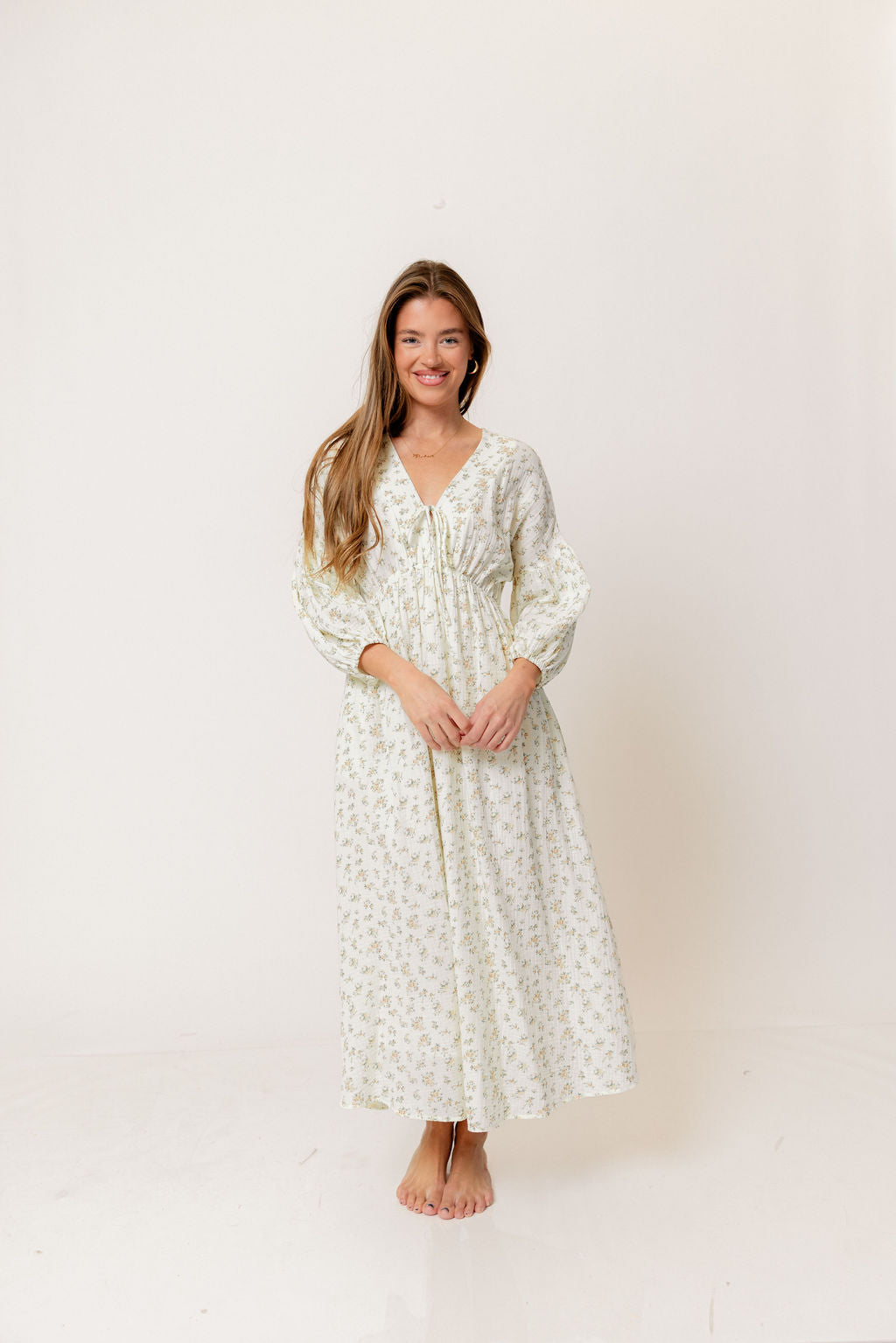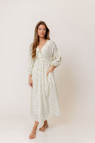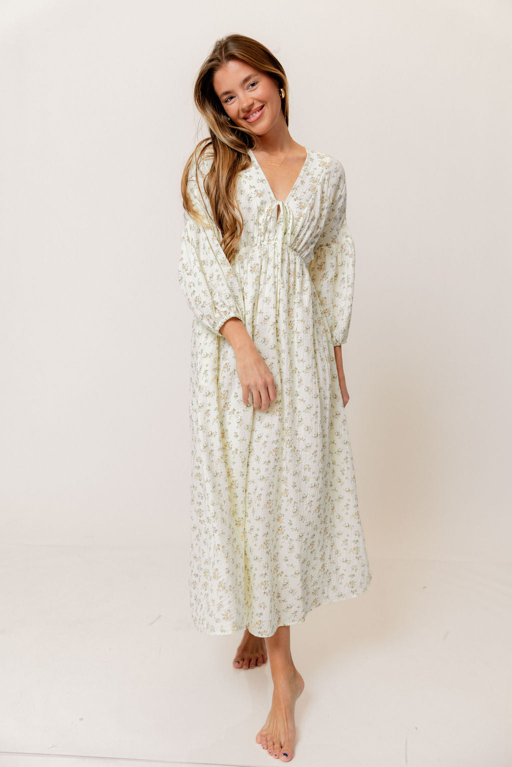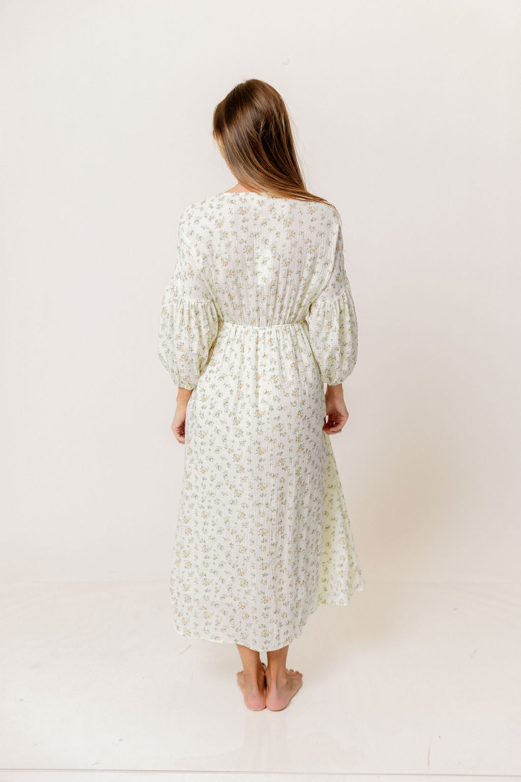 GARMENT DETAILS: Lightweight cotton gauze midi dress. Features V-neckline with self-tie detail, inverted empire waist, and full skirt with in-seam pockets. Finished with long balloon sleeves.
