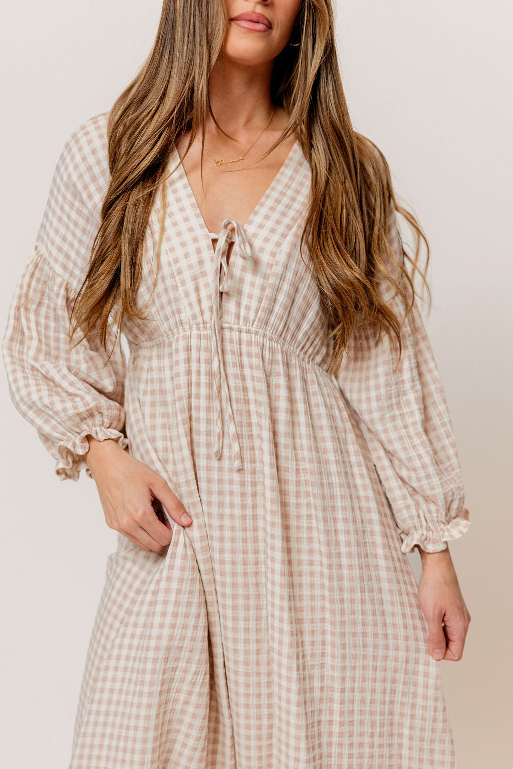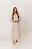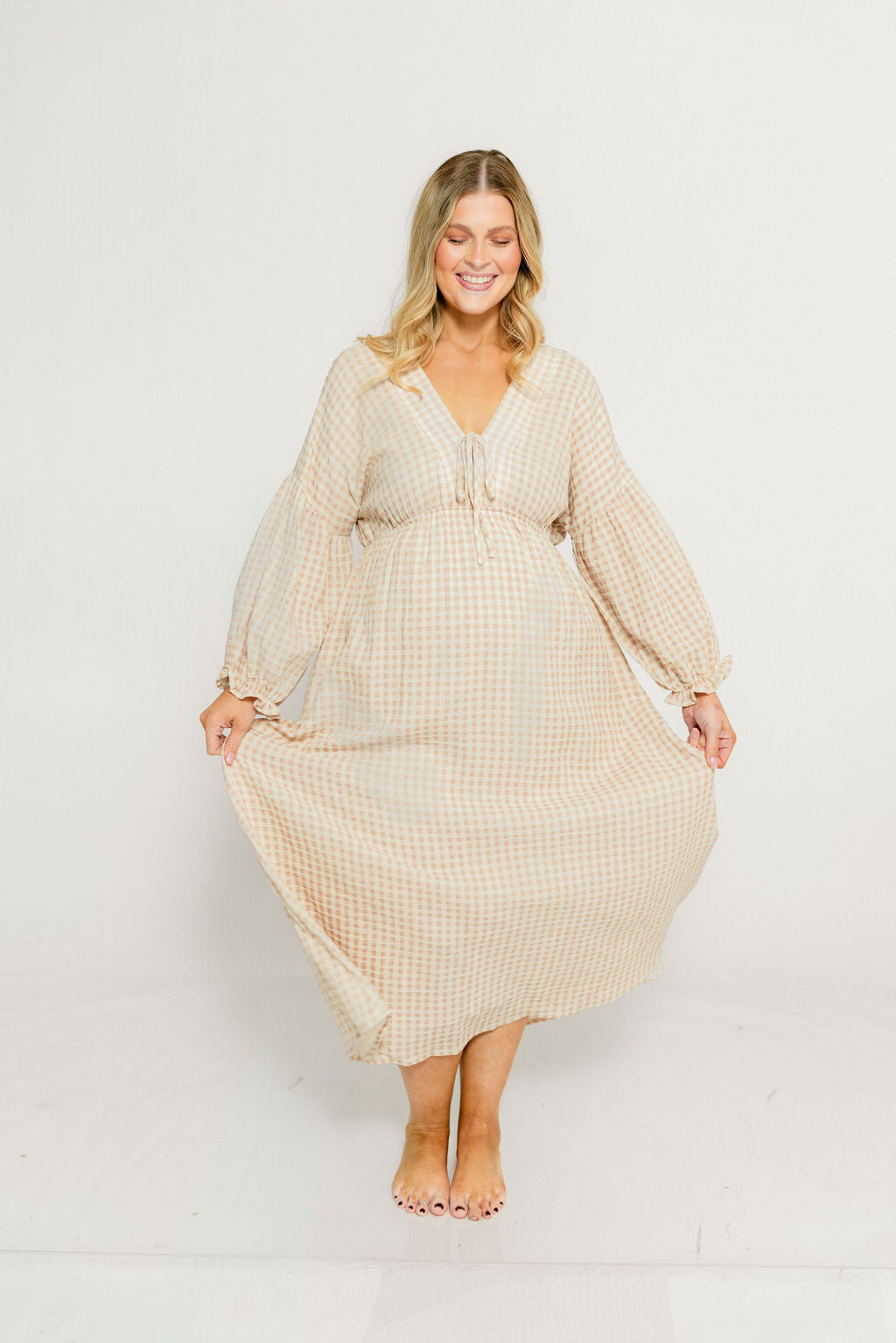 GARMENT DETAILS: Lightweight cotton gauze midi dress. Features V-neckline with self-tie detail, inverted empire waist, and full skirt with in-seam pockets. Finished with long balloon sleeves. This colorway is lined.
