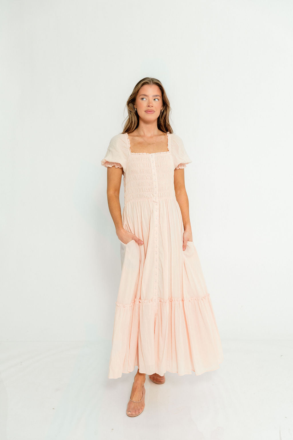 Mara Smocked Button Down Maxi Dress in Pastel Pink
