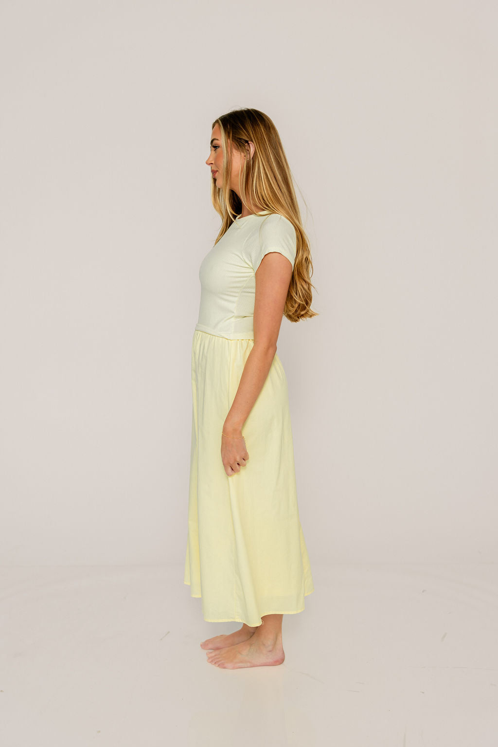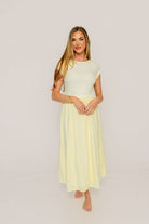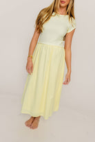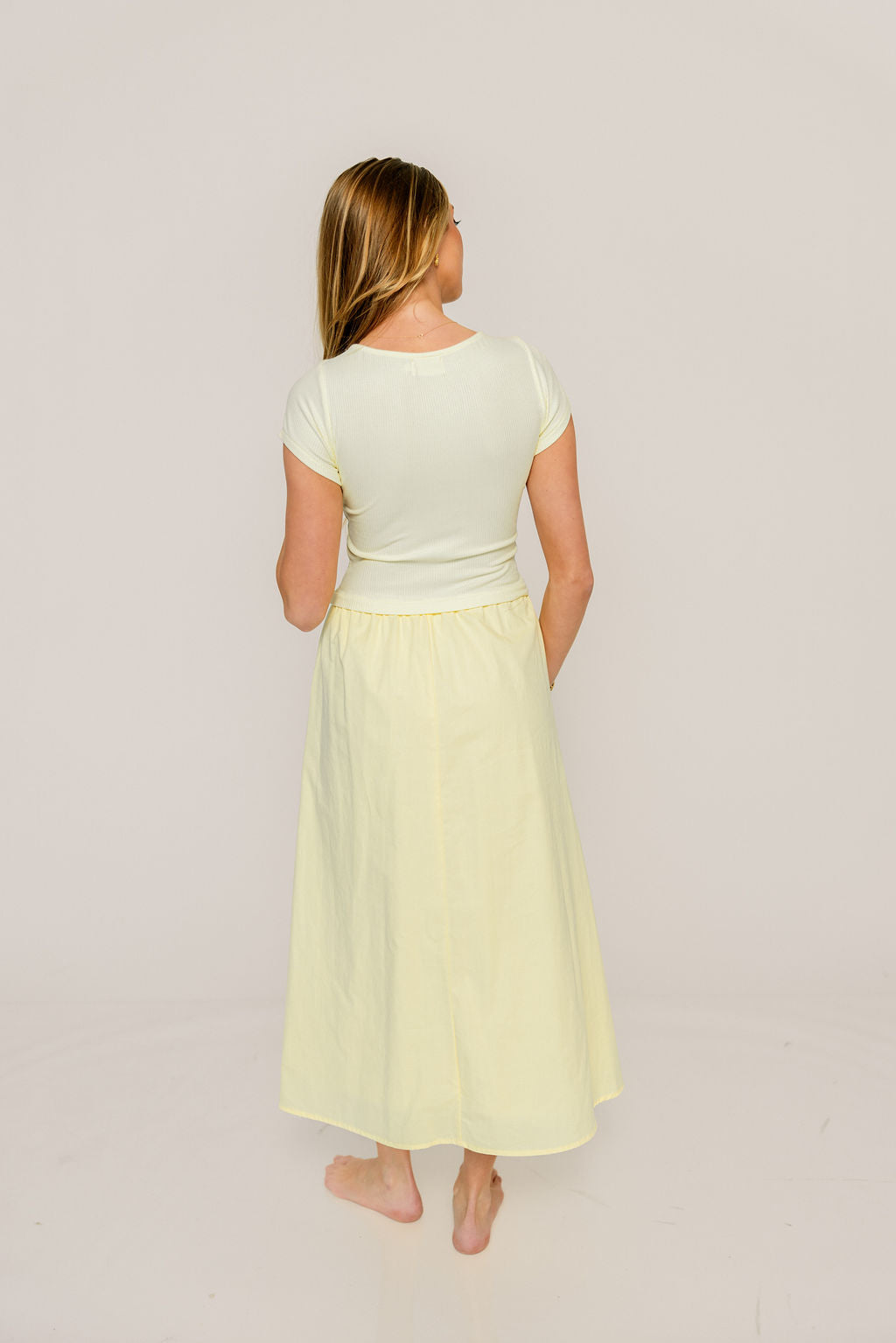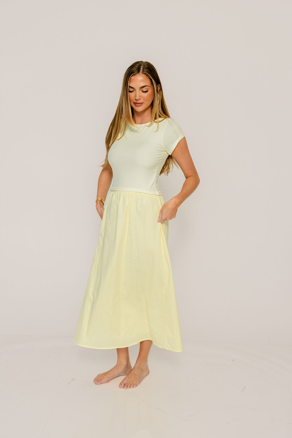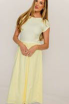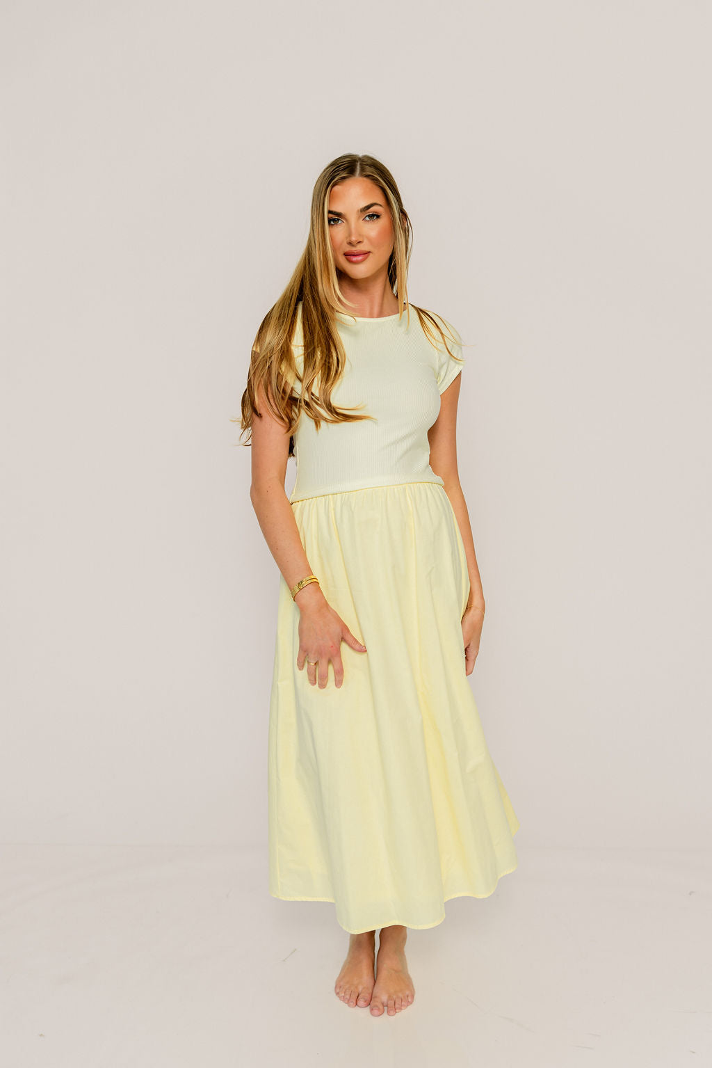 Elevate your everyday style with the new Romy Midi Dress! With its sophisticated mixed-media design and flattering silhouette, this charming yellow gown is effortless yet easy to dress up with your favorite heels and accessories.