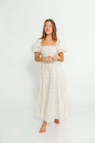 Meet our summer dream dress--the Tate Maxi! This beautiful silhouette offers a fitted, flattering bodice paired with a smocked back panel for comfort, plus a self-tie sash to cinch your waist and highlight those beautiful puffed sleeves. Best of all, this gown is crafted from premium 100% cotton materials, making it a versatile and sustainable styling choice!