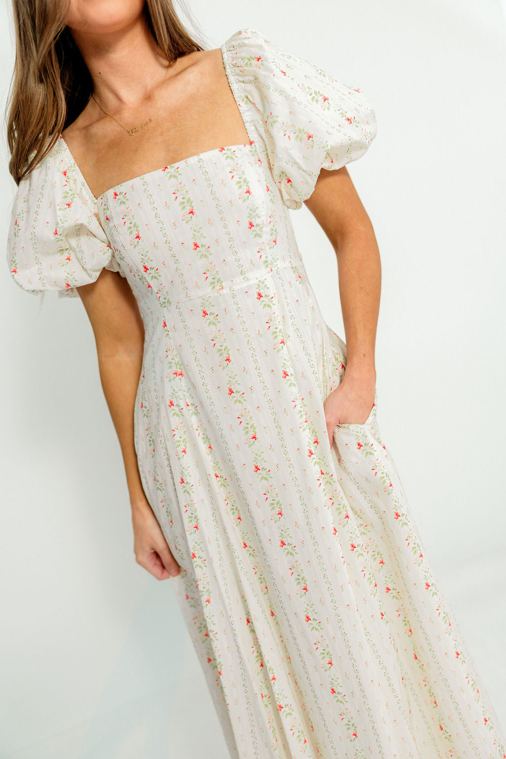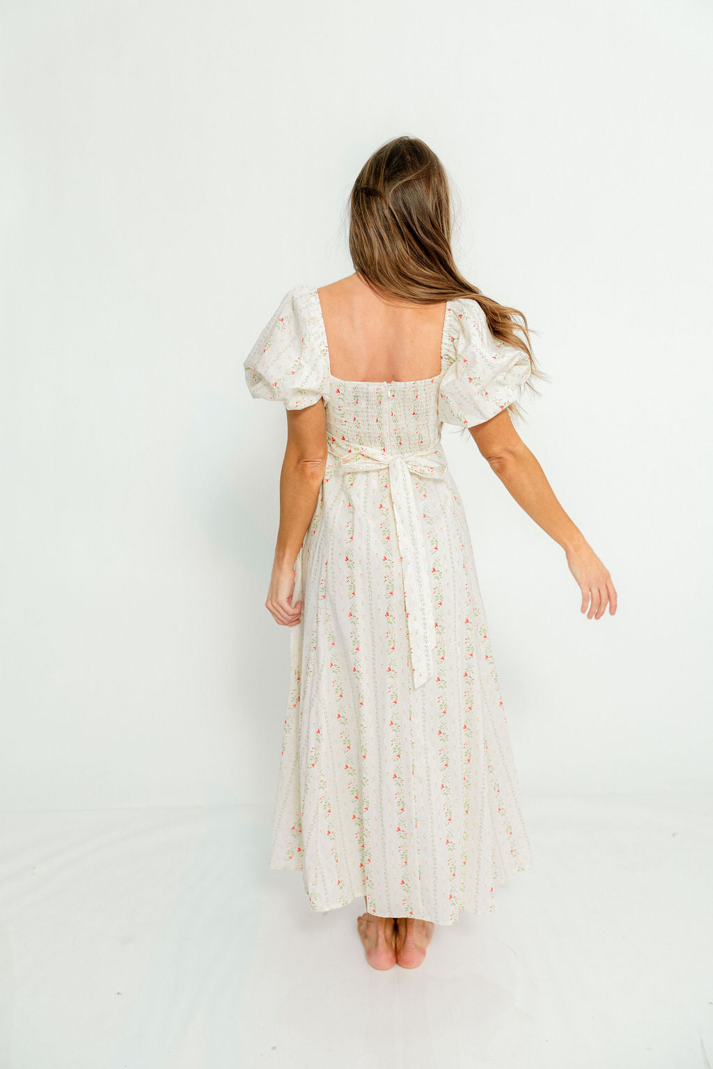 GARMENT DETAILS: Elegant cotton maxi dress with a fitted bodice, square neckline, and stretchy smocked back panel for comfort. Features statement puffed sleeves, attached self-tie sash, and dual side pockets. Finished with a flowy maxi-length skirt and hidden side zipper. Fully lined.