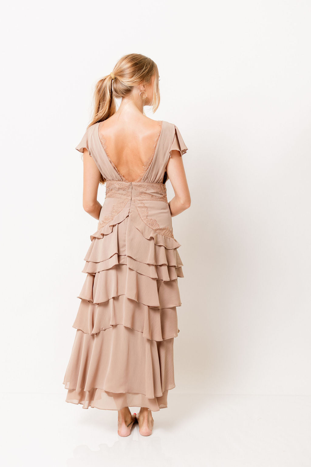 Have an extra-special event coming up? The Jessa Tiered Midi Dress is your must-have gown this season. Its silky mocha-hued ruffles and daring V-neckline offers a feminine and stylish outfit for that festive gala or fancy wedding you have on the calendar.