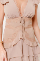 GARMENT DETAILS: Silky and glamorous midi dress with short ruffled sleeves, plunging V-neckline, and gathered waist with front tie detail. Features a flowy, multi-tiered ruffled skirt and delicate lace details.