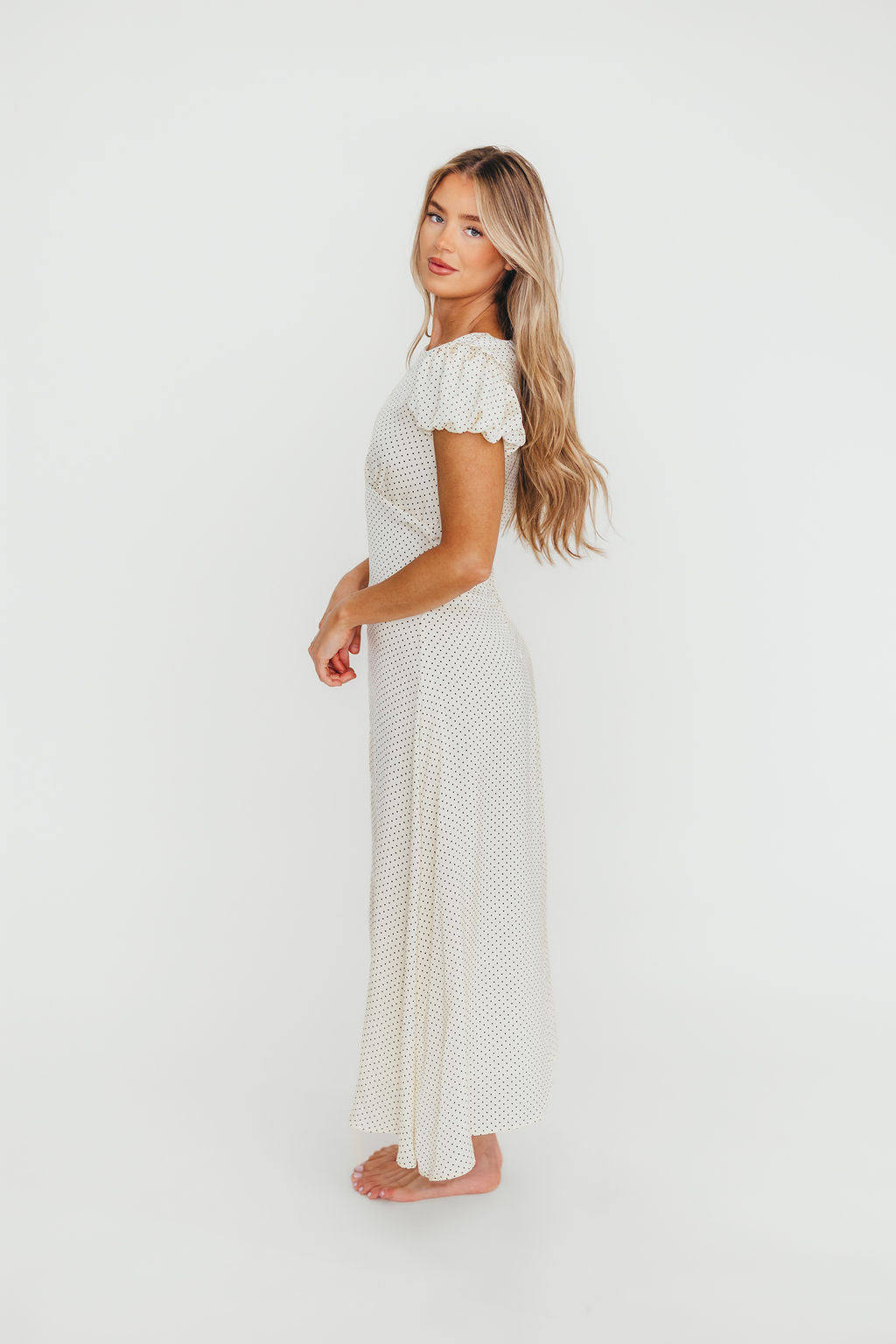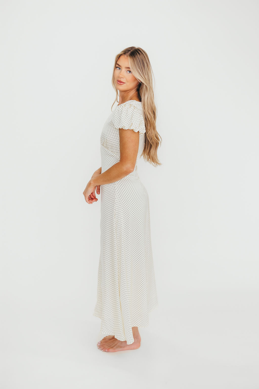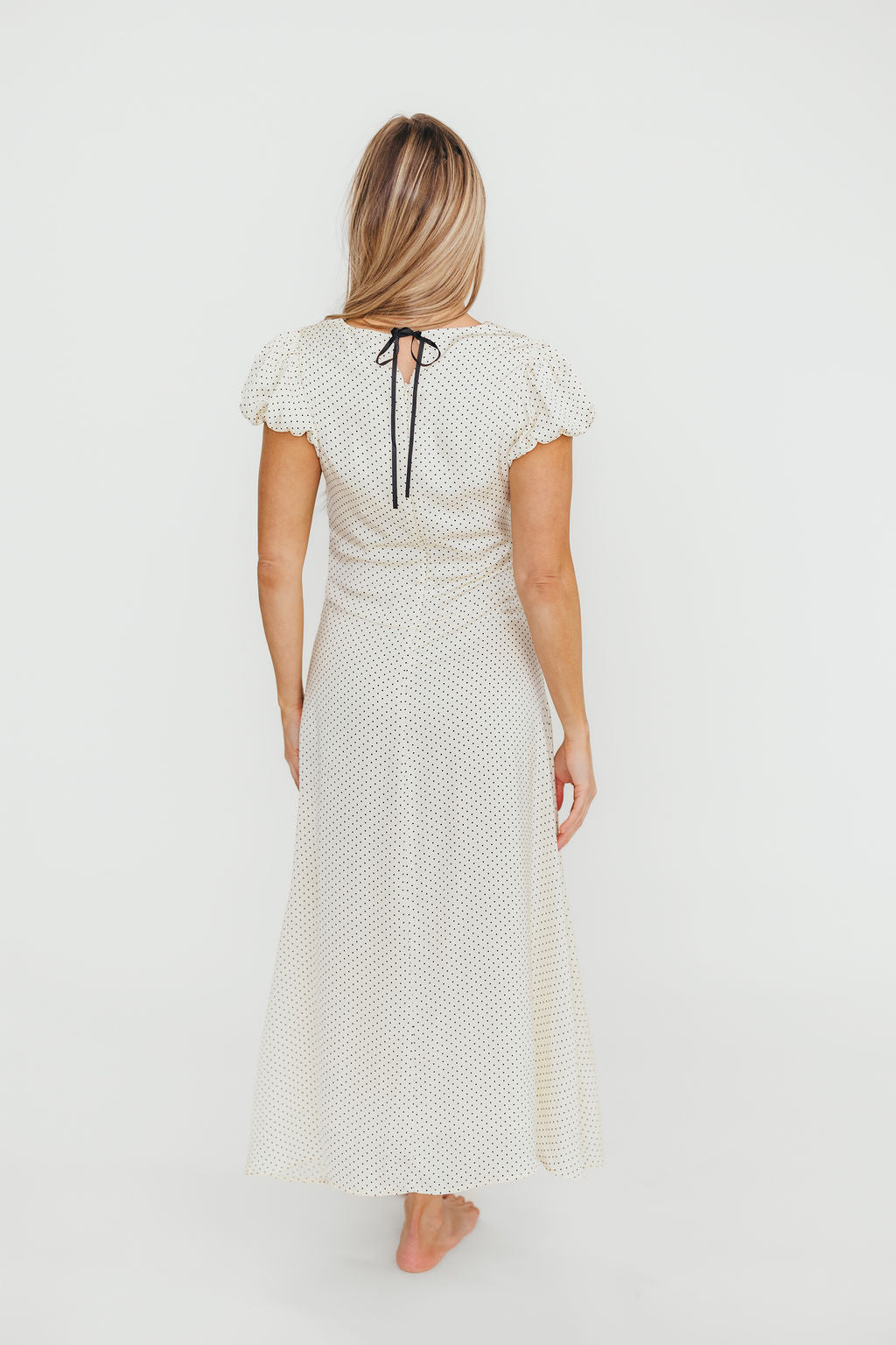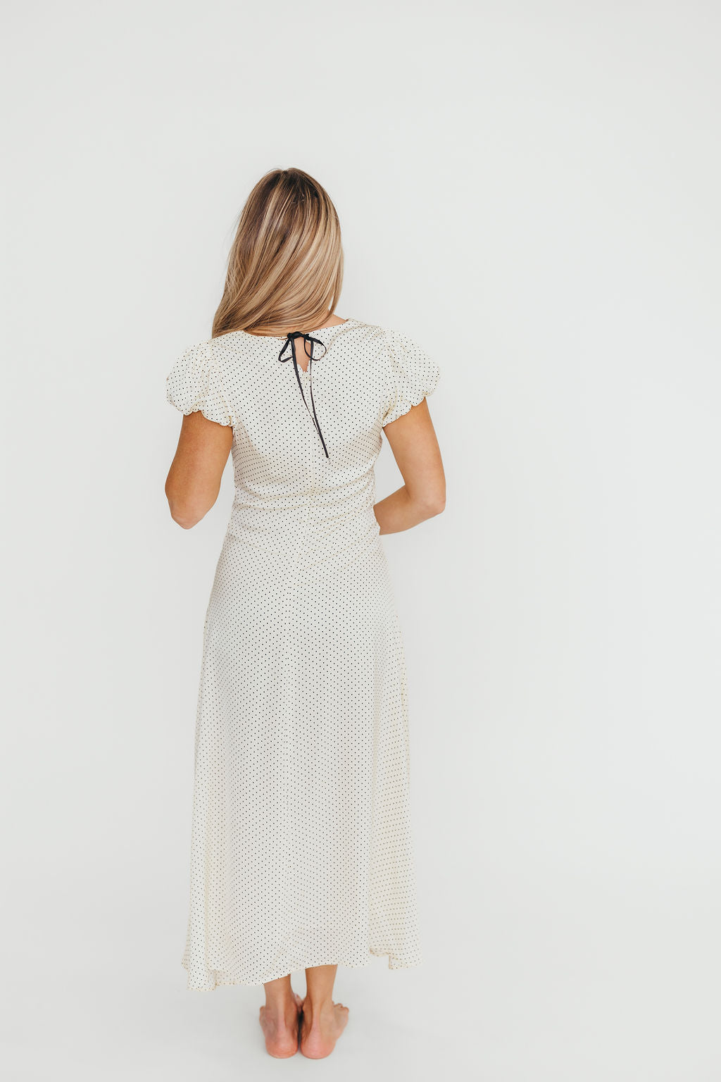 Get ready to wow in the Perla Dress! This elegant fit-and-flare dress offers an iconic pairing of black polka dots on an ivory background, with a feminine silhouette and comfortable midi length that makes it easy to dress up or down. The Perla will NEVER go out of style!