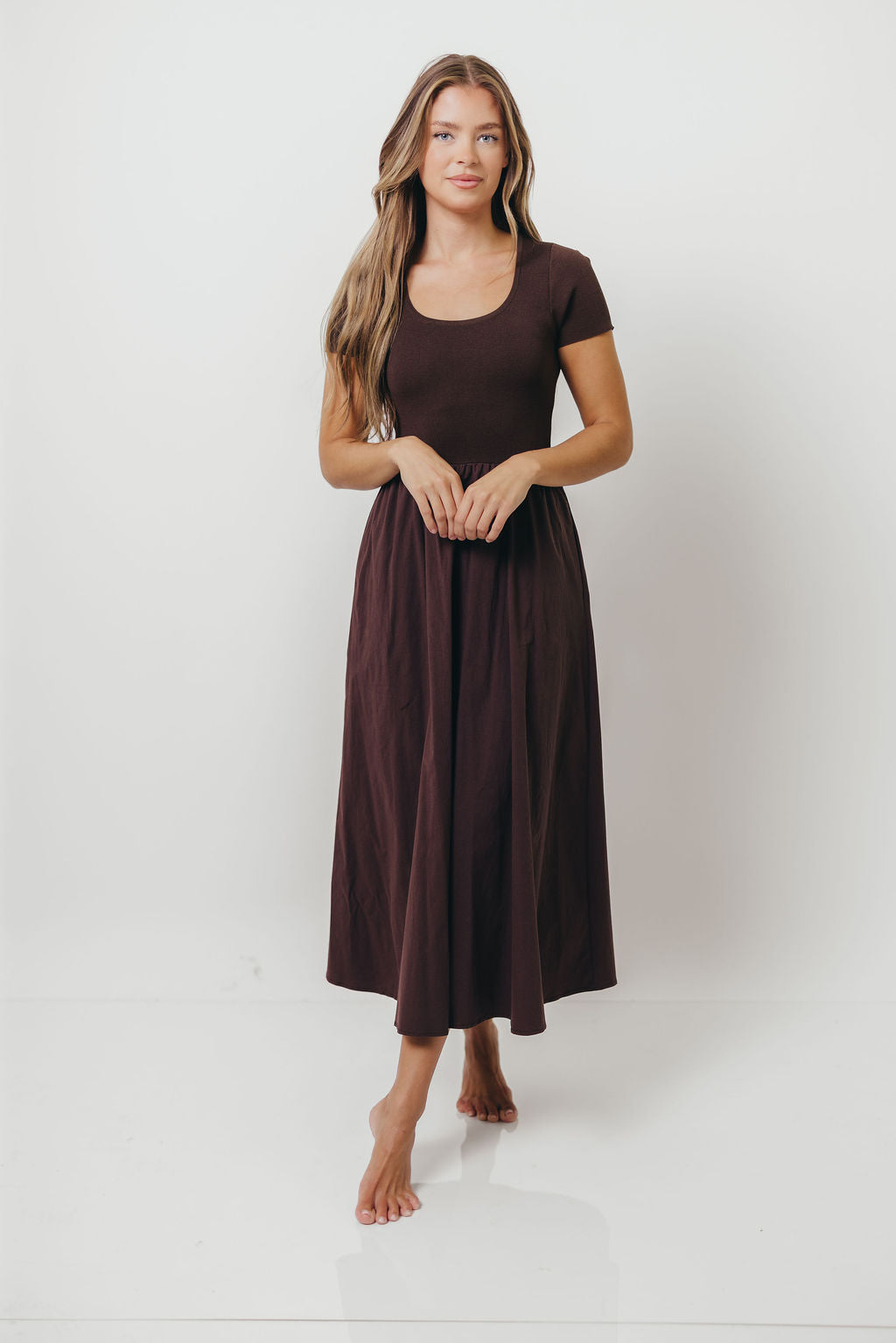 GARMENT DETAILS: Soft, elegant maxi dress with scooped neckline, short puffed sleeves, and a fitted, knit bodice. Finished with a flowy cotton poplin skirt.