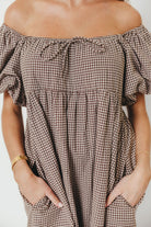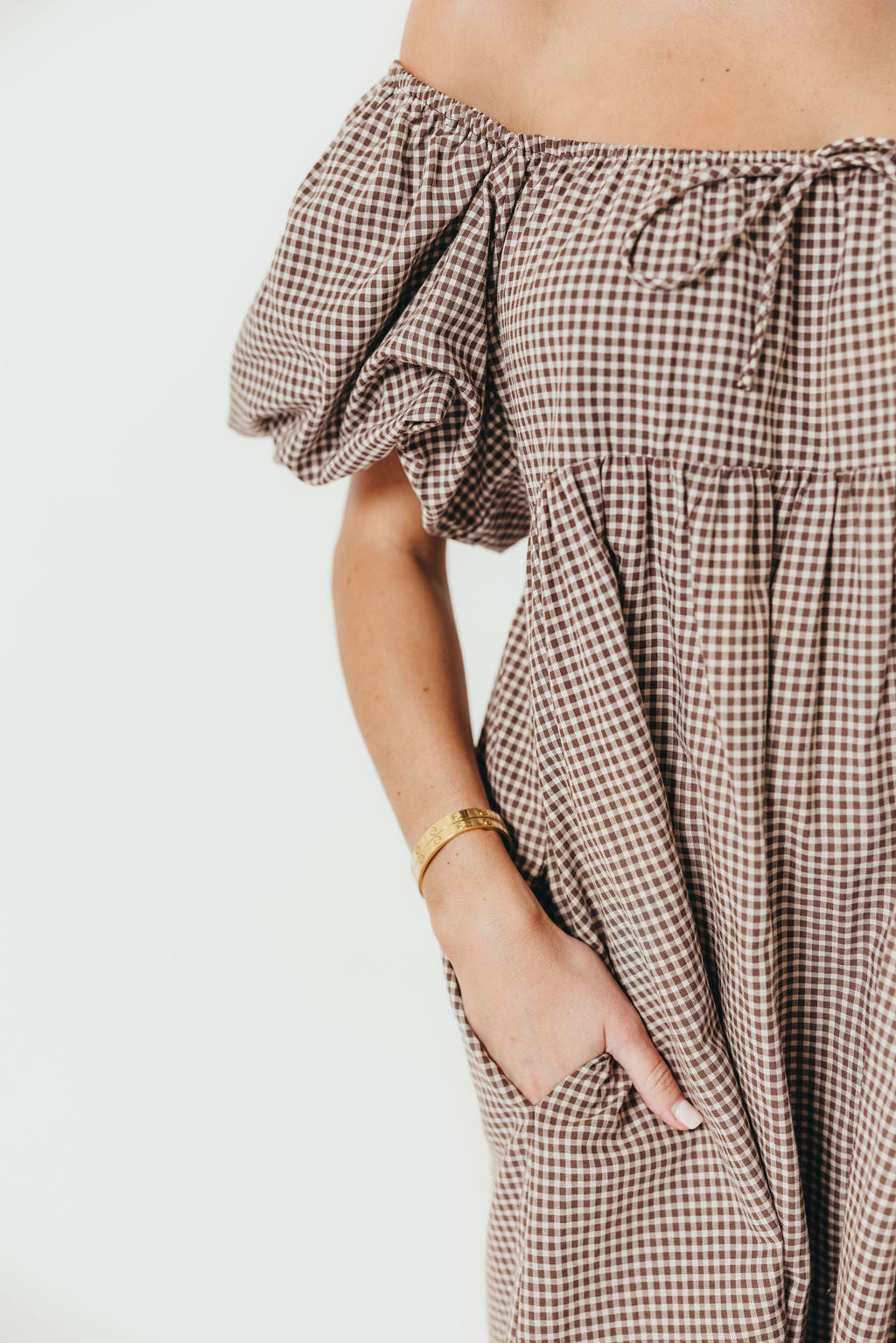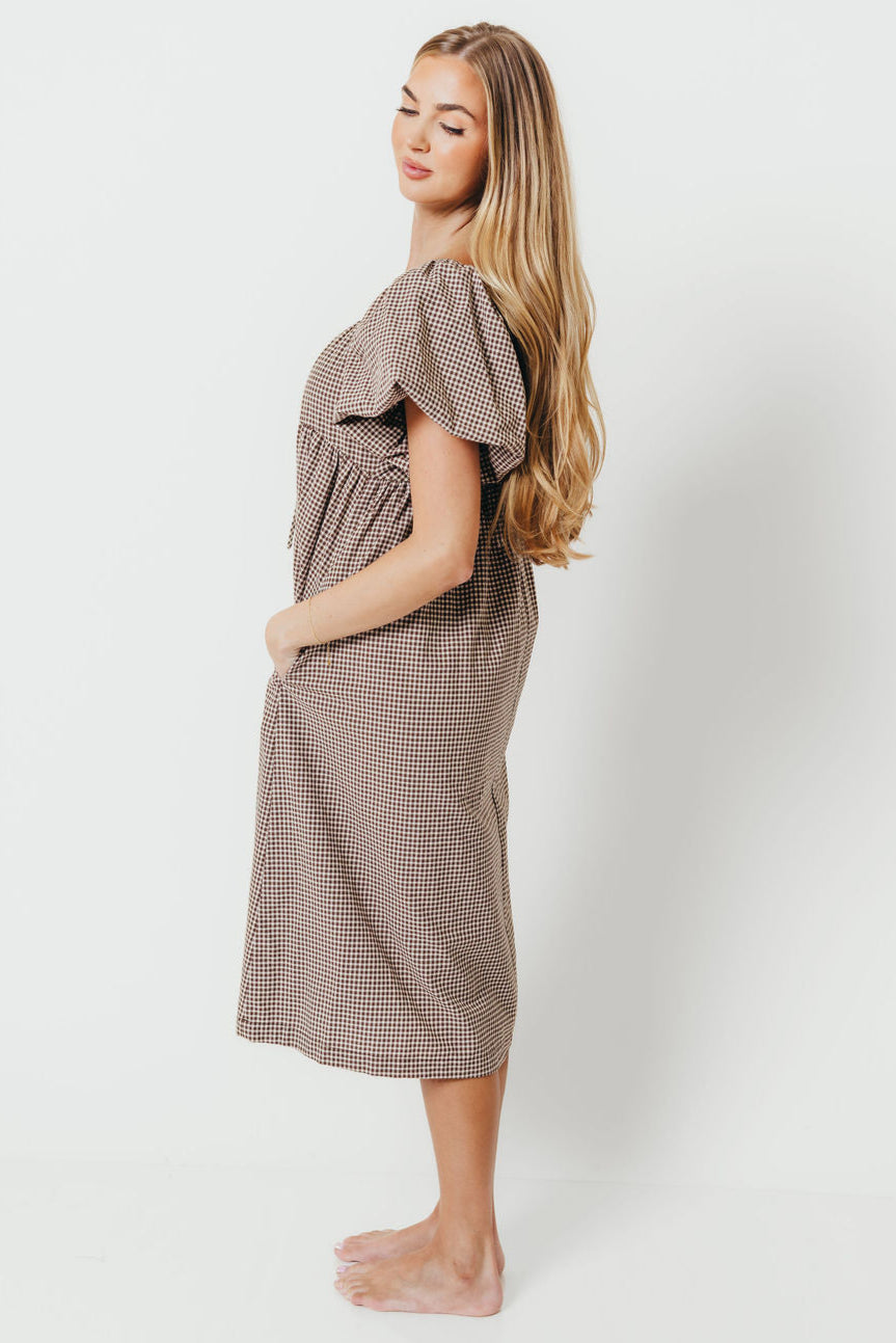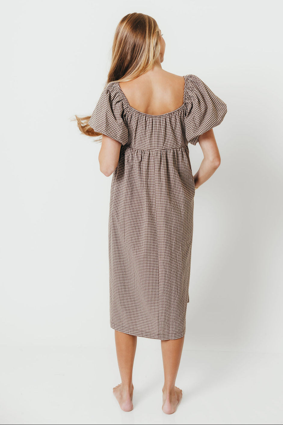 Evelyn Puff Sleeve Gingham Midi Dress in Brown